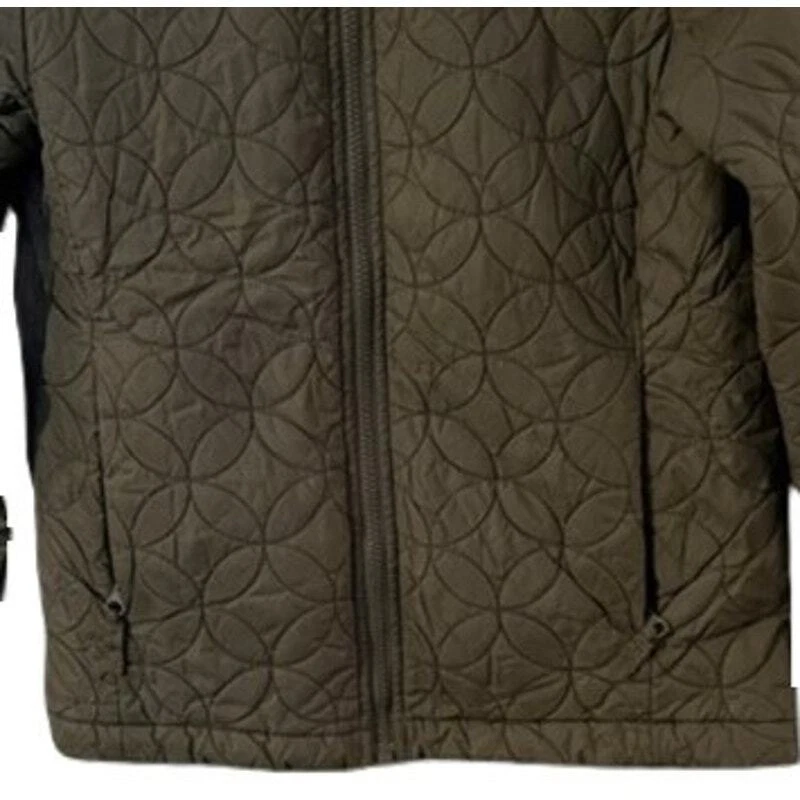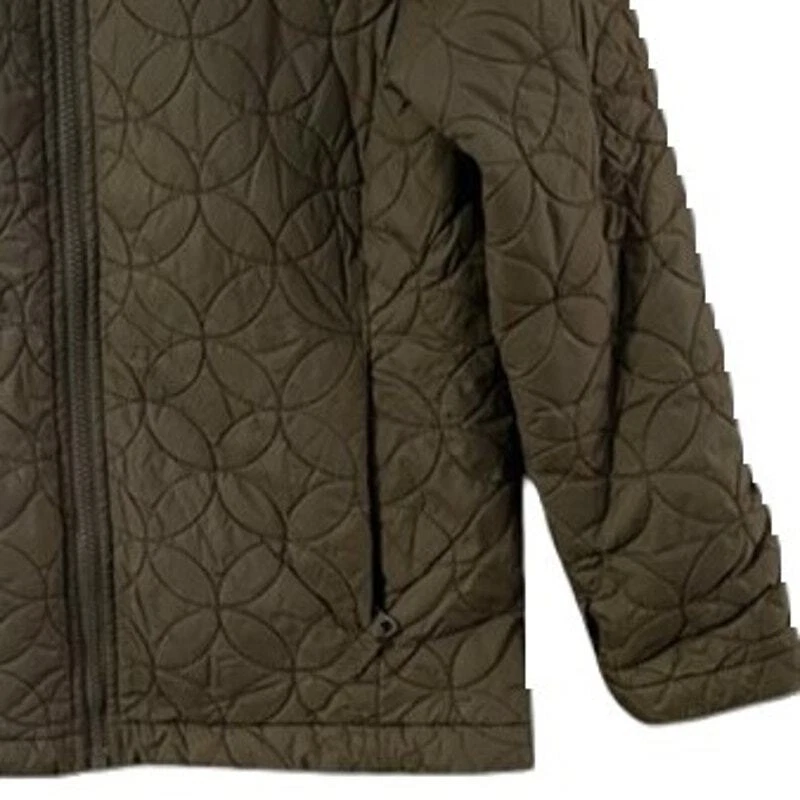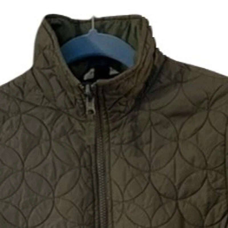 17" armpit to armpit 16" armpit to cuff 14" armpit to hem 23" shoulder to hem Lands' End softshell fabric type and quilted accents, short-length jacket zip front closure and long sleeves pockets made of nylon & polyester with a solid pattern color is a beautiful olive green ** all items stored in a smoke-free & pet free home