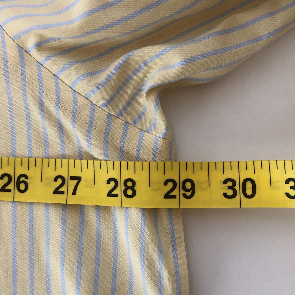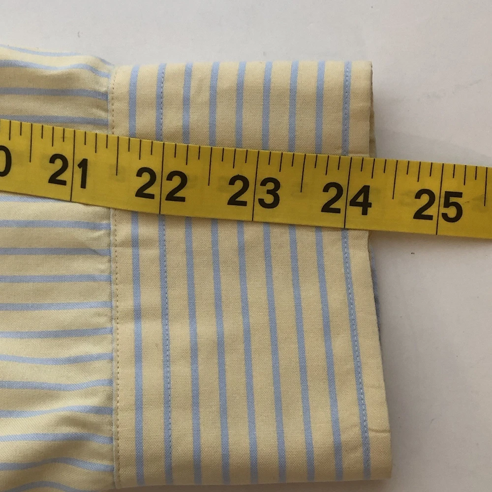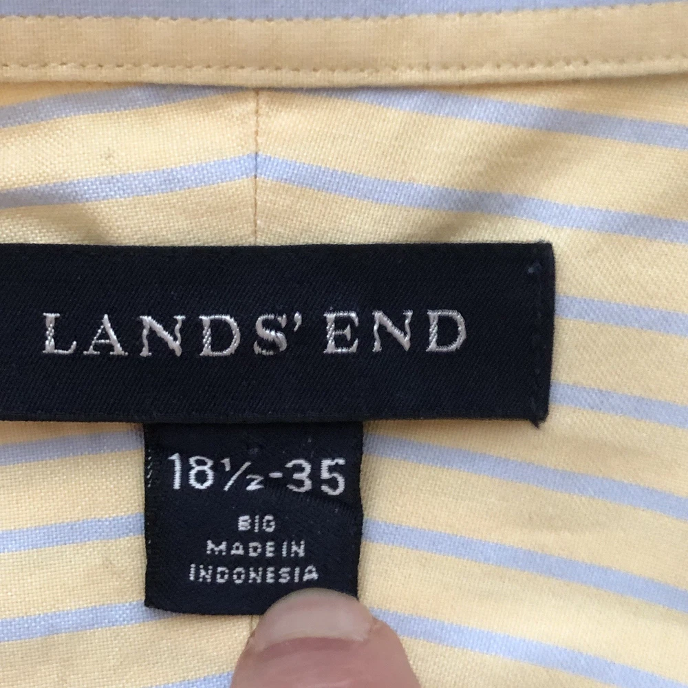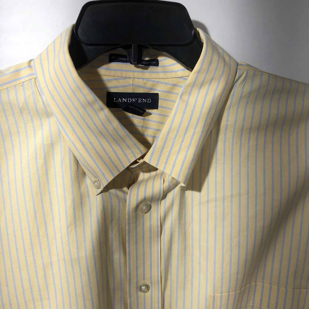 The Lands’ End Shirt No Iron Pinpoint Oxford is a classic and preppy men's dress shirt in size 18 1/2-35 Big Yellow Stripped. Made of 100% cotton with a woven fabric type, this shirt features a collared neckline, button closure, and long sleeves with a barrel cuff style. Perfect for travel, casual, or business occasions, this shirt is non-iron and has a chest pocket for added convenience. With its timeless design and quality construction, this Lands’ End shirt is a stylish and versatile addition to any man's wardrobe.