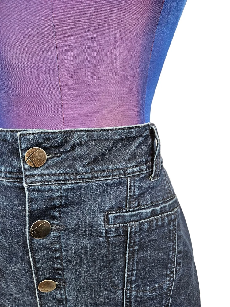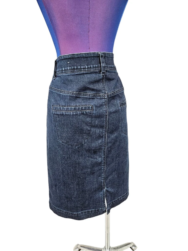 Lane Bryant Dark Wash Denim Button Front Midi Jean Skirt Size 14 Women's H26. In excellent condition Lane Bryant Dark Wash Denim Button Front Midi Jean Skirt Size 14 Women's. Features dark wash denim, button front, midi jean skirt, 4 faux pockets, front exposed seams, back slit, interior elastic waistband, belt loops. Measurements laying flat waist 17.5" hips 20" length 22" Fabric cotton, polyester, spandex This is a pre-owned item that may show signs of wear. In excellent condition, no flaws.