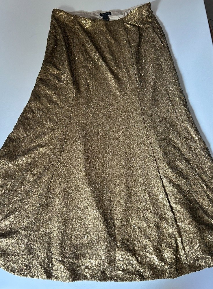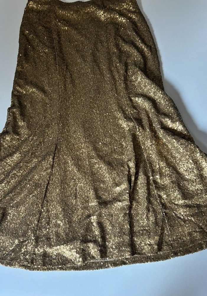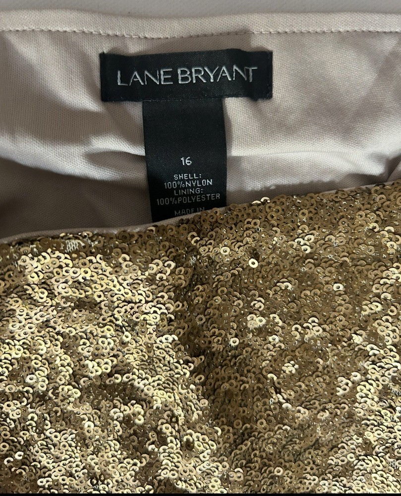 The Lane Bryant long gold sequin skirt in size 16 is a glamorous piece perfect for women looking to make a statement with their fashion. The sequins provide a metallic touch to the skirt, making it a standout piece in any wardrobe. The long length adds a touch of sophistication and elegance, making it suitable for various occasions from formal events to casual outings. The skirt is sure to turn heads and add a touch of sparkle to any outfit. It has stretch and is pull on Flat lay measurements 18 inches at waist 41 inches top to bottom Inv s22