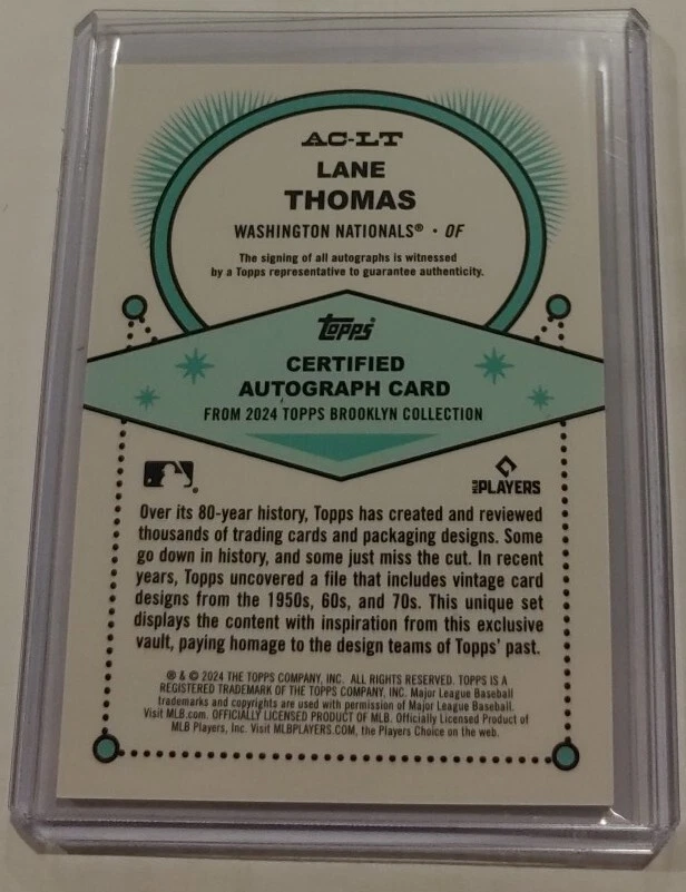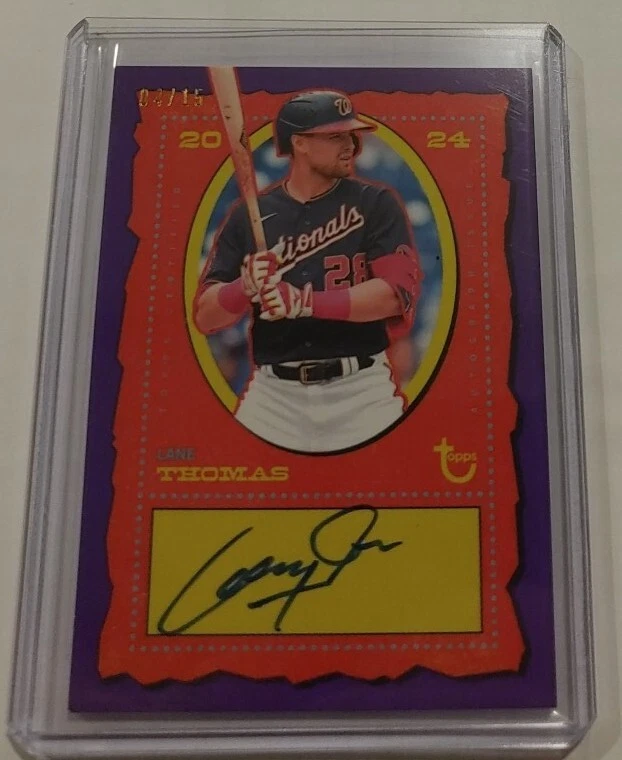 Capture a piece of baseball memorabilia with the Lane Thomas Purple Auto card from the 2024 Topps Brooklyn Collection. Representing the Washington Nationals, this card is a must-have for fans and collectors alike. With a limited print run of just /15, it's a rare addition to any collection. The card features a red parallel variety and includes Lane Thomas's autograph, adding a personal touch. As part of the Major League Baseball (MLB) trading card realm, it is manufactured by Topps and carries the card number AC-LT. Elevate your sports trading card portfolio with this exclusive piece from the 2024 season.