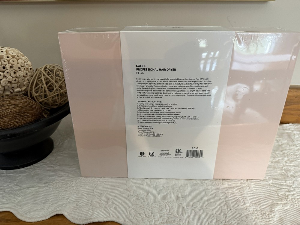 Up for sale is a brand new / factory-sealed L'ange Soleil Professional Hair Dryer in stylish Blush pink. This professional-grade hair dryer features a powerful 1875 W motor, multiple heat and airflow settings , cool shot button , and negative-ion technology for smoother, frizz-free results perfect for fast drying and salon-style blowouts at home.