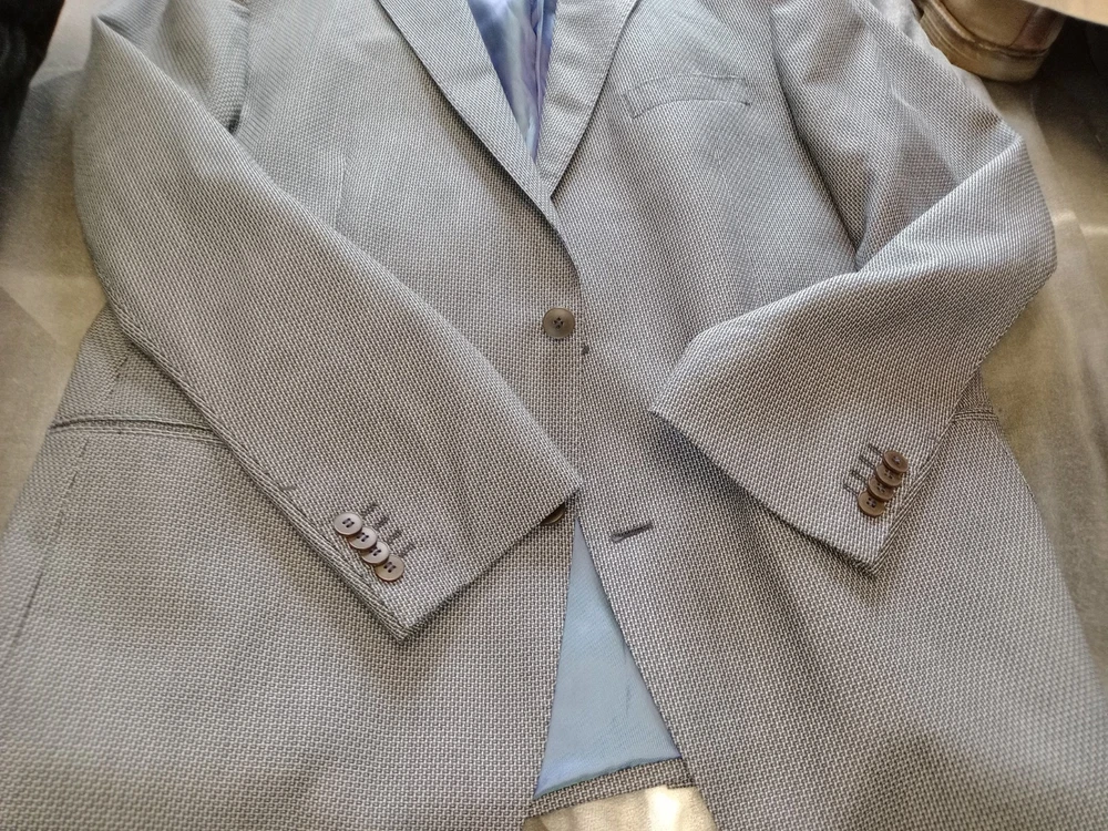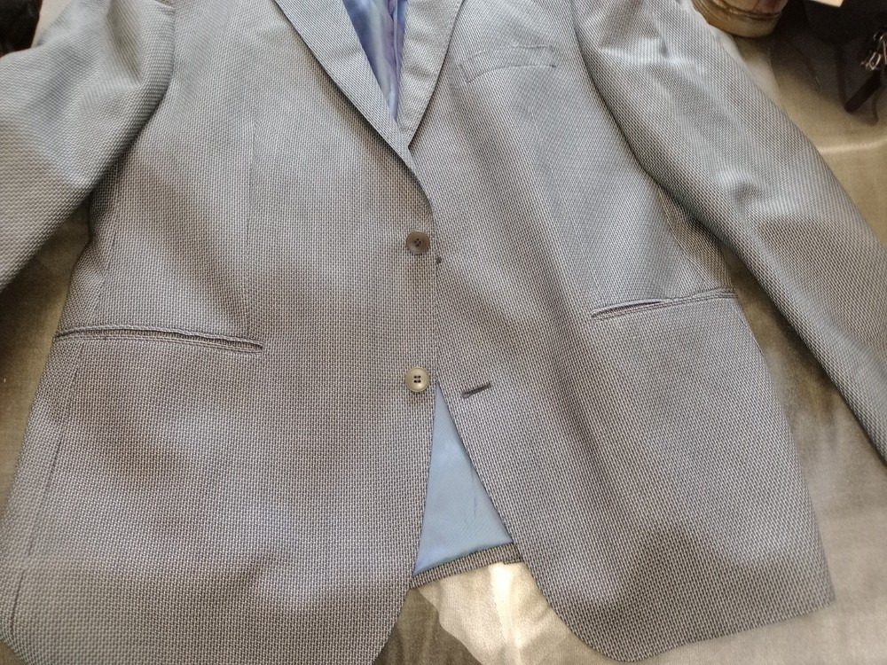 Lanificio campore collezioni mens blazer jacket 44S blue black check, two working front pockets, inner pockets, virgin wool tweed, excellent condition throughout 31 inches in length and 24 inches arm length