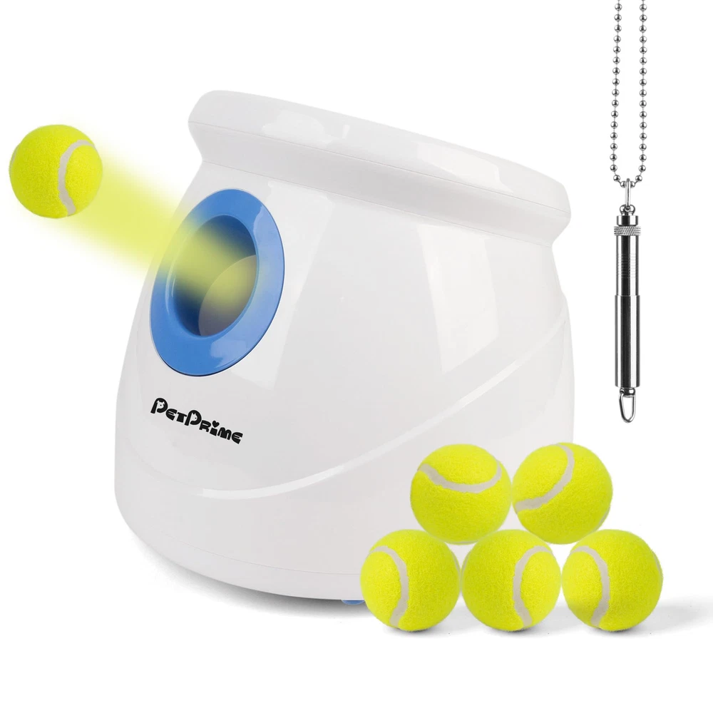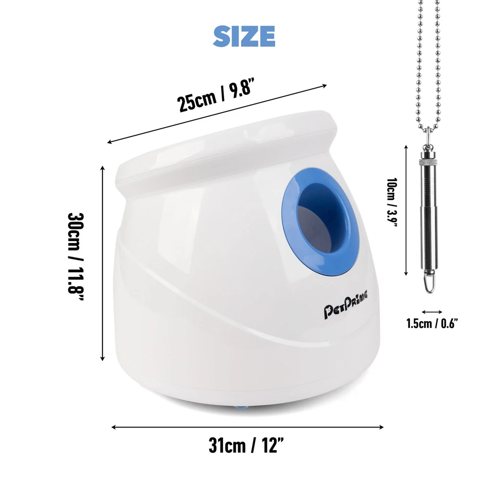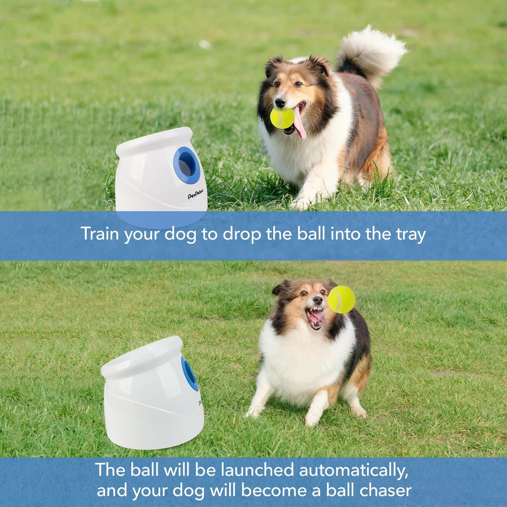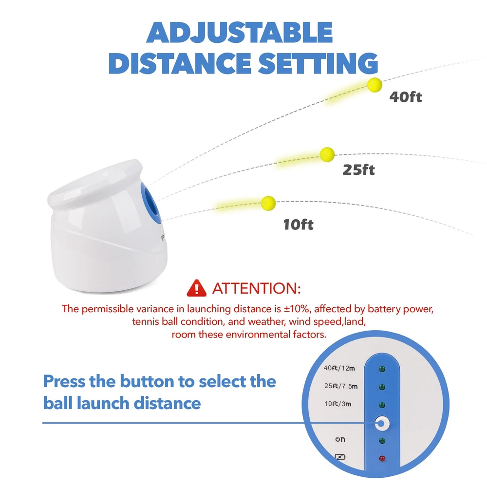 The Ultimate self throwing ball machine for dogs: Keep your furry friend entertained and active with our auto ball thrower for dogs. Perfect for indoor and outdoor play, this dog fetch ball thrower is your dog's new best friend Adjustable Launch Distance: Choose from 3 different launch distances (approximately 10ft, 25ft, or 40ft) to suit your dog's needs.Attention:Please fully recharge the battery before first use Permissible variance in launching distance: Plus or minus 10%, affected by battery power, tennis ball condition, and weather, wind speed,land,room these environmental factors Fun and Exercise: Our ball thrower for dogs is the perfect way to play and train with your dog. It's a great way to release energy, improve your dog's IQ, and reduce obesity Complete Set: Our package includes 1 dog ball launcher, 1 AC adapter, 6 tennis balls (2.5''), and 1 instruction manual. The tennis ball thrower for dogs is easy to operate and can be recharged. Product Size: 12''x11.8''x9.8'' Please always inspect the ball shooter for dogs' tube for cleanliness, clear any debris from the motor, and check for wetness or standing water on the dog fetch machine Attention: When you receive the product and find missing accessories,please let us know,we will send the accessories to you immediately; or If you have any issues with your purchase, please let us know and we'll be happy to help