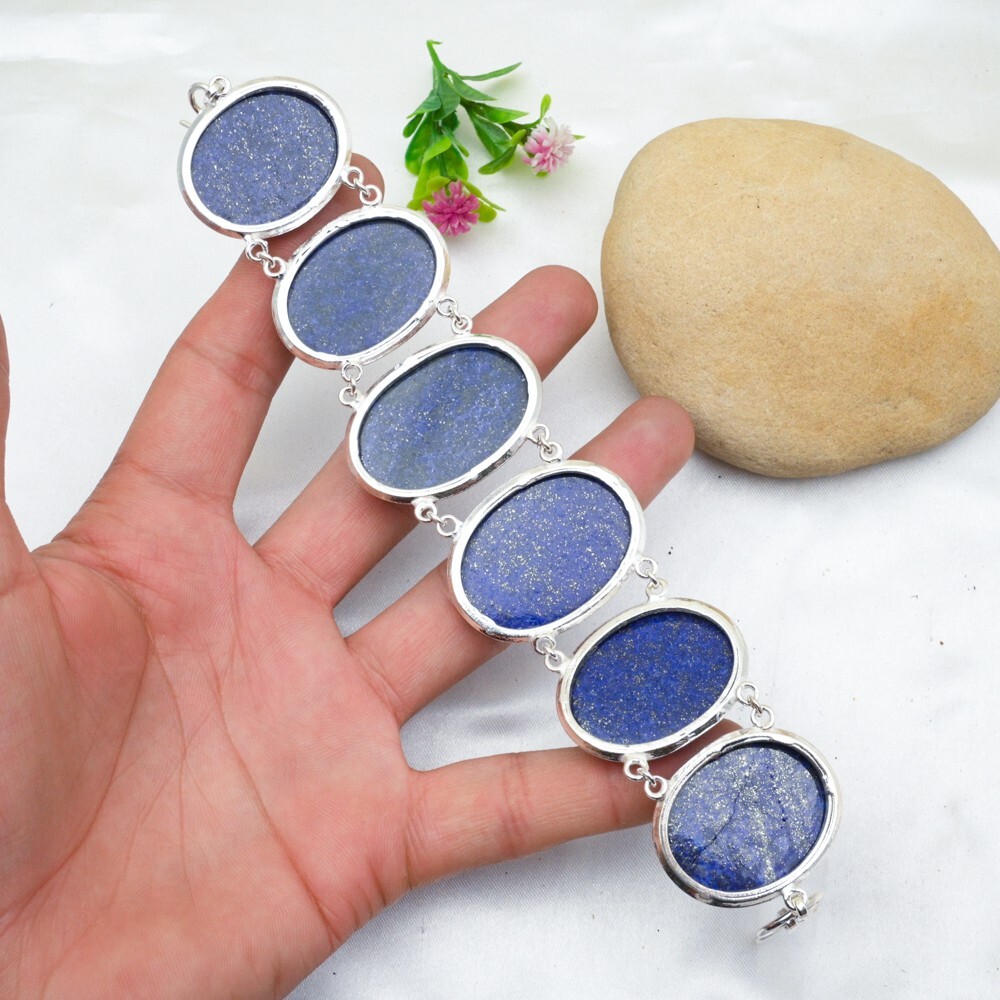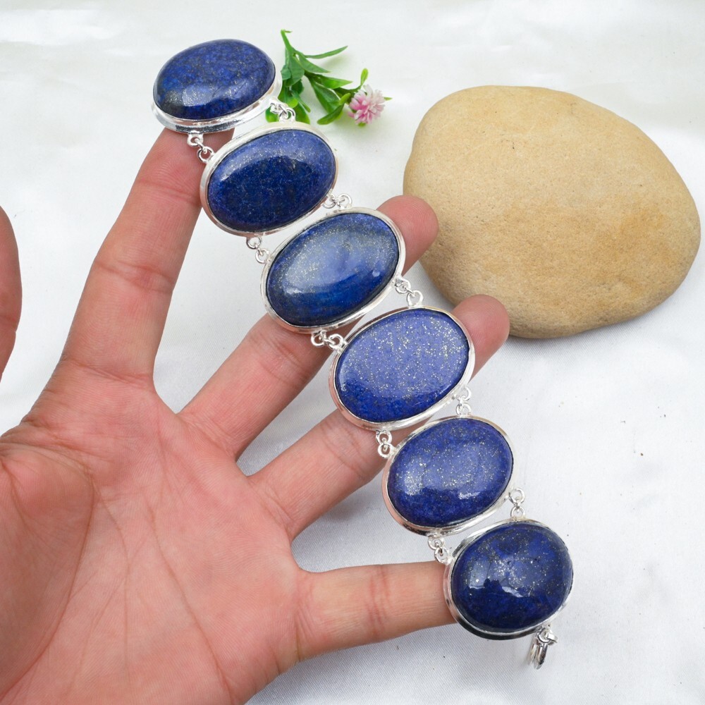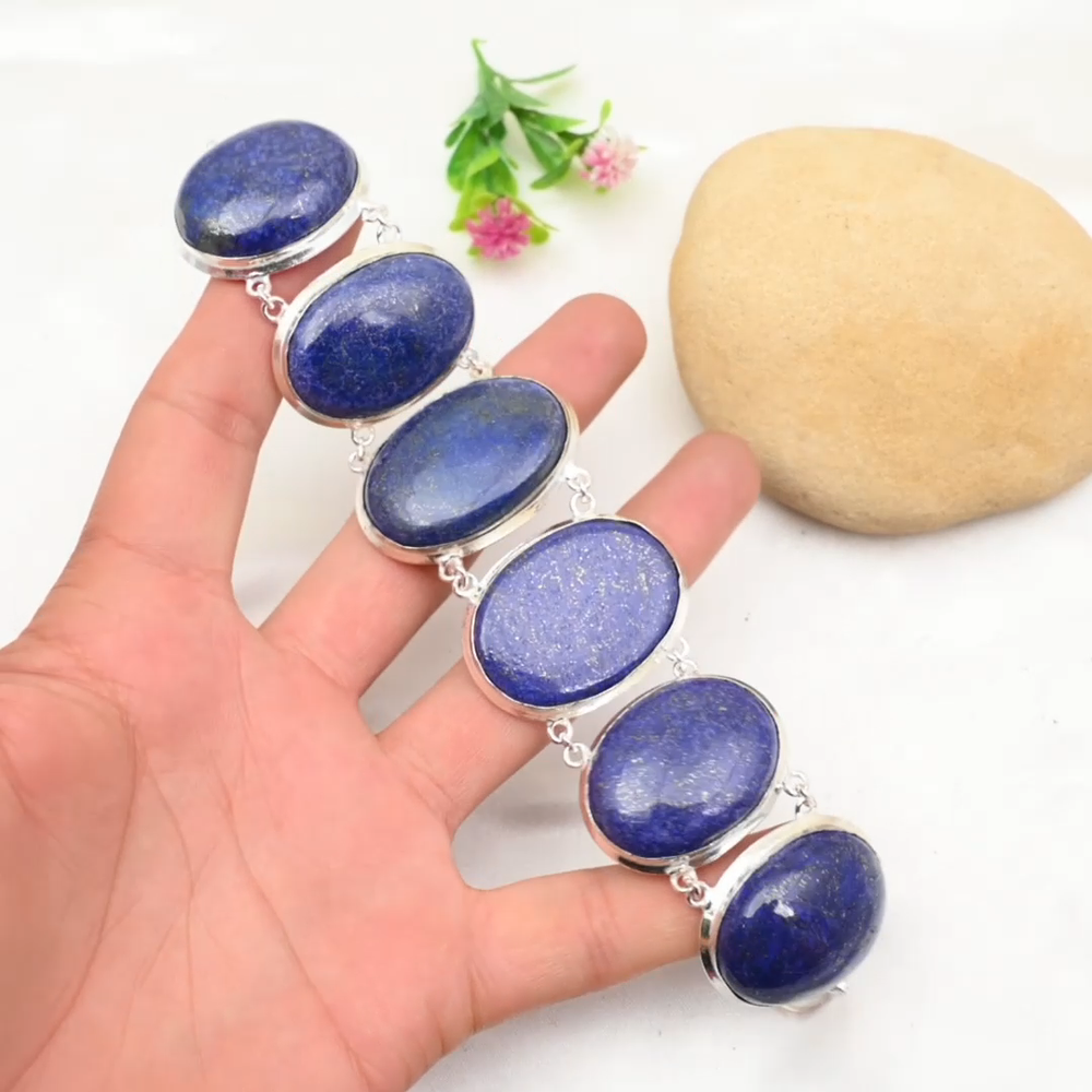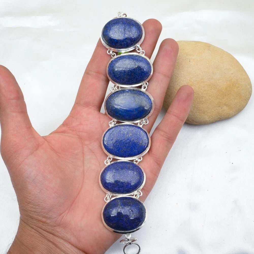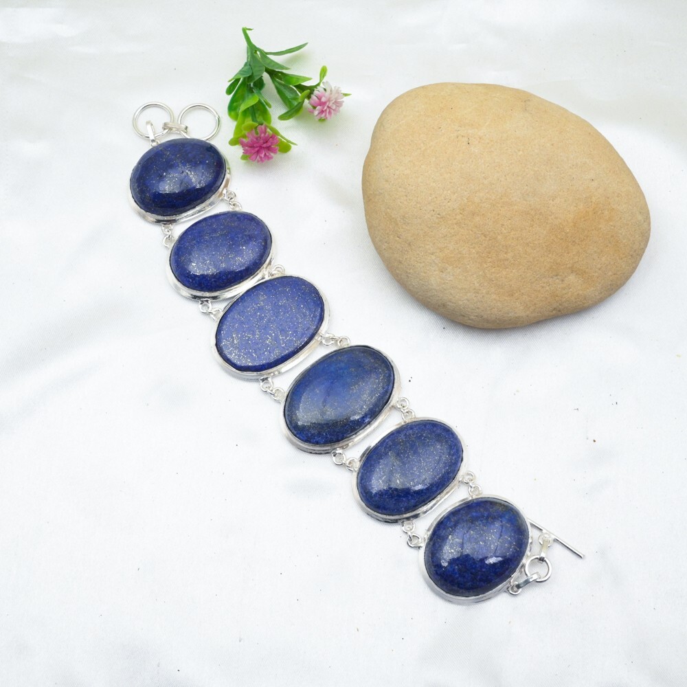 Material:GemstoneColor:SilverColored Diamond Intensity:N/AShape:Same As PictureMetal Purity:925Main Stone Width:N/ABase Metal:Sterling SilverOccasion:Anniversary, Birthday, Christmas, Engagement, Mother's Day, Valentine's Day, WeddingMain Stone Length:N/ACharm Type:Same As PictureChain Type:N/AFeatures:AdjustableDiamond Clarity Grade:N/ACountry/Region of Manufacture:IndiaNumber of Diamonds:N/AMain Stone Depth:N/AStyle:ChainTotal Carat Weight:10 carat and aboveMain Stone Treatment:Not EnhancedSetting Style:BezelMain Stone Shape:OvalTheme:Beauty, Bohemian, Ethnic, Halloween, LoveMetal:Sterling SilverCollection:HandmadeCountry of Origin:IndiaBrand:HandmadeItem Length:8 inches with Adjustable ChainCertification:N/AType:BraceletCut Grade:ExcellentDiamond Color Grade:N/ASecondary Stone:Lapis LazuliMain Stone Creation:NaturalNumber of Gemstones:6Closure:ToggleMain Stone:Lapis LazuliMain Stone Color:Blue
