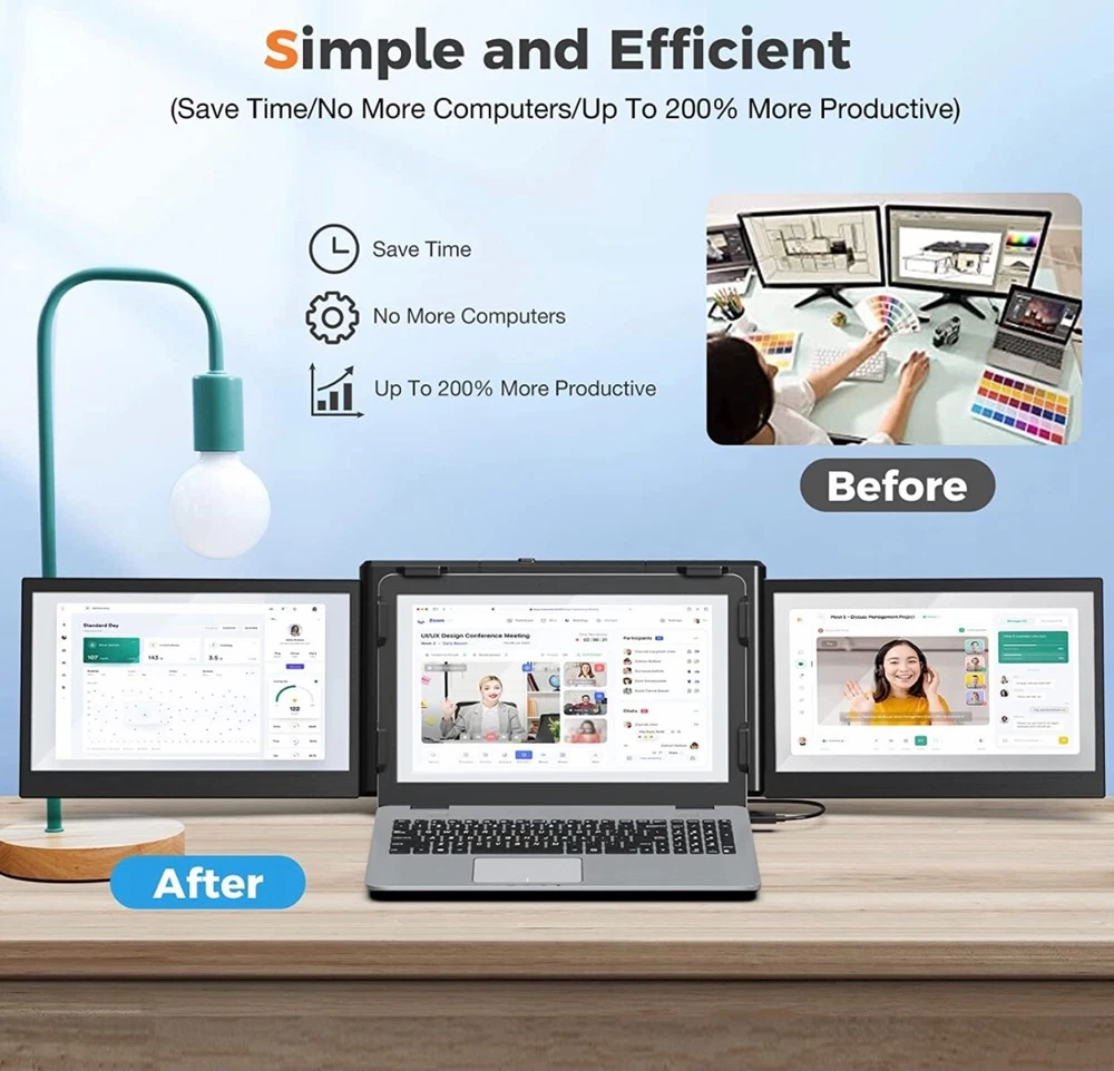 - Brand New - Never Used - Questions: Feel free to ask any Questions - BOX: Never Opened - DESCRIPTION: • 【2023 New Upgrade Version】 Are you still troubled by frequent page switching? KWUMSY triple screen laptop monitor will increase your office efficiency by 300%. This dual-screen monitor supports extenders to your laptop and gets two additional screens at the same time, which means you can work on spreadsheets, video conferencing, stock analysis, gaming, and more at the same time. Enjoying three screens individually or simultaneously. * 【Increase Viewing Comfort】KWUMSY portable laptop monitor is equipped with a high-quality 12-inch full HD 1080P IPS panel, with excellent viewing angle and eye protection features, with a blue light filter, anti-glare technology and brightness-adjustable function to prevent long-term eye fatigue, and also for users Provides a rich and colourful visual experience. * 【WINDOWS SYSTEM LAPTOP】 Designed for Windows systems, to support 13.3-16.5 inch laptops (diagonal length). 1 screen to 3 screens, easy to achieve 3 screens with mirrored and extended mode. At the same time, either side of the screen can be turned off, and only one of the screens can be used. Besides, this monitor can be folded which is super easy to carry and fits easily into briefcases, and backpacks. * 【Multi-display Mode】 Designed for multi-using scenarios, the full 207°rotation and 180°display mode can achieve multi-person meeting by same-screen sharing, And there are multiple display modes, including landscape, portrait, presentation, kickstand and eye-care modes. Portable triple monitor for laptop has an adjustable scalable bracket to keep stability, avoid screen shaking, instability and tilting when using the display. - OFFERS: Reasonable offers are considered, LOWBALLERS, Best price and Lowest askers will be ignored - all sales final/no refunds/ no exchanges/ no returns - Disclaimer: I do not own the brand's trademarks, logos, pictures, or products posted. I do not intend to infringe on copyright. I find such content available on the internet. Contents are considered fair use. -12'' Laptop Monitor Extender, Portable Monitor for Laptop, [2023] 1080P Full HD IPS Laptop Screen Extender, Plug and Play No Driver, for 13.3”-16.5” Laptop (P2S-Windows)