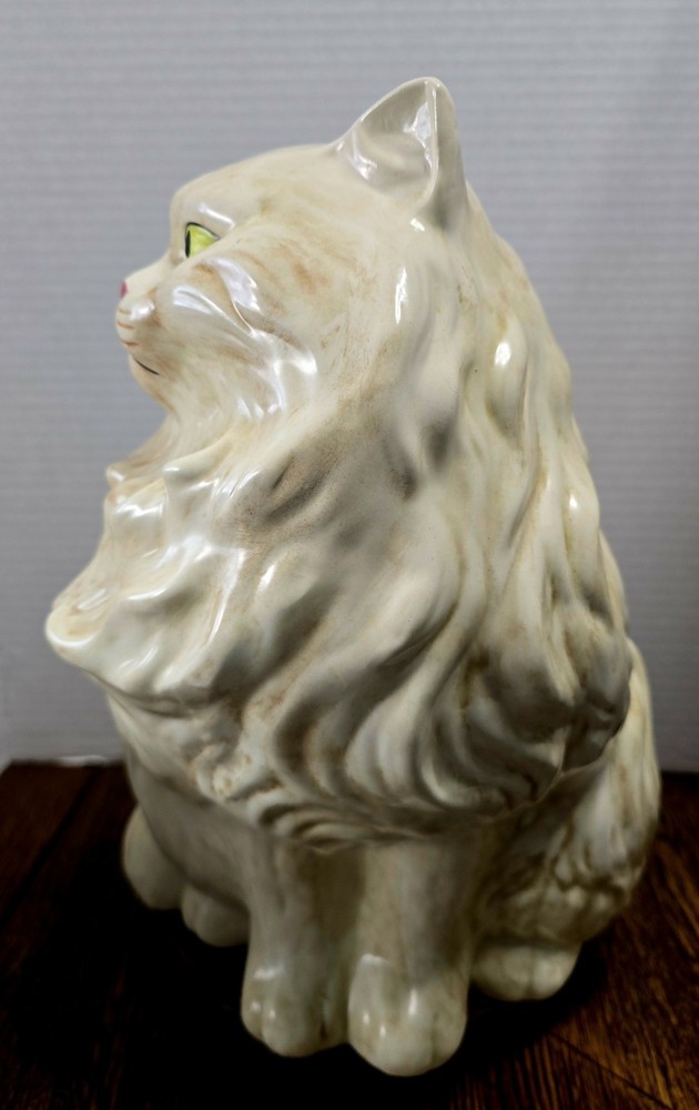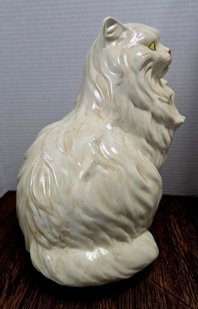This Large 15" Ceramic Persian Cat Statue from the 1960's-1970's Era features hand-painted details and striking yellow eyes, making it a unique and collectible piece for cat lovers and collectors alike. The ceramic material adds a touch of elegance to this vintage figurine, depicting a lifelike Persian cat in a timeless style that is sure to be a standout in any home decor or display.
