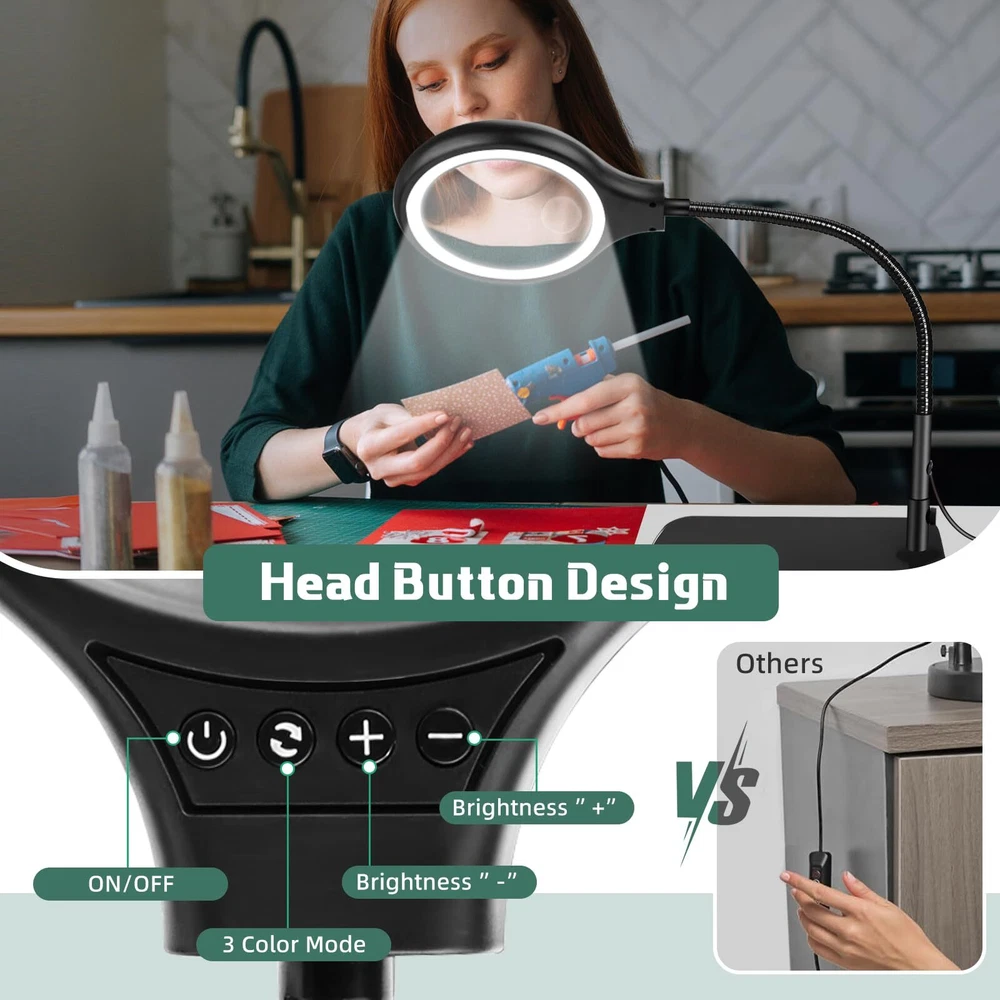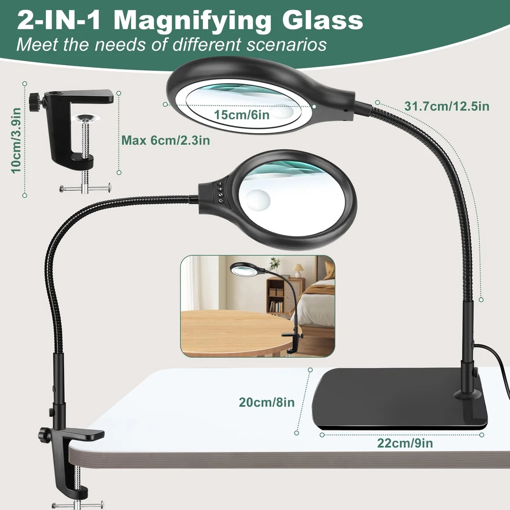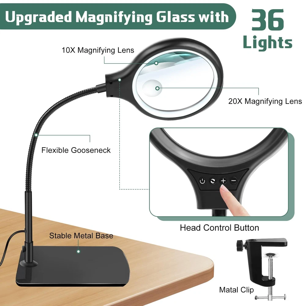 20X 10X Magnification :Dive into meticulous tasks effortlessly with our lighted magnifier, boasting a 5" lens for precise, distortion-free magnification at 20x 10x high power. Ideal for sewing, crafting, reading, and intricate hobbies like diamond painting, beading and jewelry making. Our desk magnifying glass with light and stand is tailored to meet your requirements. Head Buttons Switch For Convenience: Our LED magnifier light mounts the switch on head, unlike other switches on traditional power cords, so there's no need to bend down to find the switch, and it's easy to adjust the lighting settings just by reaching up, making it the perfect aid for needlework, crocheting, sewing, miniature painting, repairs, and other close-quarters work. 3 Color Modes and Adjustable Lighting: This desk magnifier with light and stand features 3 color modes and 4 adjustable brightness levels.Bright 36 LED light provides you with even, flicker-free light for clearer vision and less eye fatigue. The desktop magnifier with light has a memory function that keeps the mode and brightness of the last use. Perfect for nail technicians, repairmen, sculptors, craft enthusiasts and more. 2 in 1 Heavy Base Stable and Clamp Design:This 2 in 1 desktop magnifying glass features a 12.6 inch gooseneck arm that rotates 360°for great flexibility. The counterweight base ensures stability and can be placed smoothly on the table top. Clamp up to 2.1 inches thick, no tools required for installation! It can be easily clipped to the edge of a flat surface and can be used for tables, workbenches, bookshelves, etc. Perfect Application on Small Details:Clip on Magnifying glass with light and stand is very suitable for working on small/tiny things. It is also perfect for reading, sewing, painting, knitting, learning, painting, repairing, and soldering. It is a great gift for your friends, husband, or wife who need to focus on close work or crafts.