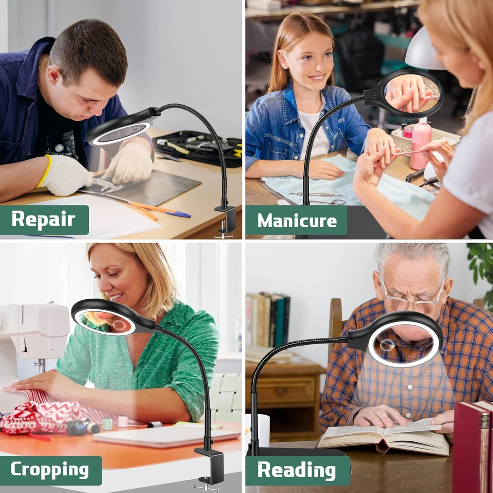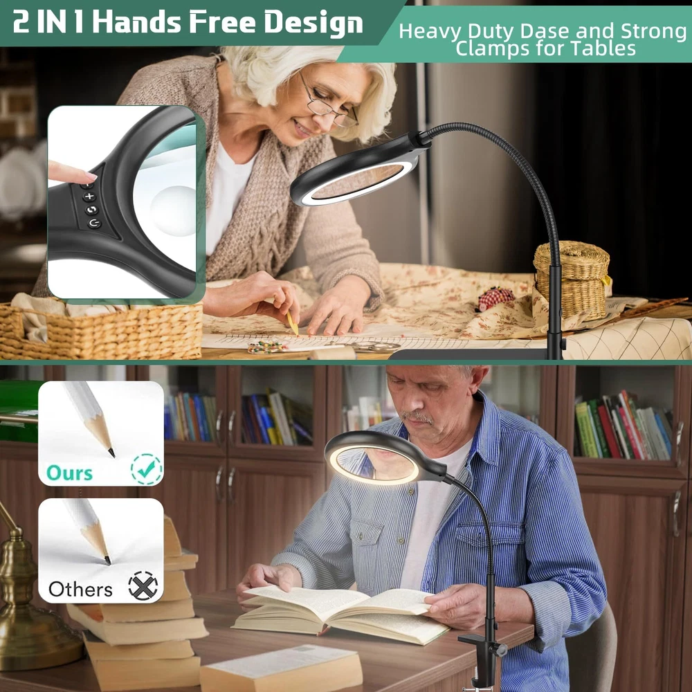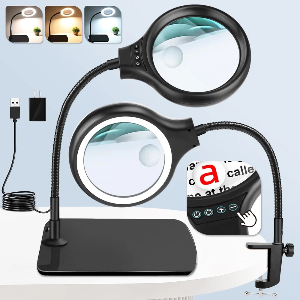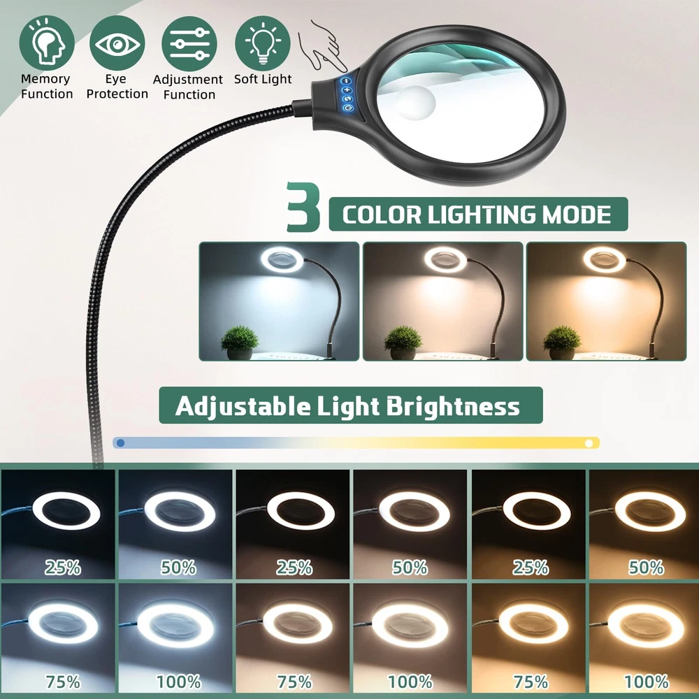 20X 10X Magnification :Dive into meticulous tasks effortlessly with our lighted magnifier, boasting a 5" lens for precise, distortion-free magnification at 20x 10x high power. Ideal for sewing, crafting, reading, and intricate hobbies like diamond painting, beading and jewelry making. Our desk magnifying glass with light and stand is tailored to meet your requirements. Head Buttons Switch For Convenience: Our LED magnifier light mounts the switch on head, unlike other switches on traditional power cords, so there's no need to bend down to find the switch, and it's easy to adjust the lighting settings just by reaching up, making it the perfect aid for needlework, crocheting, sewing, miniature painting, repairs, and other close-quarters work. 3 Color Modes and Adjustable Lighting: This desk magnifier with light and stand features 3 color modes and 4 adjustable brightness levels.Bright 36 LED light provides you with even, flicker-free light for clearer vision and less eye fatigue. The desktop magnifier with light has a memory function that keeps the mode and brightness of the last use. Perfect for nail technicians, repairmen, sculptors, craft enthusiasts and more. 2 in 1 Heavy Base Stable and Clamp Design:This 2 in 1 desktop magnifying glass features a 12.6 inch gooseneck arm that rotates 360°for great flexibility. The counterweight base ensures stability and can be placed smoothly on the table top. Clamp up to 2.1 inches thick, no tools required for installation! It can be easily clipped to the edge of a flat surface and can be used for tables, workbenches, bookshelves, etc. Perfect Application on Small Details:Clip on Magnifying glass with light and stand is very suitable for working on small/tiny things. It is also perfect for reading, sewing, painting, knitting, learning, painting, repairing, and soldering. It is a great gift for your friends, husband, or wife who need to focus on close work or crafts.