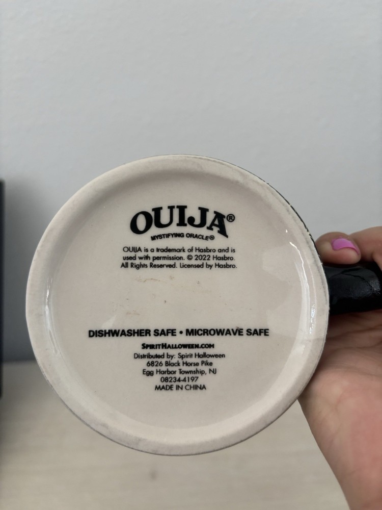 Vintage:Nogtin13:Does not applyCharacter:NoneItem Diameter:4 inchesItem Width:4 inColor:Black and CreamSize:LargePersonalize:NoSet Includes:Coffee Cup, Tea CupShape:RoundTime Period Manufactured:2020-NowCountry/Region of Manufacture:ChinaOriginal/Licensed Reproduction:OriginalTheme:HalloweenPersonalized:NoBrand:UnbrandedHandmade:NoBeverage Type:Hot or ColdCapacity:20 OuncesDepartment:Unisex AdultModel:OUIJA BoardGlassware Type:MugFeatures:HandleFranchise:HasbroType:Coffee MugService For:1Occasion:All OccasionsPattern:GameUPC:Does not applyMaterial:Ceramic & PorcelainNumber of Items in Set:1Glass Type:Large Mug