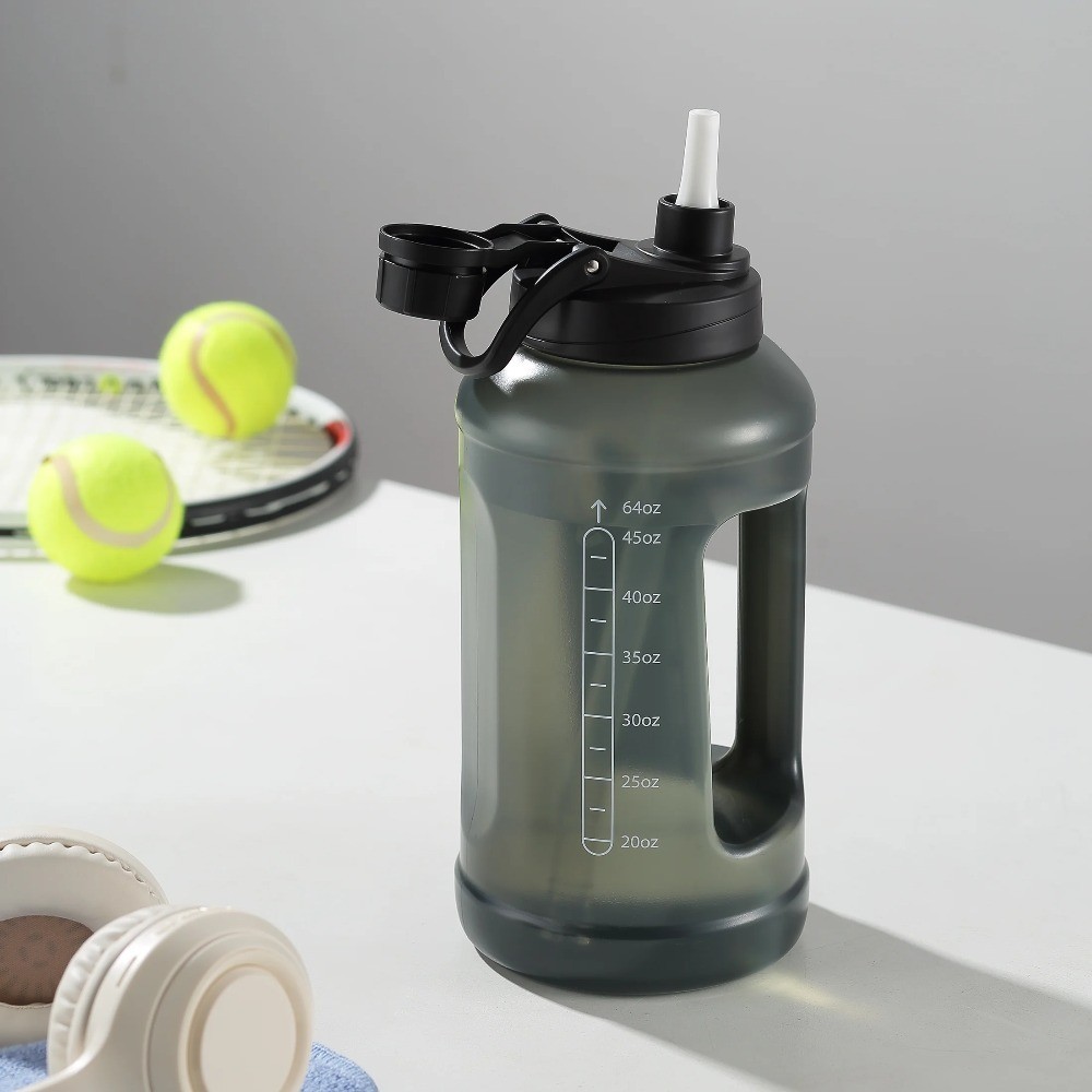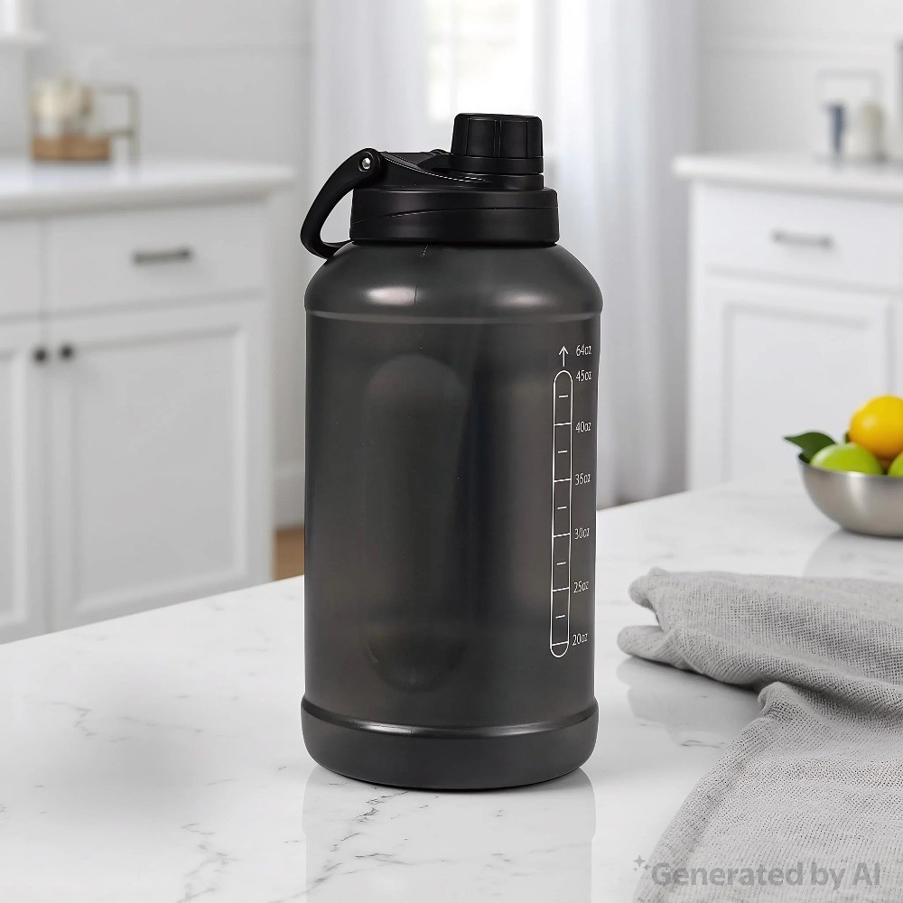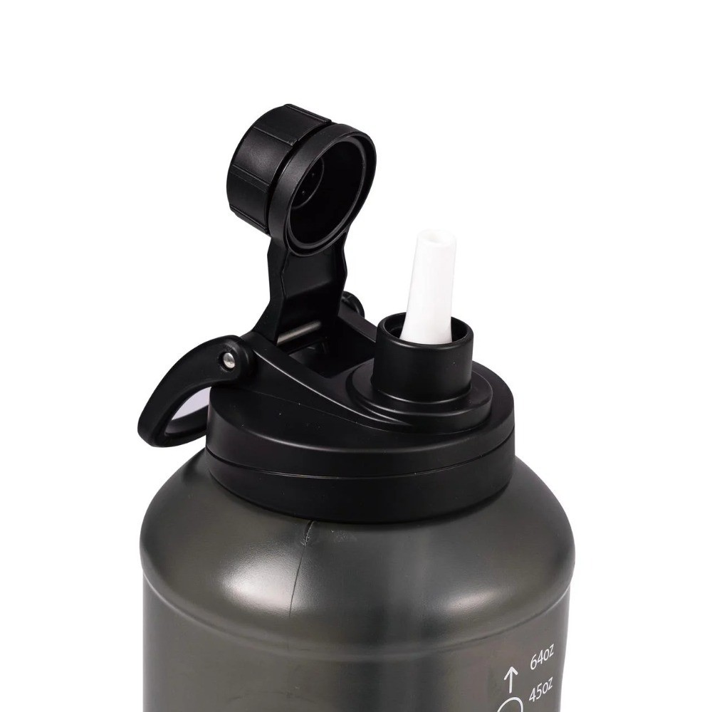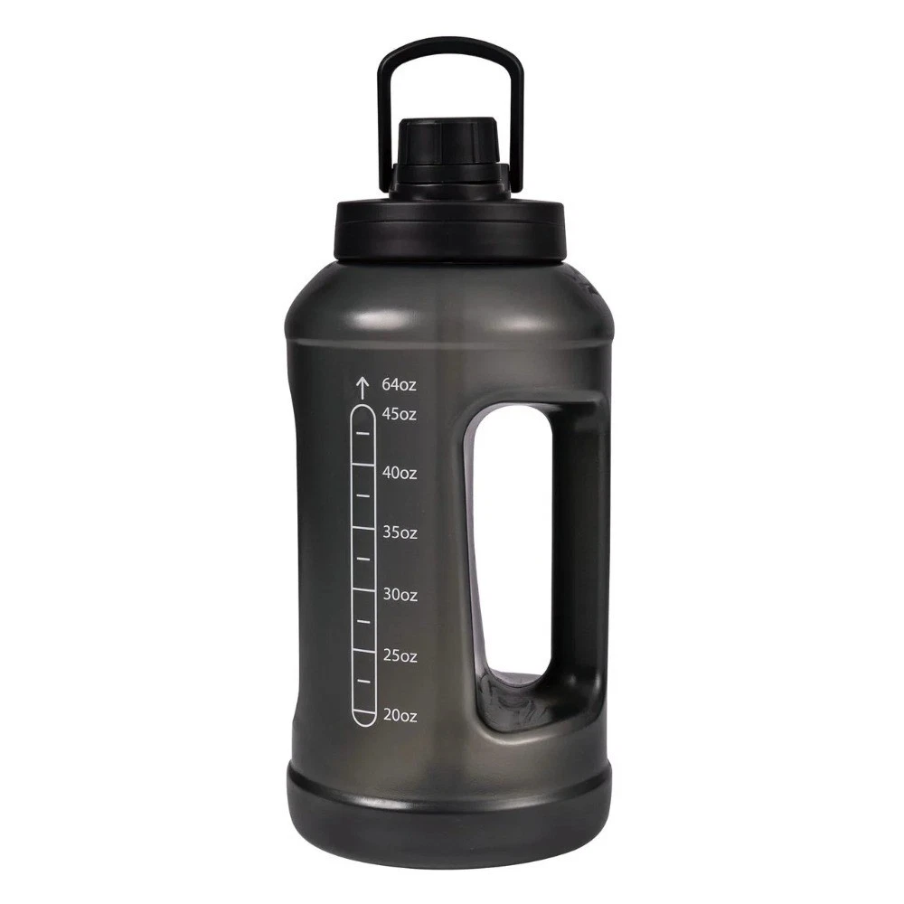 The 64-ounce bottle in translucent black is your perfect hydration partner. It features a unique 2-in-1 lid for both sipping and chugging. Use the printed measurement marks on the side to easily track your daily water intake. Made from strong, plastic, this large bottle is light yet durable. The wide mouth is great for adding ice and cleaning. With its leak-proof lid and convenient handle, its ready for any activity. 64 Fluid Ounces Capacity: Large size for extended hydration with fewer refills. Durable Material: , lightweight, and built to last. Wide Mouth Opening: Easy to fill, pour, and clean. Leak-Proof Lid: Secure screw-on lid to prevent spills. Ergonomic Handle: Comfortable to carry for on-the-go hydration. Sleek Translucent Black Design: Modern look with a clear view of liquid levels.