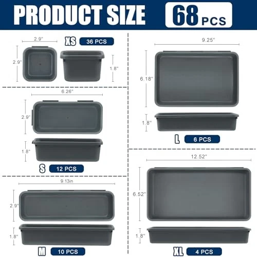 Return Policy Fast Delivery Trusted seller 【LARGE SIZE】【68PCS】Tool Box Organizer Tray Divider, 【5 Size】Toolbox Desk Drawer Organizer, Organization and Storage Toolbox for Garage Accessories (68pcs-Grey) (68PCS 5Sizes) Product Description [Keep Your Tools Tidy] tool box oragnizer tray to upgrade your garage oragnaization and storage,included 4*XL ,,6*L,10*M,12*S,36*XS. This set provide a wide variety choose to organize your tools and small parts effectively. [DIY Combination] With the Tool Box Organizer Tray Divider Set, you have the freedom to arrange and rearrange the dividers as needed. Create compartments of various sizes to accommodate different tools and maximize space utilization. The dividers are easy to install and remove, making convenient to combine freely [Fit All Drawer] These drawer organizer set contains 5 kind of different size trays that can be used for smaller drawers or larger drawers. Not only suitable for toolboxes, but these tray dividers also work wonders in desk drawers, providing a neat and tidy storage solution for office supplies and small items. [Premium Quality] Made from high-quality materials, these tray organizers are built to last. The a secure connection ensures that your tools and accessories keep in place. It can effectively protect your tools and accessories from moving and getting damaged. [Easy to Install] The dividers feature a user-friendly design, making installation and removal a breeze. Simply place them in your tool chest or drawer, and they will stay firmly in place, keeping your tools organized and accessible. Shipping Returns Payment Shipping Shipping is FREE to all addresses other than APO/PO boxes in the lower 48 states. All our stock ships from US-based warehouses. Shipped via USPS or UPS (depending on location and package weight) Unless stated otherwise, all orders will ship within 24-72 hours of your payment being processed. Check our feedback to see the great reviews of FAST shipping we offer. Returns Seller does not accept returns Payment We currently accept payment via eBay managed payments only. Once payment is cleared, we will dispatch your shipment within 1-3 business days. Please refer to the "Shipping" tab for more information regarding shipping speed to your destination.