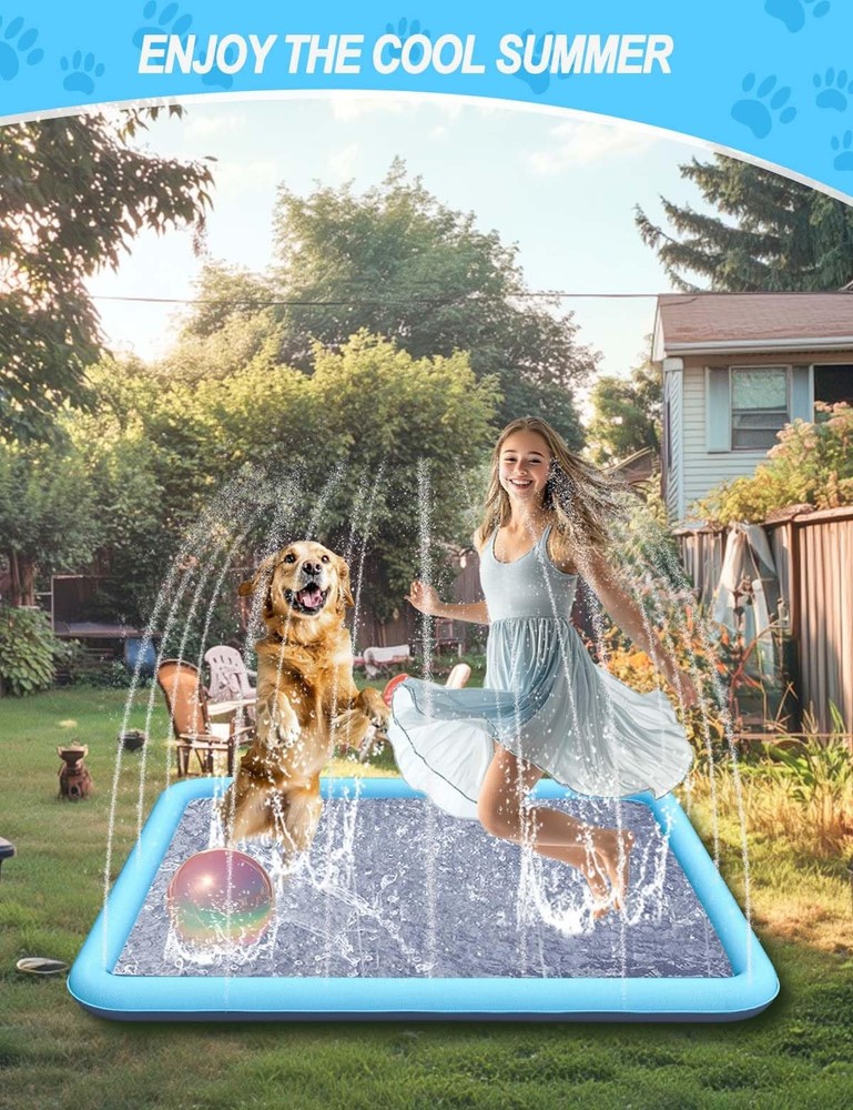 Experience endless outdoor fun with the 79IN Dog Splash Pad ! Spacious and versatile, it’s the ideal water activity pad for large dogs, small pets, and families. It provides ample room for jumping, running, and splashing. Constructed from 0.5mm thick PVC , this splash pad is built to endure energetic play, claws, and daily use. The tightly sealed seams and robust design prevent leaks, ensuring a hassle-free experience. Its vibrant blue square shape adds charm to any backyard setup. Safety meets style with its anti-slip surface , which minimizes accidents and provides secure footing during water activities. Effortless to set up, the splash pad connects to any standard garden hose, delivering instant refreshment. Thoughtfully packaged in a bright gift box, this product includes a detailed user manual , making it an excellent gift for pet lovers and families. Create unforgettable memories with the 79IN Dog Splash Pad—where fun meets functionality. 【Quick Installation】Easily connect it to your garden hose, adjust the water flow, and let the splashing fun begin immediately. 【Strong and Tear-Resistant】Made from premium 0.5mm PVC, this pad delivers superior durability compared to thinner alternatives. 【Designed for Safety】The anti-slip surface ensures dogs and kids can run and play safely without worry. 【Spacious Family Fun】With a 79-inch diameter, this splash pad accommodates larger pets and families, making summer gatherings extra memorable. 【Convenient Accessories Included】Comes with a gift-ready box, a brief instruction, ensuring an effortless user experience.