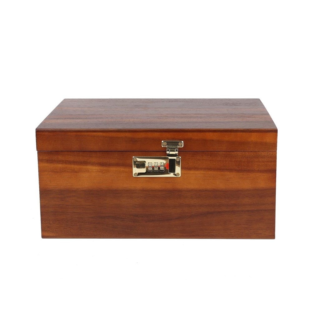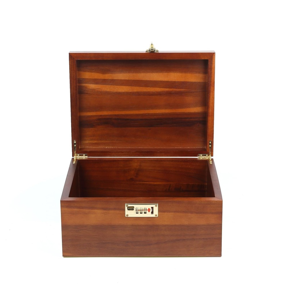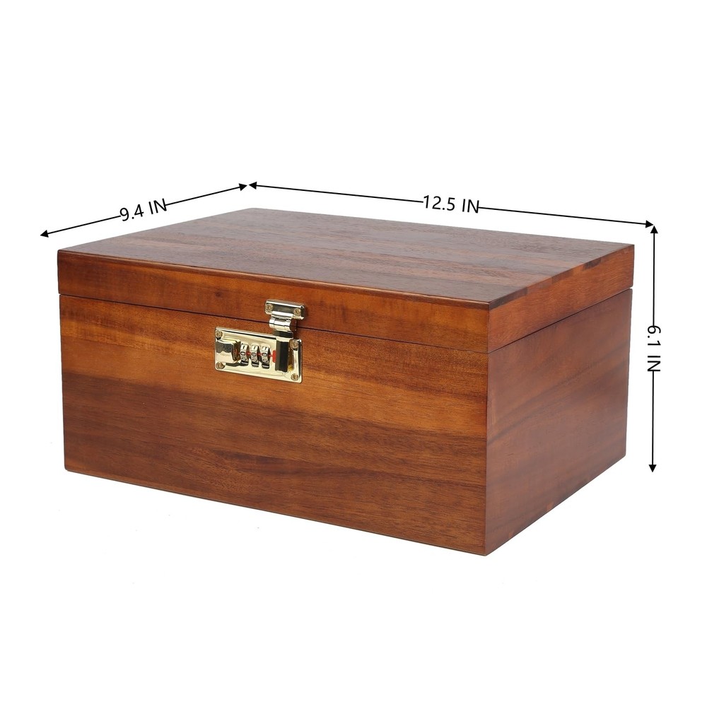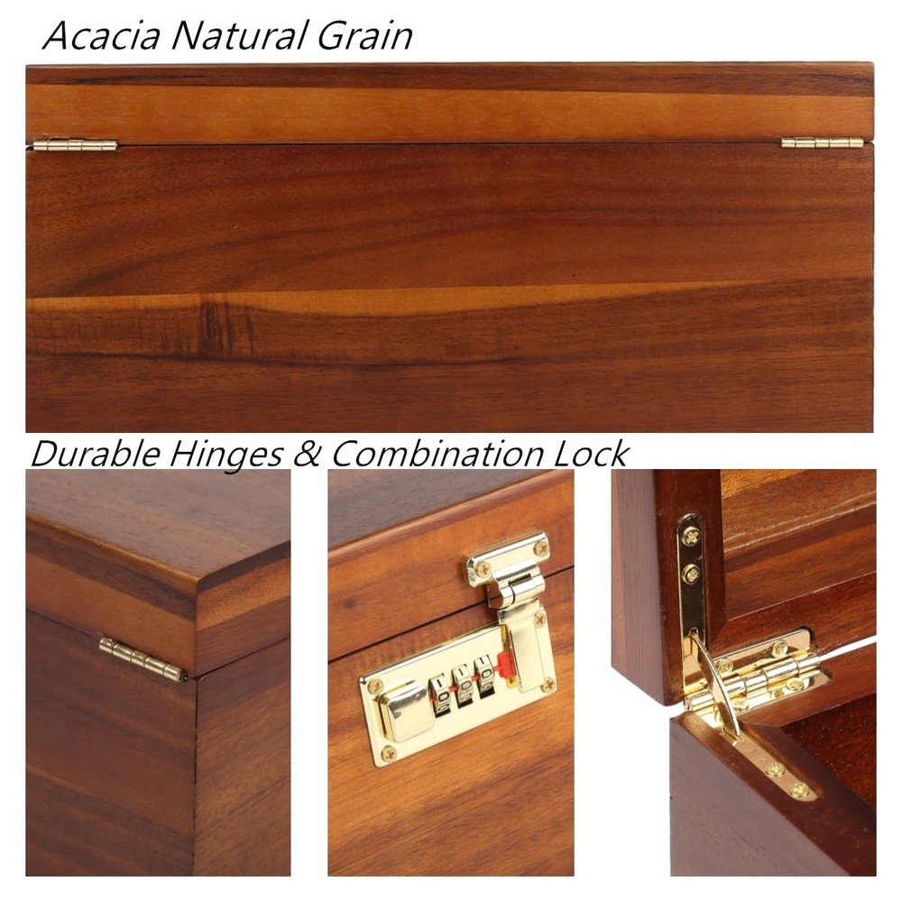 【Large Space】 This large wooden keepsake box measures 12.5Lx9.4Wx6.1H inches, we made this wooden box with combination lock big enough to hold anything you want to keep, it is a small helper for home storage and make your home more organized 【Durable Wooden Box 】 The wooden box is handmade from Acacia wood, the natural grain of the wood is clearer and the surface is smoothed for a more textured look. 90 degree gold hinges lock the lid in an upright position, beautiful and durable, highly respected 【Multi-Purpose】Ideal for storing photos, memorabilia, collectibles, accessories, jewelry, and other personal items, insulated from ash layer and moisture resistant. This high quality wooden organizer can be used for decorating room, office company, can be beautifully placed anywhere in your home or office. 【Best Gift Choice】 It will be a very good idea to give it to someone you care about on important days such as birthdays, anniversaries, Christmas, weddings and so on. It has a great commemorative significance, and its delicate and elegant appearance will attract a lot of people's attention 【Instructions for Password Change】Note: The initial password is 000. if you need to change your password, you just need to push the square on the left side of the combination lock to the right and hold it, then set the number password you want, release the square, the password is set successfully. You can change your password as many times as you like, but please remember the password you set.