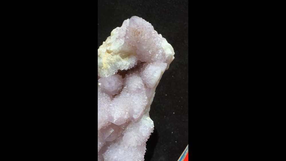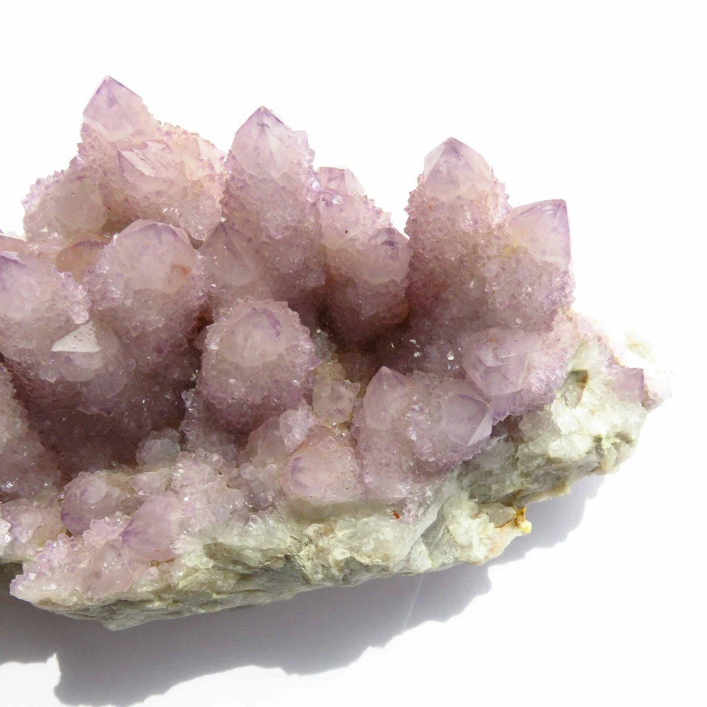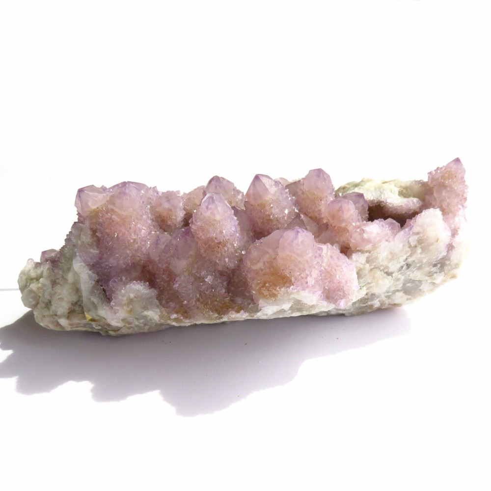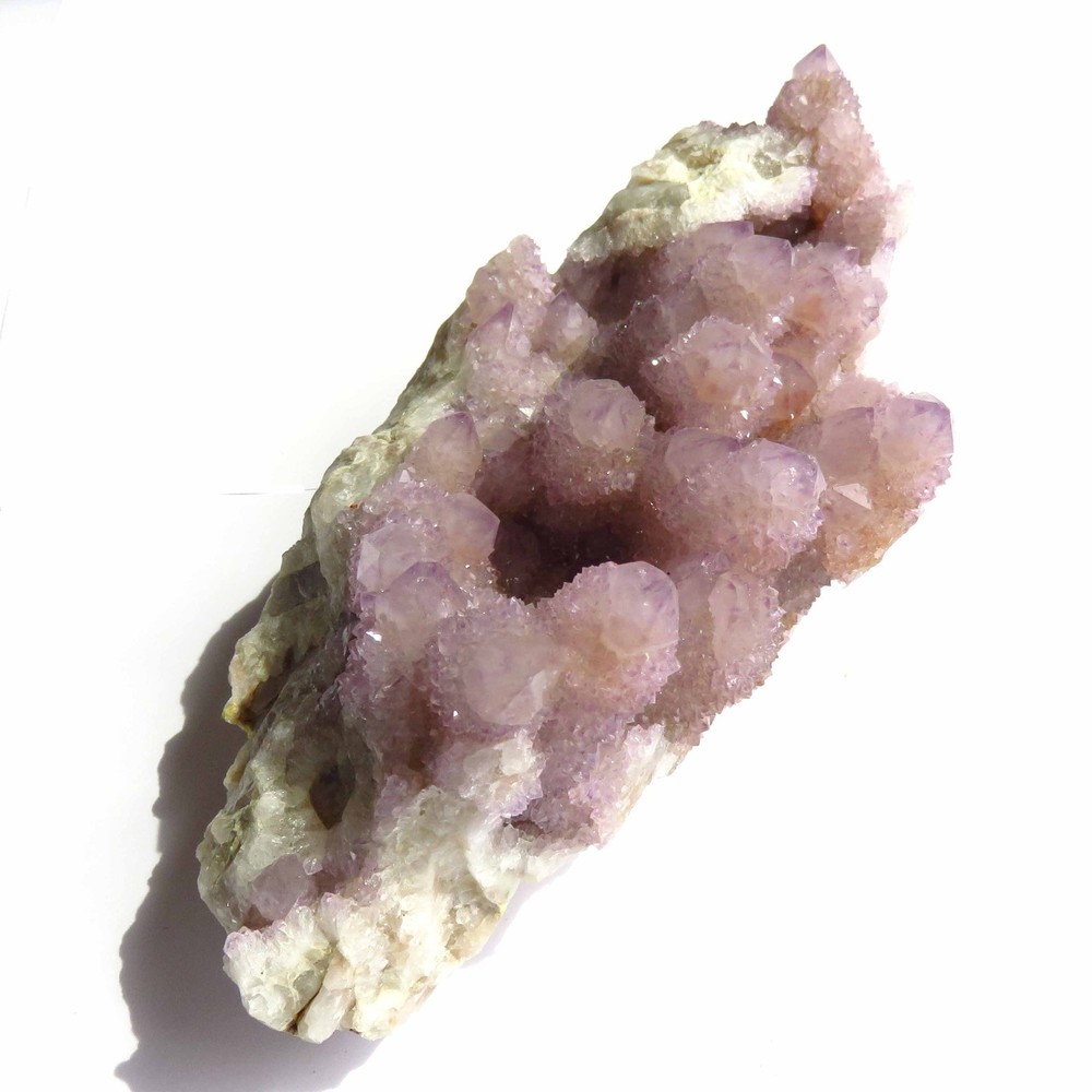 Cactus Quartz or Spirit Quartz Size Approximately 11 cm x 17 cm x 7 cm 907.1 g View My Other Items For Sale Visit My eBay Store Add me to your Favorite Sellers A cactus or spirit quartz is a quartz crystal that is encrusted by a second generation of smaller crystals grown on its prism faces. These crystals were first discovered in 1986 in the Magaliesberg Mountain Range near Pretoria, South Africa. It occurs as quartz, citrine and amethyst, and comes in a wide range of colors, including purple amethyst, violet amethyst, smoky, milky clear and golden citrine. FAQ/Tips Crystals are priced by quality, color and size. Purple amethyst is more highly prized and will cost more for a smaller lesser quality crystal. Lavender is the most common color and where you will find the best quality/value for price Crystals change colors with changes in type angle and intensity of light. Color may also vary between monitors. Pictures were taken in bright light. We do our best to give you many views so you can judge the quality of the given crystals. If you have questions, please ask before bidding or buying. Many of the crystals have special color properties: Many have phantoms, not just the ones we've indicated. Some have "floating" purple tips. The placement of darker purple against purple or white crystals appears to change as the crystal is turned. Many are a mixture of citrine and amethyst. The ones called "Golden Healers" or "Sunshine" have a rainbow effect on crystal faces. We value your feedback please contact us with problems. Items are returnable. Track Page Views With Auctiva's FREE Counter