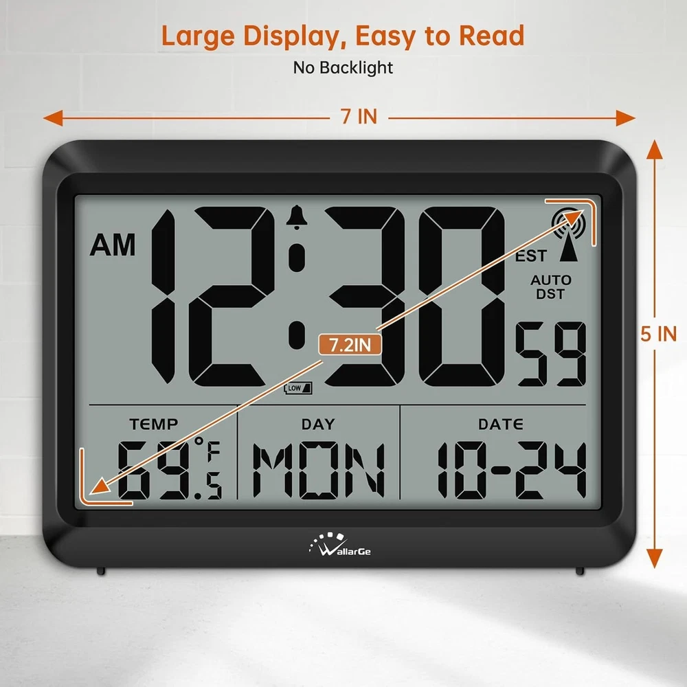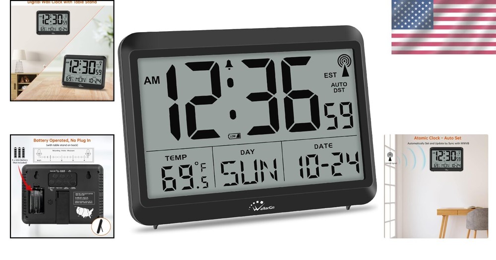 Large Display Atomic Wall Clock - Date, Temp & Alarm Function, Battery Operated ‹ › ‹ › ‹ › ‹ › ‹ › ‹ › ‹ › ‹ › ‹ › Large Display Atomic Wall Clock Features: Atomic Time Synchronization: Built-in receiver automatically synchronizes with WWVB radio broadcast for precise time updating every midnight. Select Your Time Zone: Choose from four time zones: EST, PST, MST, CST for ultimate accuracy. Battery Operated Convenience: Powered by three AAA batteries (not included), allowing for seamless placement anywhere in your home. Large LCD Display: Oversized screen measures 6.2 in x 3.7 in displaying time, indoor temperature, day, and date for easy reading. Automatic Daylight Saving Time: Automatically adjusts forward or backward in daylight saving time, with the option to disable. Digital Alarm Function: Easily set, toggle on or off, with a clear bell icon indicator for active alarms. Dual Time Formats: Easily switch between 12-hour and 24-hour military time modes, with synchronized display for alarm times. Temperature Display: Switch between Fahrenheit and Celsius for temperature reading according to your preference. Benefits: Simplifies timekeeping - never worry about setting the clock manually again. Stylish addition - the large display brings both functionality and aesthetic appeal to any room. Convenient and user-friendly - designed for ease of use with quick access buttons for adjustments. Multi-functional clock - offers time, temperature, and alarm features in one sleek device. Why choose our Large Display Atomic Wall Clock? Experience the pinnacle of timekeeping with our Large Display Atomic Wall Clock, designed to blend sophistication with unrivaled accuracy. With automatic time synchronization and a large yet easily readable display, you’ll never have to squint to see the time again. The battery-operated design gives you the freedom to place it wherever you desire, making it the perfect accessory for your home or office. With thoughtful features like automatic daylight saving time adjustments and a customizable temperature display, this clock is not just practical; it embodies a commitment to quality and convenience. Elevate your time-management game—add our Large Display Atomic Wall Clock to your home today! Shipping Free & Fast Shipping - We offer free shipping to most of the USA with a normal delivery time of 3-7 days. However, due to the current situation, additional delivery time (up to 3 weeks) may be required for some items. Alternative Carriers - We may use alternative carriers (e.g. USPS, FedEx, UPS, etc.) to ensure your package arrives safely and on time. Due to the use of multiple carriers, we are unable to provide a tracking number automatically. Handling Time - Orders are processed and shipped within 1-2 business days of receiving cleared payment. Shipping Restrictions - Shipping to Alaska, Hawaii, Puerto Rico, Guam, and other US territories may incur shipping charges or delivery restrictions. Please contact us before ordering, or your order can be refunded/cancelled. State Restrictions - There may be restrictions based on your state of purchase. For example, certain items may not be shipped to California due to state regulations. Contact for Tracking Updates - If you require tracking updates or have any concerns about the delivery of your order, please feel free to contact us, and we will be happy to assist you. Return 30-Day Hassle-Free Returns - We want you to be completely satisfied with your purchase. If you are not, you can return the item within 30 days of receiving it for a full refund or exchange. Easy Return Process - To start a return, simply contact us and we will provide you with a prepaid return shipping label and detailed instructions. Restocking Fee - There are no restocking fees for returns. However, the buyer is responsible for return shipping costs if the return is not due to a seller's error. Refund Processing Time - Refunds will be processed within 5 business days of receiving the returned item in its condition. Payment We accept all major credit cards, PayPal, and Apple Pay for your convenience. Your payment information is secure and encrypted to ensure a safe and seamless transaction. Please complete your payment within 3 days of purchase to avoid any delays in shipping. Feedback Your feedback is extremely important to us. We strive to provide the best products and customer service possible. If you are satisfied with your purchase, please take a moment to leave us a positive review. If you have any concerns or issues with your order, please contact us before leaving negative feedback. We are committed to resolving any problems and ensuring your satisfaction. Contact Us If you have any questions or concerns, please feel free to out to our customer support team. You can contact us through the eBay messaging system. We are available Monday to Friday, 9:00 am to 5:00 pm EST, and we will do our best to respond to your inquiry within 24 hours. Buy it now and enjoy a pleasant shopping experience! Item Length: Digital Wall Clock Product Line: Digital Wall Clock Unit Quantity: 0.5 Features: Alarm,Day/Date Display,Digital,Large Display,Multiple Time Zones,Temperature Display,Automatic,Time Mode: 12/24 Hour,Auto DST,Silent Operation Theme: Plain Room: Bedroom,Dining Room,Home Office/Study,Classroom Character: Atom Department: Kids,Teens,Adults,Seniors,Elderly,Youth Type: Digital Alarm Clock Style: Digital Atomic Movement: Automatic Power Source: Battery Powered Color: Black Display Type: Digital Shape: Rectangular Item Weight: Less Than 1 lb Unit Type: Unit