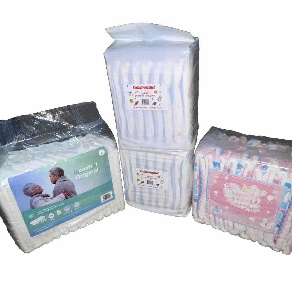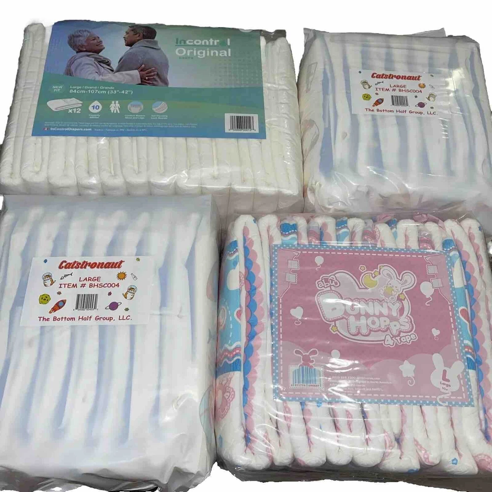 Large Bambino+ABU+Rearz Lot 4 Bag Deal -1 Bag ABU Bunny Hopps Vintage Size Large Double Tape Plastic Backed ABU-F10121 -1 Bag Rearz Incontrol Original Size Large *NEW* New Fit 4999ML Double Tape Plastic Backed Wetness Indictors tall leak guards -2 Bags Bambino Catstronaut Size Large BHSC004 Double Tape Plastic Backed Smoke Free ABDL Home Free Shipping Free Local Pick Up Check out my other listings part of 25 year collection