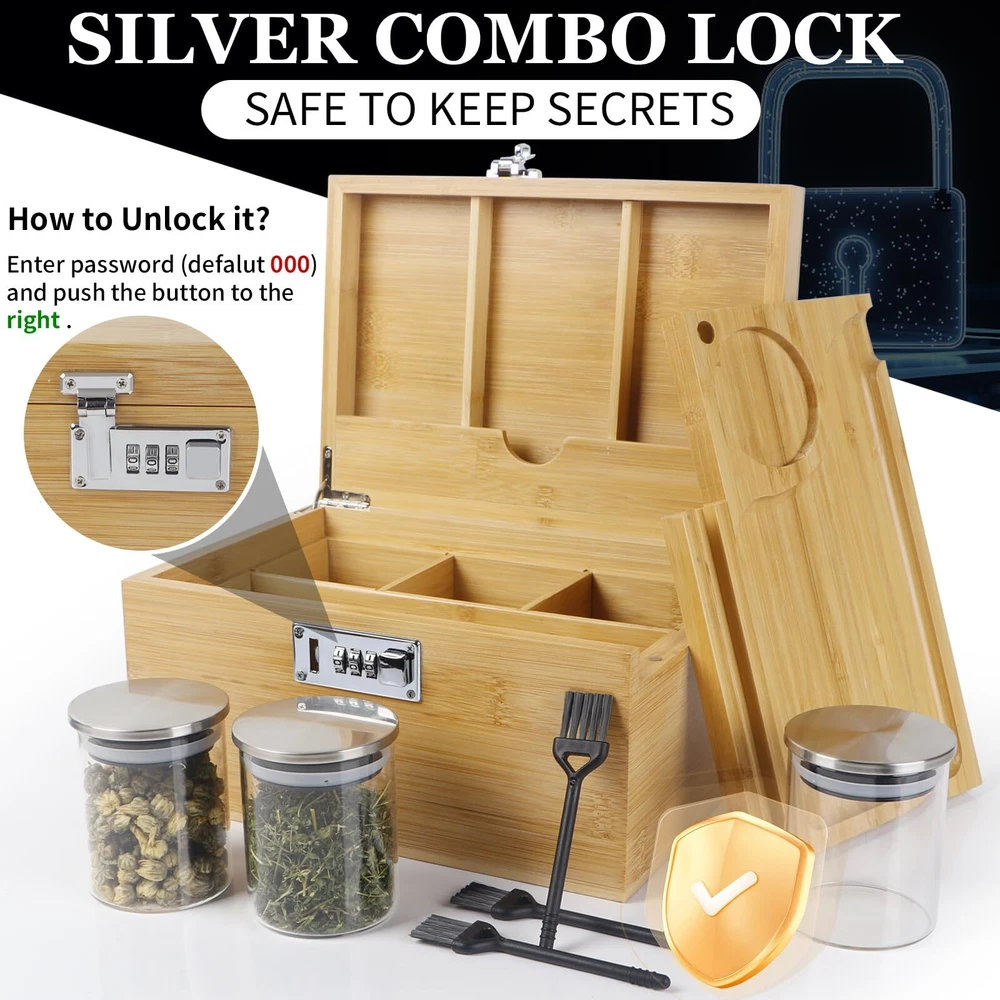 πBOX DIMENSION :The storage box measures 10.2''(L) Γ 7β'(H) Γ 5.5''(W) ,the whole kit comes with glass jars Γ 3οΌcleaning brushes Γ 3 , sufficient accessories satisfy your needs. πPREMIUM NATURAL BOX : The decorative box is made of premium sustainable ., heavy-duty thatβs strong enough to keep them study and safe. Box is definitely a home essentials organizing choice. π₯SLIDING TRAY & REMOVABLE COMPARTMENT - The sliding out tray offers a customizable layout for your stored items. Adjust the detachable compartments to accommodate different sizes and types of belongings, providing you with a versatile and adaptable storage solution. ππππππππππππ ππππ ππππ ππππ πππππππ: Default password is 0-0-0 of combination lock ,we have video instruction of code setting in the product page and manual instruction in the package to ensurr that you can quickly establish a secure combination without any complicated procedures. Creat a private space and enjoy a straightforward/user-friendly experience πOUTSTANDING DETAILS -The box is crafted well by master craftsman . Strong hinges ensure easy opening and closing of the lid.Bambo surface ismooth and well polished.In addition ,there are four rubber mat on the bottom to protect the box. πA GREAT GIFT FOR ENTHUSIASTS - . What could be better than to help them preserve the essentials meanwhile keeping everything neat and organized?