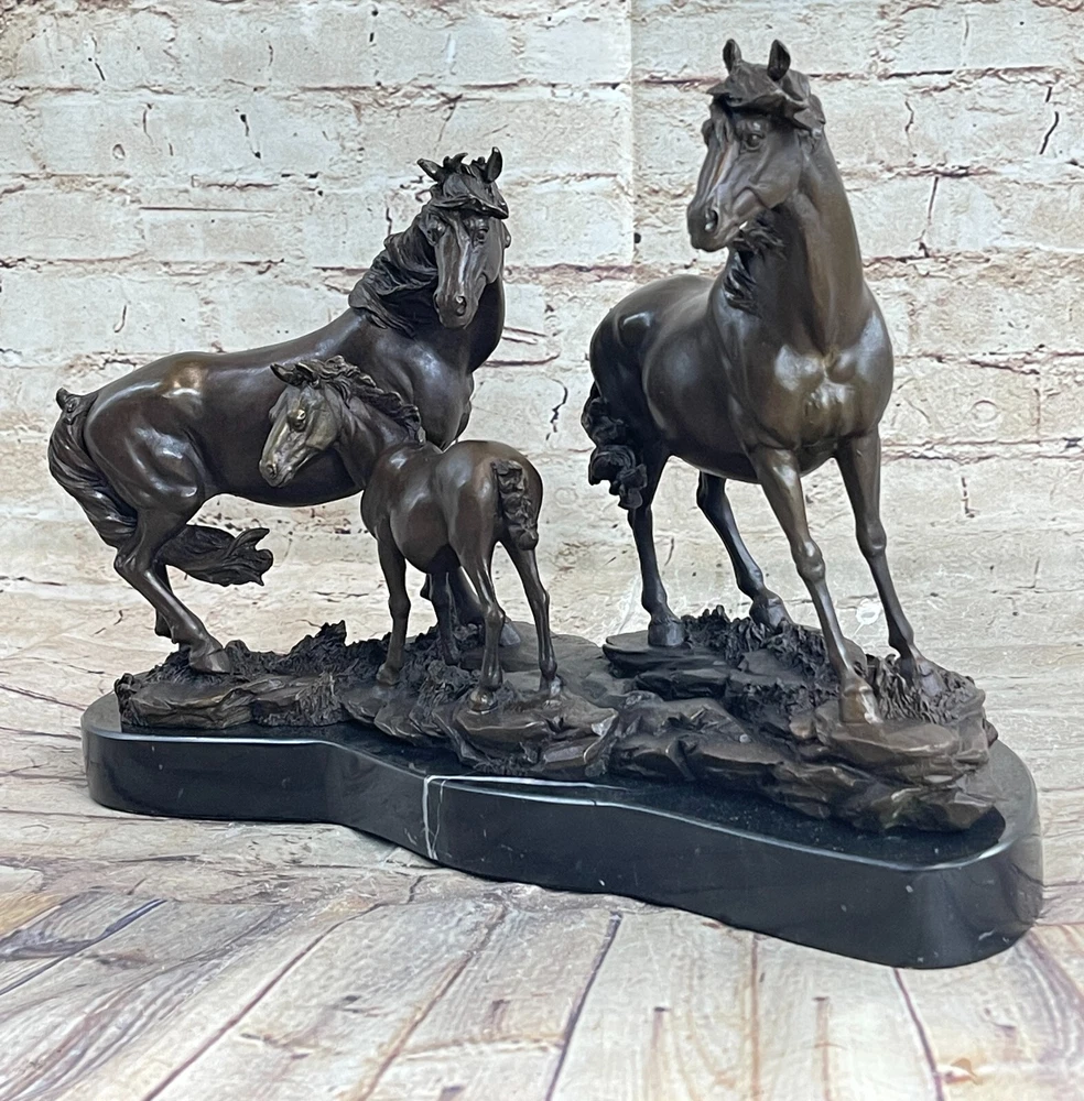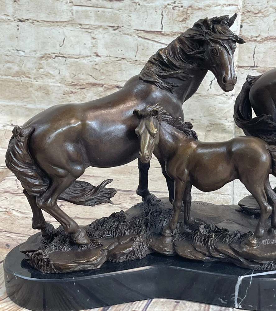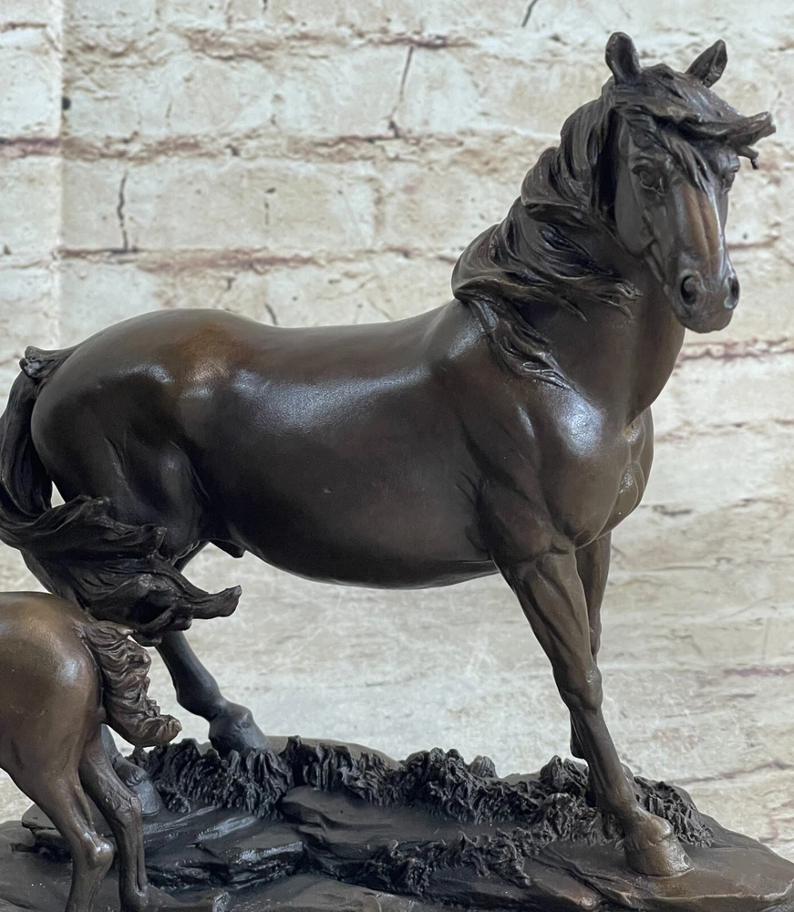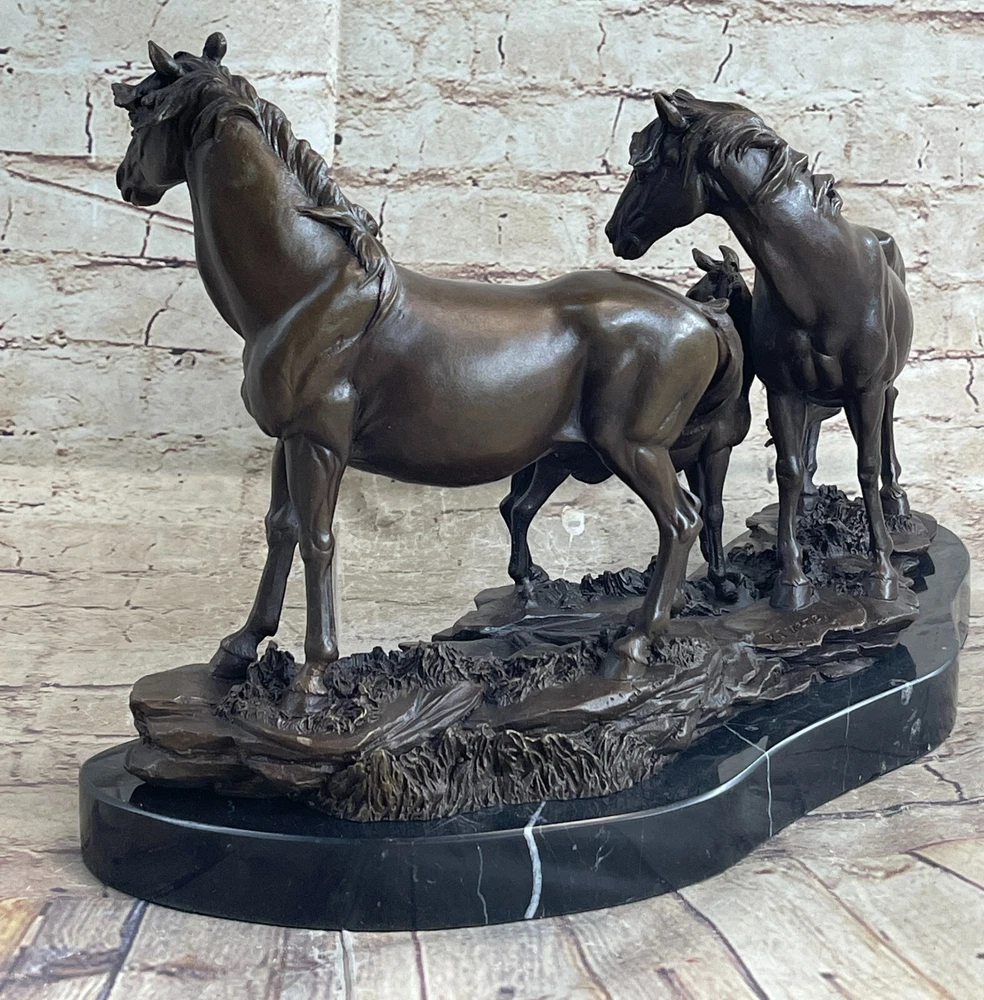 Large Bronze Sculpture Horse Foal 20 LBS Figurine Signed after PJ MENE Gift Art Large Bronze Sculpture Horse Foal 20 LBS Figurine Signed after PJ MENE Gift Art Condition : This sculpture is in a perfect condition. Bronze Dimensions with Marble Base: Height 10" X Width 16" Marble Dimensions: Diameter 16" Height without base:9" Weight:20 LBS Inventory:28X25129882 Witness the beauty of nature and the tender bond between a mare and her young foal in this captivating bronze sculpture. The mare exudes vitality, gracefully swinging her tail as she strolls through the fields with a proud stance and sturdy legs. Her watchful eyes never leave her curious and playful foal, who eagerly lifts its head to explore the new scents and sights of the world. As the baby foal develops its muscles, the mare lovingly encourages her to take a playful run, ensuring the young one gets the exercise she needs to grow strong. The sculpture captures this heartwarming moment of motherly care and the innocence of youth, reflecting the timeless beauty of the animal kingdom. Handcrafted with meticulous attention to detail, this 100% bronze sculpture showcases the artistry of the acclaimed artist Mene. The two-toned brown patina finish enhances the lifelike qualities of the piece, lending it a sense of warmth and depth. Created using the revered "Lost Wax Method," the sculpture guarantees unparalleled craftsmanship and durability. Mounted on a luxurious marble base and signed by the artist, this masterpiece celebrates the wonders of nature and will be a cherished addition to any art collection, bringing the essence of the wild into your living space. Wild Horses Family Mare Stallion Colt Foal Hot Cast Bronze Sculpture Statue XN-2512 Video will open in a new window Using the eBay App? Paste link into a browser window: [isdntekvideo] Shipping Terms : Most of our items are shipped via USPS (United States Postal Service) mail or UPS. Most orders are shipped within 24-48 hours of purchase. Please be aware that not all items are available for USPS shipping due to size and weight. We do ship to Hawaii, Alaska, Canada, Puerto Rico, APO/AE, and U.S. Virgin Islands, however, an additional charge may be required. Please contact us before making any purchases in these areas. For Non-USA customers, you may be responsible for all duty, tax, brokerage fees that may be due upon delivery (shipping costs cover freight charges only). We also ship internationally. Please refer to the "Shipping and Handling" chart for the rates for each area. Payment : We accept just about any form of payment. PayPal, Master Card, Visa or American Express credit cards. Money orders, cashiers checks, and even personal or business checks. For governmental institutions, we will also accept a purchase order. Please understand that for personal or business checks we have to wait for the check to clear (usually 7 days) before shipping. Condition : New Detailed Hand Crafted Hot Cast Bronze Satisfaction Guaranteed. This is Stock Photo, Slight Color Variation!! Listing and template services provided by inkFrog