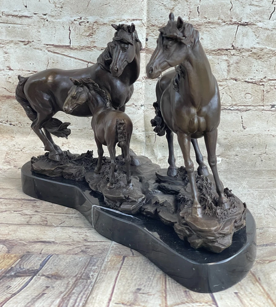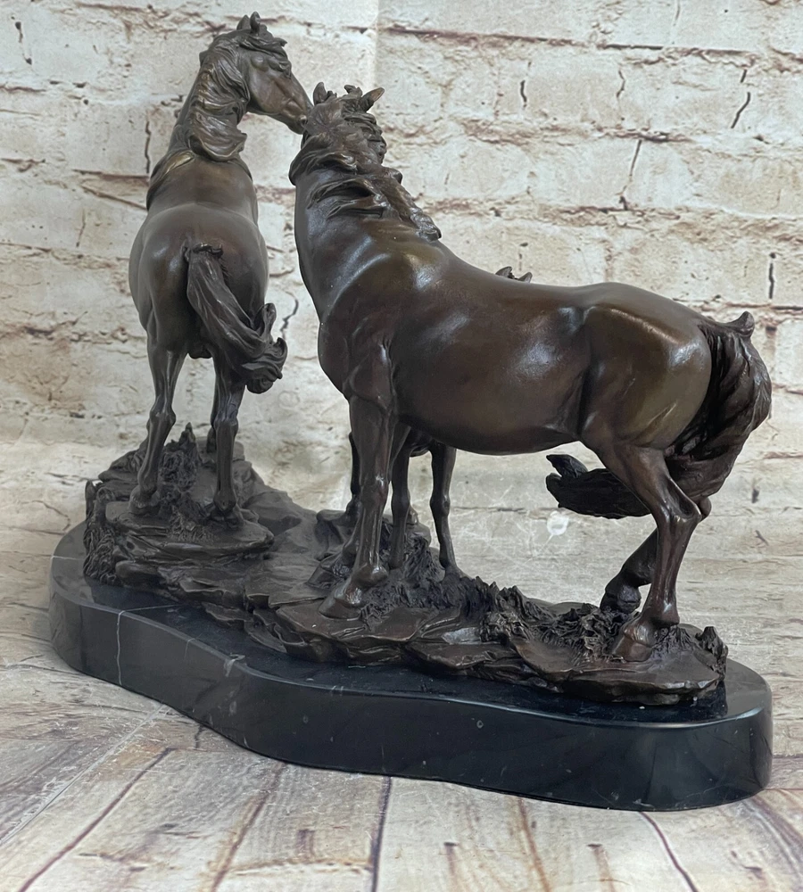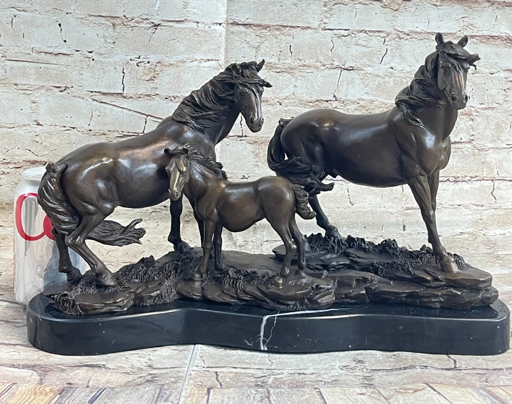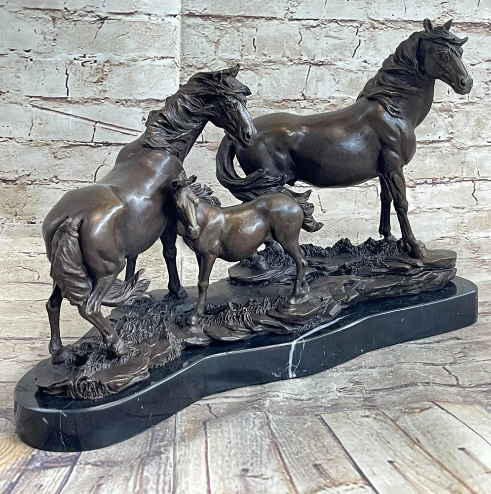 Large Bronze Sculpture Horse Foal 20 LBS Figurine Signed after PJ MENE Gift Art Large Bronze Sculpture Horse Foal 20 LBS Figurine Signed after PJ MENE Gift Art Condition : This sculpture is in a perfect condition. Bronze Dimensions with Marble Base: Height 10" X Width 16" Marble Dimensions: Diameter 16" Height without base:9" Weight:20 LBS Inventory:28X25129882 Witness the beauty of nature and the tender bond between a mare and her young foal in this captivating bronze sculpture. The mare exudes vitality, gracefully swinging her tail as she strolls through the fields with a proud stance and sturdy legs. Her watchful eyes never leave her curious and playful foal, who eagerly lifts its head to explore the new scents and sights of the world. As the baby foal develops its muscles, the mare lovingly encourages her to take a playful run, ensuring the young one gets the exercise she needs to grow strong. The sculpture captures this heartwarming moment of motherly care and the innocence of youth, reflecting the timeless beauty of the animal kingdom. Handcrafted with meticulous attention to detail, this 100% bronze sculpture showcases the artistry of the acclaimed artist Mene. The two-toned brown patina finish enhances the lifelike qualities of the piece, lending it a sense of warmth and depth. Created using the revered "Lost Wax Method," the sculpture guarantees unparalleled craftsmanship and durability. Mounted on a luxurious marble base and signed by the artist, this masterpiece celebrates the wonders of nature and will be a cherished addition to any art collection, bringing the essence of the wild into your living space. Wild Horses Family Mare Stallion Colt Foal Hot Cast Bronze Sculpture Statue XN-2512 Video will open in a new window Using the eBay App? Paste link into a browser window: [isdntekvideo] Shipping Terms : Most of our items are shipped via USPS (United States Postal Service) mail or UPS. Most orders are shipped within 24-48 hours of purchase. Please be aware that not all items are available for USPS shipping due to size and weight. We do ship to Hawaii, Alaska, Canada, Puerto Rico, APO/AE, and U.S. Virgin Islands, however, an additional charge may be required. Please contact us before making any purchases in these areas. For Non-USA customers, you may be responsible for all duty, tax, brokerage fees that may be due upon delivery (shipping costs cover freight charges only). We also ship internationally. Please refer to the "Shipping and Handling" chart for the rates for each area. Payment : We accept just about any form of payment. PayPal, Master Card, Visa or American Express credit cards. Money orders, cashiers checks, and even personal or business checks. For governmental institutions, we will also accept a purchase order. Please understand that for personal or business checks we have to wait for the check to clear (usually 7 days) before shipping. Condition : New Detailed Hand Crafted Hot Cast Bronze Satisfaction Guaranteed. This is Stock Photo, Slight Color Variation!! Listing and template services provided by inkFrog