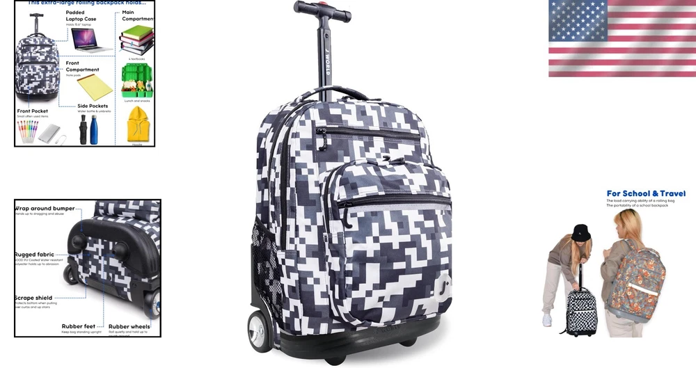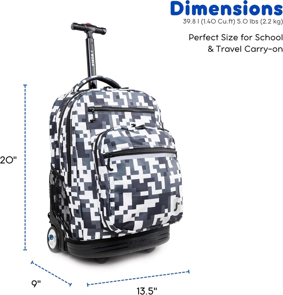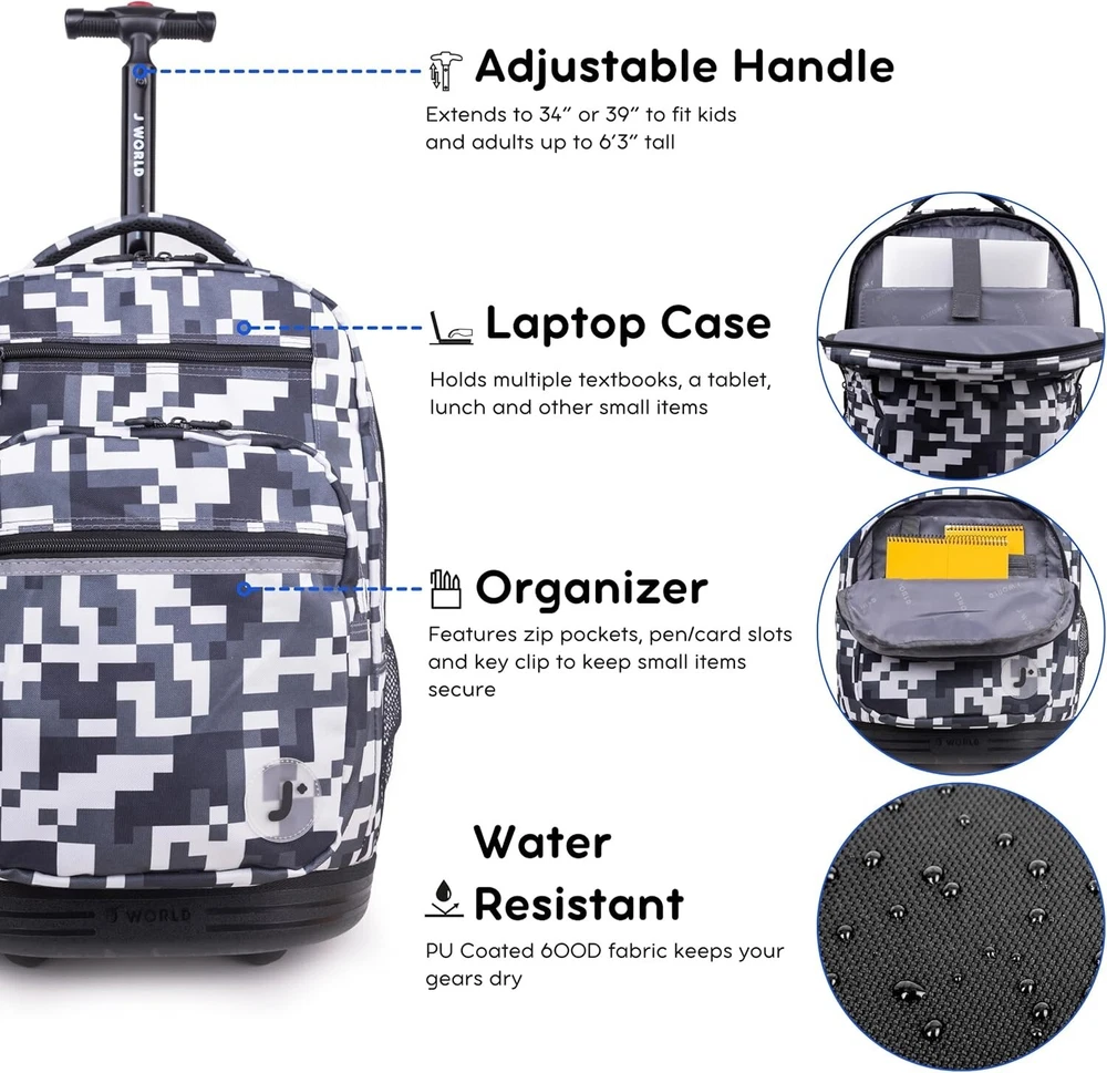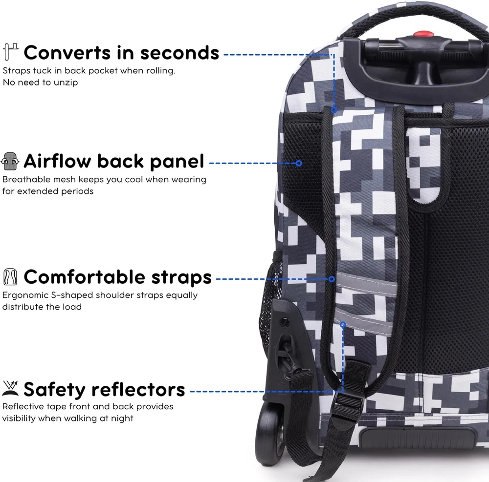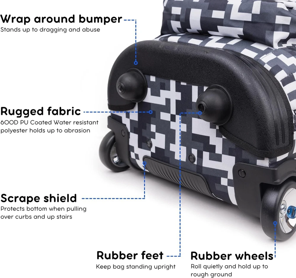 Large Camo Rolling Backpack with Adjustable Handle – Perfect for School & Beyond ‹ › ‹ › ‹ › ‹ › ‹ › ‹ › ‹ › ‹ › ‹ › ‹ › Large Camo Rolling Backpack with Adjustable Handle Perfect for School & Beyond Features: Large Backpack With Wheels: This 20” rolling backpack offers the load carrying ability of a kids rolling suitcase and the portability of a school bookbag, ideal for kids and adults alike. Huge Capacity: Measures 20 x 13 x 9 inches, it easily carries a computer laptop, 3" binder, 3 college textbooks, notebooks, portable hard drive, and lunch—with room to spare. Laptop Compartment: Fully-padded interior laptop carrying case keeps your device safe, fitting most laptops up to 15.6 inches. Organizer: With 2 large compartments, 3 exterior zipper pockets, 2 mesh pockets, plus internal pockets for small items, it has a place for everything. Adjustable Handle: Single-tube aluminum handle extends to 34 or 39 inches, making it easy to maneuver for teens and adults up to 6’3” tall. Dual Functionality: Can be utilized as both carry-on luggage that fits under airplane seats or in overhead compartments and a strapped backpack for easy carrying. Benefits: Combines the convenience of a rolling suitcase and the versatility of a backpack. Protective laptop sleeve ensures your device remains safe while traveling. Front pocket equipped with a pencil holder and key fob for quick access to everyday essentials. Side mesh pockets perfect for hydration needs, accommodating water bottles and other drink containers. Why choose our Large Camo Rolling Backpack? Upgrade your travel experience with the Large Camo Rolling Backpack, designed for those who value both functionality and style. Its massive capacity and smart organization features make it the perfect partner for school, work, or travel. Whether you're navigating crowded hallways or catching flights, this versatile backpack with its adjustable handle and protective laptop compartment ensures comfort and security for all your essentials. Don’t compromise on quality or style – make the Large Camo Rolling Backpack your go-to choice today! Shipping Free & Fast Shipping - We offer free shipping to most of the USA with a normal delivery time of 3-7 days. However, due to the current situation, additional delivery time (up to 3 weeks) may be required for some items. Alternative Carriers - We may use alternative carriers (e.g. USPS, FedEx, UPS, etc.) to ensure your package arrives safely and on time. Due to the use of multiple carriers, we are unable to provide a tracking number automatically. Handling Time - Orders are processed and shipped within 1-2 business days of receiving cleared payment. Shipping Restrictions - Shipping to Alaska, Hawaii, Puerto Rico, Guam, and other US territories may incur shipping charges or delivery restrictions. Please contact us before ordering, or your order can be refunded/cancelled. State Restrictions - There may be restrictions based on your state of purchase. For example, certain items may not be shipped to California due to state regulations. Contact for Tracking Updates - If you require tracking updates or have any concerns about the delivery of your order, please feel free to contact us, and we will be happy to assist you. Return Please see our eBay Return Policy. Thank you. Payment We accept all major credit cards, PayPal, and Apple Pay for your convenience. Your payment information is secure and encrypted to ensure a safe and seamless transaction. Please complete your payment within 3 days of purchase to avoid any delays in shipping. Feedback Your feedback is extremely important to us. We strive to provide the best products and customer service possible. If you are satisfied with your purchase, please take a moment to leave us a positive review. If you have any concerns or issues with your order, please contact us before leaving negative feedback. We are committed to resolving any problems and ensuring your satisfaction. Contact Us If you have any questions or concerns, please feel free to reach out to our customer support team. You can contact us through the eBay messaging system. We are available Monday to Friday, 9:00 am to 5:00 pm EST, and we will do our best to respond to your inquiry within 24 hours. Thank you for supporting our small family business! UPC: Not Set MPN: Not Set Features: Wheels/Rolling,Large Capacity,Adjustable Handle,Organizer Compartments,Water Bottle Side Pockets,Internal Pockets,Key Clip,Pen/Card Slots Brand: Unbranded Type: Backpacks Size: 20" Color: Camo Material: Not Set Gender: Unisex Adult Pattern: Not Set Country/Region of Manufacture: Not Set
