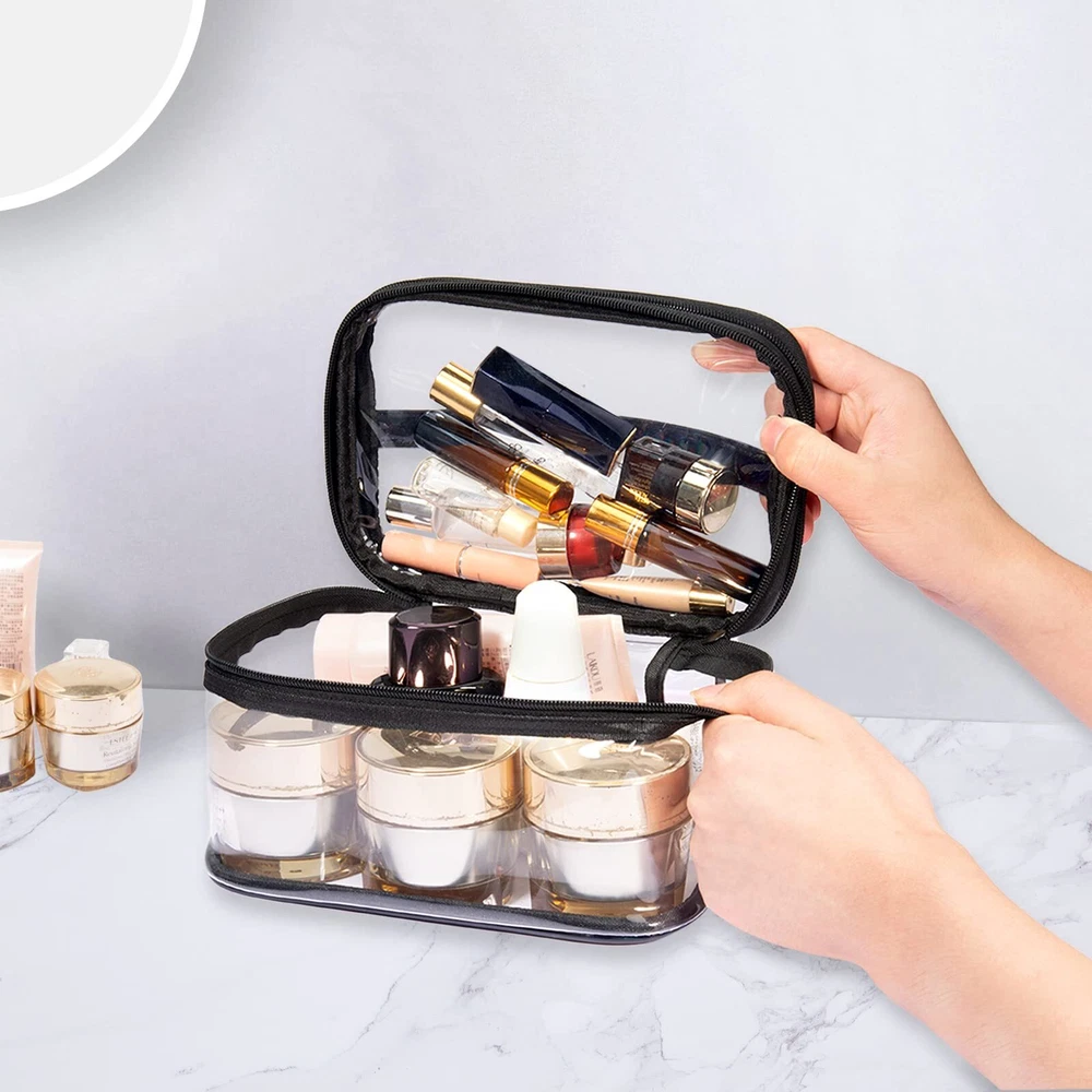 This makeup bag is a game-changer! The double-layer design keeps everything organized—brushes, liquids, and dry products stay separate. The clear PVC makes it easy to spot what you need, and the water-resistant material keeps spills from ruining your stuff. Perfect for travel or daily use, it holds so much without being bulky. Love how sturdy and stylish it is!
