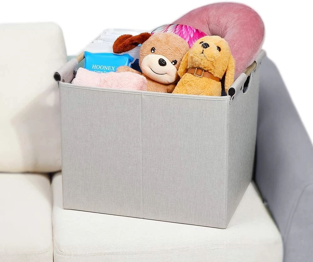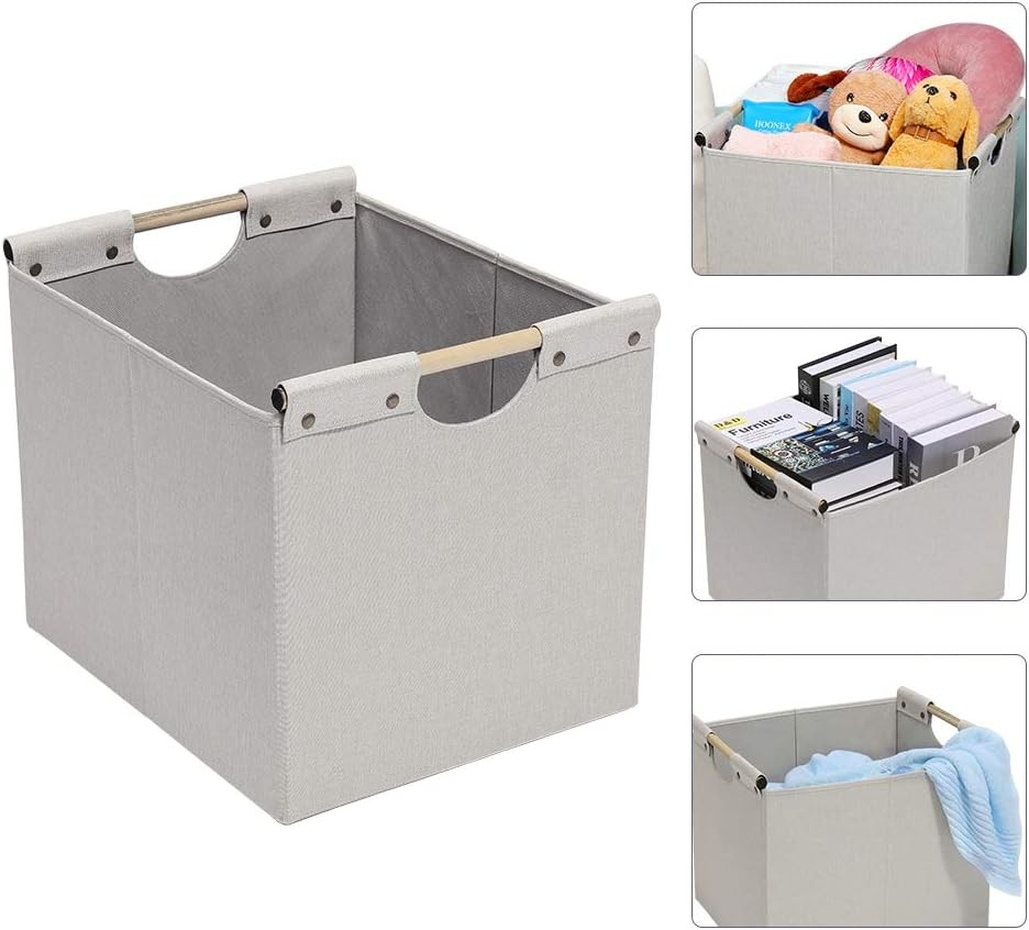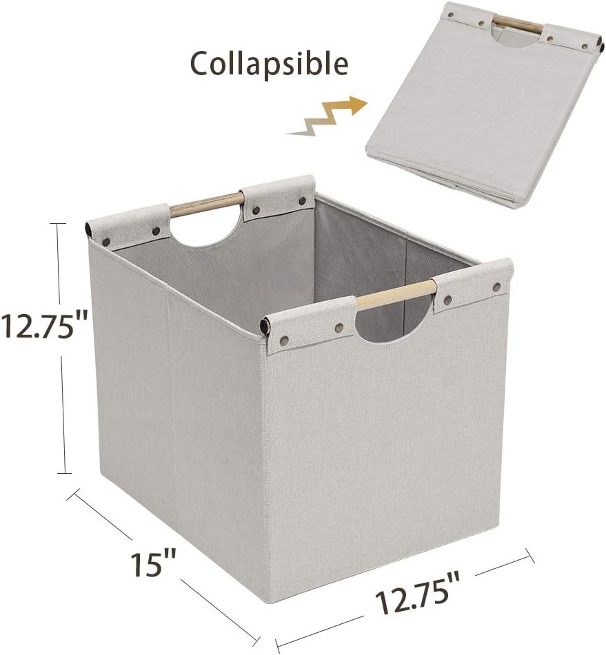 Linen Imported Materials and Dimensions: measuring 12.75" H x 12.75" W x 15" L, these durable foldable storage bins are made of top-grade lightweight linen fabric, with a 2.2 mm pressboard base insert to maintain shape and strength. Carrying Handles with Comfortable Grip: round wooden stick handles make the linen fabric storage baskets easy for you to carry room to room or trunk to hotels. Versatile: capable of organizing all your personal property in any room of the house. Toys in the kids' room, clothes in the bedroom, books in the study, diapers in the nursery, laundry in the bathroom, or even year-long storage in the attic. Space-Saving Design: on the floor, in the closet, on the bookshelf, or on the desk, these boxes can be used in a variety of places. When not in use, they can be folded flat for convenience. Sturdy: each single storage bin weighs 2 lbs, the sturdy structure makes it hold up to 50 pounds, while the superior fabric quality ensures that the box has the strength to bear.