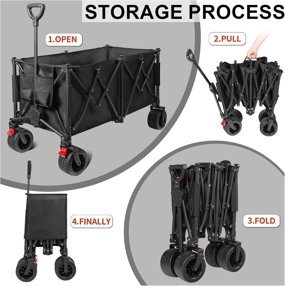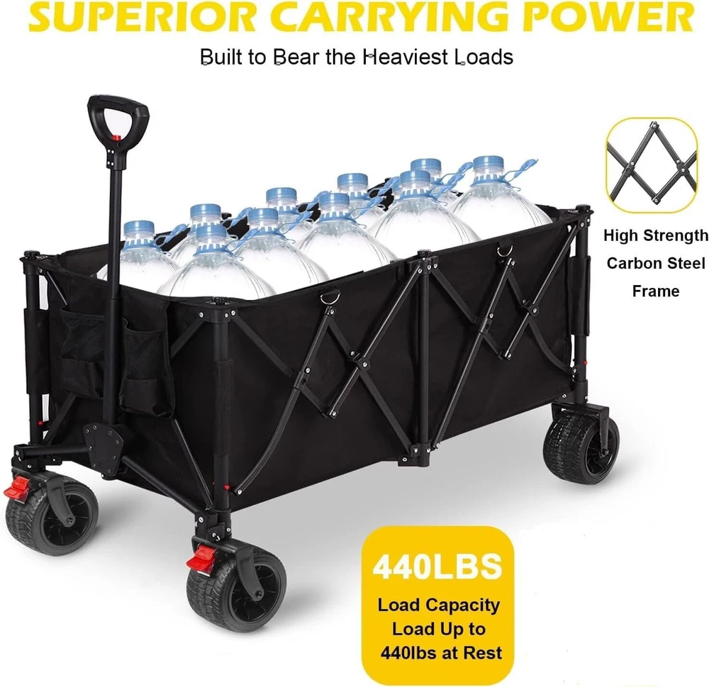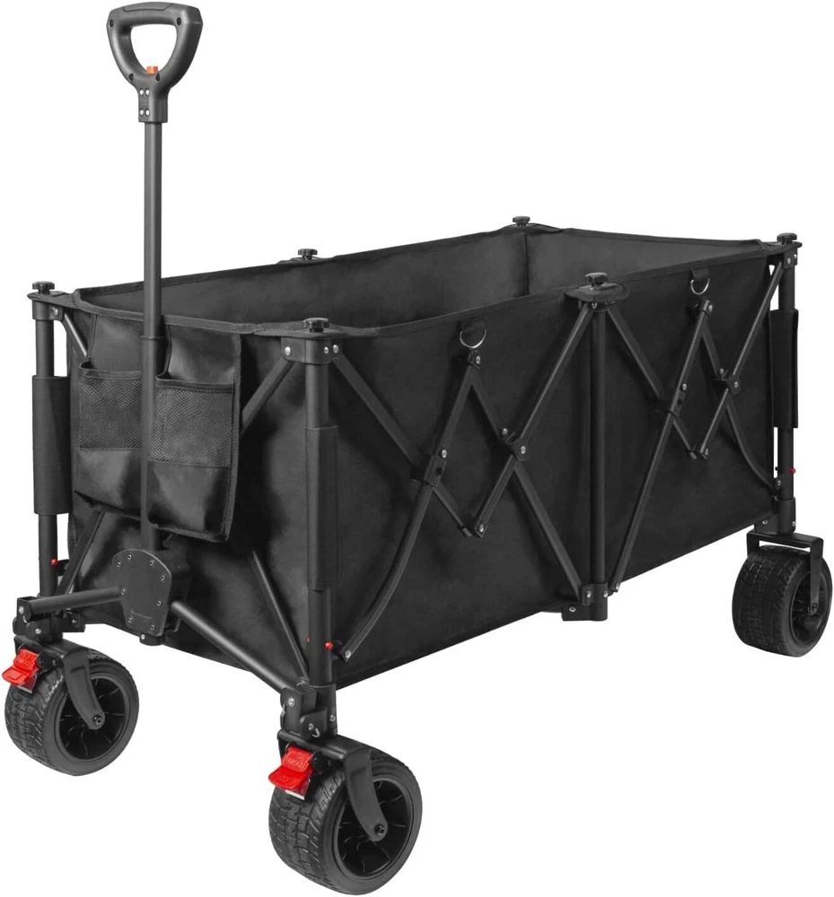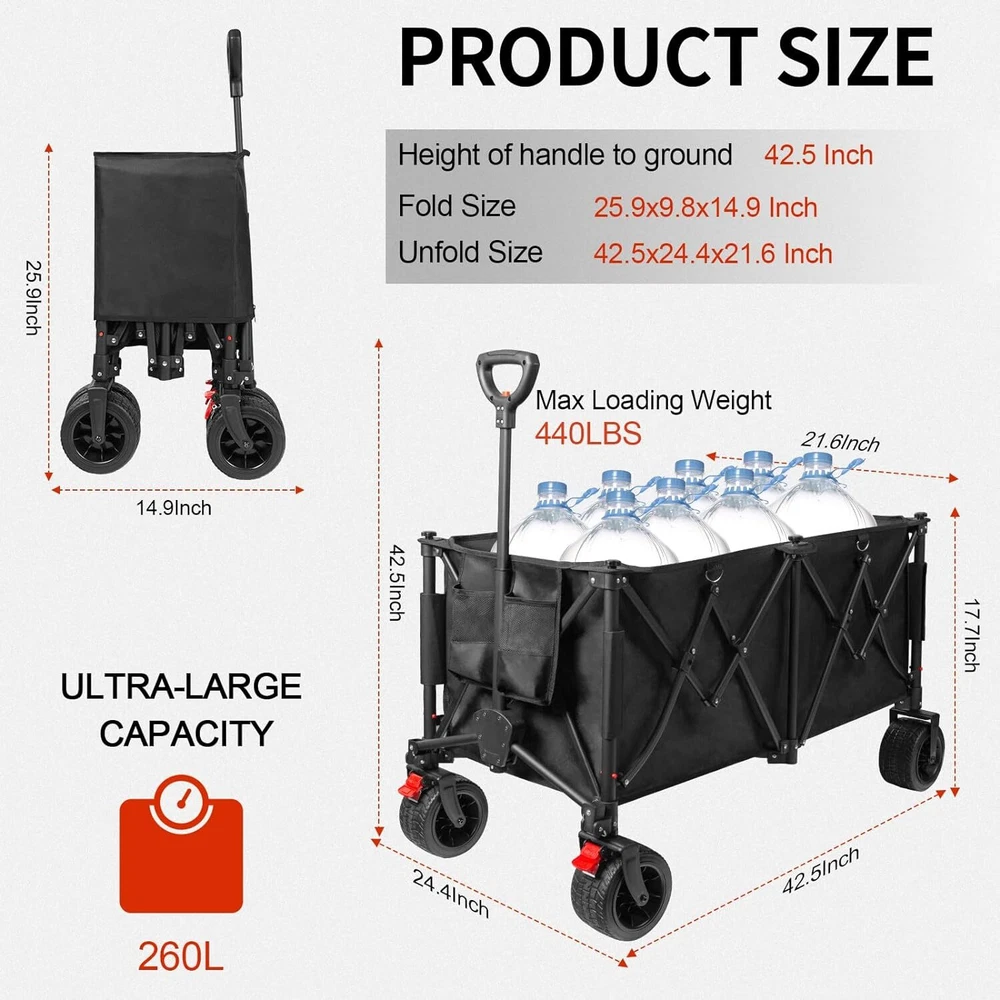 Description Features: Large 300L carrying capacity, this foldable wagon is a perfect cart for carrying all goods. Max loading weight is up to 440LBS. Big Size 4 inch Width Detachable Wheels and Two brakes-Our folding wagon cart equipped all-terrain off-road wheels that are thickened and mud-resistant, making it the perfect choice even in muddy road condition. The angle-adjustable handles provide ergonomic comfort during use, while the 2 brakes on the front which stop the cart easily when not in use. Solid and Durable-Made of a heavy-duty iron frame, the structure welded is absolutely , and it will not fade and rust when used outdoors for a long time. Foldable and Compact-The fabric material is made of 600D Oxford fabric and PVC coating to , easy to clean. Multifunction uses-It's suitable for family outings, gardening, outdoor concerts and movies, sporting events, or anywhere you want, It's a great outdoor utility wagon as a camping wagon, fishing wagon, or pet wagon. Product Details: Product Dimensions: 42.5"D x 27"W x 24.5"H Brand: Prodico Material: Carbon Steel Color: Black Special Feature: Adjustable Handle, Heavy Duty, Collapsible, Foldable Handling We will ship all orders within 1 business day of payment. Delivery We Do Not Ship Outside of the Continental US. Return Policy All items qualify for returns within 30 days of receipt. Buyer is responsible for return shipping on any item that is not damaged. Feedback We take our reputation seriously, we buy and sell online, so we understand the value of trust. If you are unsatisfied with your order, please contact us and we will work with you to resolve it to your satisfaction.