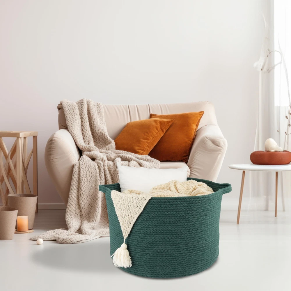 Multi-purpose Extra-large Blankets Basket: Our Large woven rope basket for storage originally designed as a Blanket storage basket, blanket holder or clothes basket for storage but can be used for more. You can use it as large laundry basket, regular large storage basket, toy basket for kids, baby toy storage basket bin, towel baskets for bathroom, throw pillow basket, and more. Safe and durable decorative storage basket or woven storage basket: We use heavier and non-toxic coiled cotton rope to ensure the quality of this large rope blanket basket. These round rope baskets or laundry basket are safe for both people and pets. You can use it as baby or dog toy basket. They are odor-free and soft, making them foldable and easy to store. Designed to complement your room and decor: We have carefully selected classic solid colors for these rope basket bins for laundry or blanket. With these colors, the baskets for blankets will look good in any room of your home. These round rope blanket storage baskets enhance any room or decor. It is perfect for bedrooms, bathrooms, and dorm rooms. These aesthetic rope baskets for bedroom are essential items for your daily storage needs, helping keep your room clean and organized. Toy storage basket for kids with handles: This round rope basket is Featuring long and sturdy handles for easy mobility, this round rope basket is perfect for storing toys and doubles as a pet toy basket, suitable for dog toy storage. It also serves as a convenient toy basket for kids or baby nursery basket. Crafted from soft cotton rope, the cloth basket ensures safety with no sharp edges, preventing scratches on your furniture or floors. Note: Blankets basket comes folded and may have creases. Fully fill the rope basket with towels or clothes and wait for 1-2 days will help reshape the blanket basket. Alternatively, use steam or ironing for a quick reshape the laundry basket. The rope basket is machine washable; simply put it in a wash bag for delicate items and air dry.