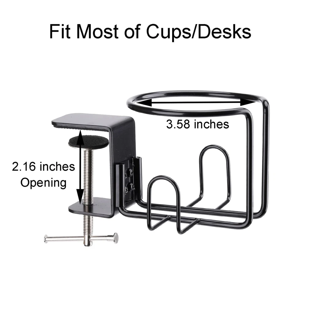 Package includes: 1 x clamp cup holder Fit Most Cups: Cup holder measures 3.58 inches in diameter, wide enough to hold most cups, cans, bottles, tumblers, mugs with handle, etc. Strong Clip: Thick metal clamp with 2.16 inches opening, will not move after it attaches to desk, even 50oz bottle on. Anti-Rust/Anti-Scratch: The drink holder is made of thick 304 stainless steel material with plating finish, and the metal clamp with thick baking finish, will not rust, can last for years. Also the clamp with non-slip mat will not scratch the surface of desk. Two Mounting Modes: Vertical mounting mode for desktop; Horizontal mounting mode for desk leg. Choose the mode when you install. Anti-Spill: Put your drinks on the side of your desk, no worry about spilling drinks when you work or play. it also frees up your desk space and keeps desk clean and neat.