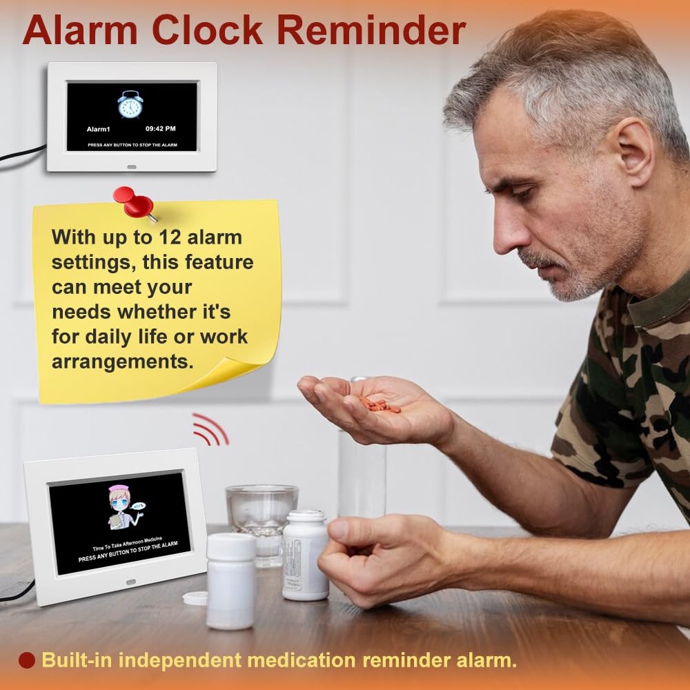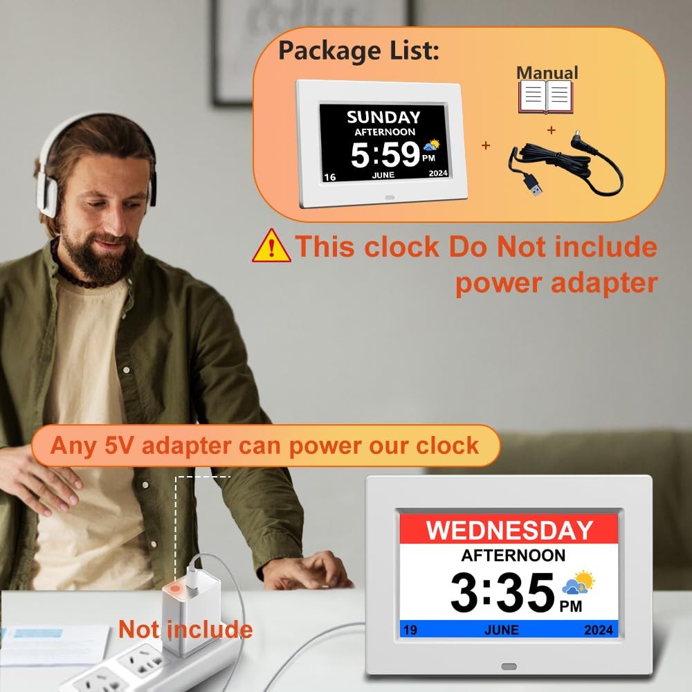 Note: To lower your purchase price, we have cancelled the power adapter. You can use any USB power adapter with an output of 5V/1A or 5V/2A, such as your idle phone charger, to power the clock by connecting our power cord Product Feature Non-Abbreviated Day & Month, Year, Week, Time, Illuminated, Alarm, Auto Dimmable, Calendar Display Latest 3 time display interfaces : Elderly clock; Wall clock; Colorful clock Power source: Corded Electric Package list: 1 pcs clock 1 pcs USB to DC cable ( Not power adpater!!) 1 pcs manual ⏰【No power adapter !!!】To lower your purchase price, we have cancelled the power adapter. You can use any USB power adapter with an output of 5V/1A or 5V/2A, such as your idle phone charger, to power the clock by connecting our power cord【Multi-Displays: Elderly Clock, Wall Clock and Colorful Clock】With 3 displays, each display meet the needs of different people: Elderly Clock is specially designed for our elderly, with [large non-abbreviated font] [Date, Year, Month and Time]display, which is convenient for the elderly to read; Wall Clock , Colorful Clock is a color display, suitable for young and small children ⏰【 Large Font and High Contrast Display】 very convenient for the elderly to read, Soft light, without blue light, no eye injury ⏰【Automatic Brightness Function】brighten during the day, display clearly under strong light, darken at night, avoid disturbing sleep ⏰【12 ALARMS and 3 Medication Reminder】Can be set up 12 daily alarms for daily meals,appointment,exercises,feed pets,go to the bathroom,drink water ,taking and 3 groups medications remainds.This dementia clock you can choose repeat or no repeat.It is Dementia clock,digital wall clock or digital clock ⏰【With Picture and Video Playback Function】 it can be used as a digital photo frame, always share beautiful pictures