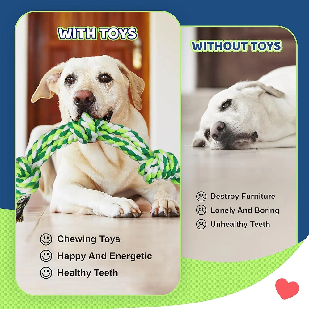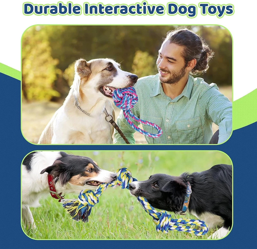 🐶【Most Complete and Value Dog Rope Toys Set】Designed for medium and large dogs.Larger, thicker, and more durable than other toys. Includes (20 inch) 4-knot long rope, (24 inch) 5-knot long rope, Two 19-inch heavy-duty tug-of-war dog toys, Two hand-held round rope ball dog toys, Two 2-KONT ropes, and One ball toy. The variety of styles and bright colors can stimulate the dog's senses and encourage the dog to play actively and be mentally engaged. 🐕【Dog Rope Toy For Aggressive Chewer 】Durable dog chew toy set is made of high-quality natural cotton, tightly woven, wear-resistant, and sturdy construction allowing the dog toy to withstand rough play and aggressive chewing. Say goodbye to flimsy toys that easily fall apart. 🐶【9 PCS Multi-Style Design 】Multiple styles and colors for dogs to choose from. Whether your dog likes to chew, chase or tug, our rope toys have it covered. Its versatile design allows for a variety of play styles. And is suitable for dogs of all sizes and great for playing outdoors or indoors. Allow your dog to find fun in interactions, reduce your dog's boredom, and improve your relationship with him. 🐕【Safe and Protect Dental Health】GASAPET Dog toys are woven from 100% high-quality washable cotton material. Safe, non-toxic, and free of harmful chemicals. It can keep your dog's teeth clean and healthy with our rope toy. The textured surface helps to massage gums and remove plaque and tartar buildup as your dog chews and plays, promoting better dental hygiene and fresher breath. 🐶【Best Gifts for Dogs】Colorful and multi-style design, is perfect as a birthday and holiday gift for your dogs. It's more than just entertainment, it's also a means of exercise that helps keep our canine companions healthy. Dog rope toys are consumable and not truly indestructible. If your dog is a very aggressive chewer, we recommend play with supervision. If you are not satisfied with the use, you can contact us at any time and we will respond within 12 hours. Product Description Most Complete and Value Dog Rope Toys Set Designed for medium and large dogs , also suitable for aggressive chewer s. Multiple styles and colors for dog to choose from. Whether your dog likes to chew, chase or tug , our rope toys have it covered. Its versatile design allows for a variety of play styles . And is suitable for dogs of all sizes and great for playing outdoors or indoors Includes and dimensions: One 5-knot long ropes (24 inch) One 4-knot long ropes (20 inch) Two heavy-duty 3-kont double ropes(19 inch) One hand-held round rope ball(15.7 inch) One round rope ball(7.8 inch) One ball toys (3.2 inch) Two 2-kont chew ropes (11.8 inch) .