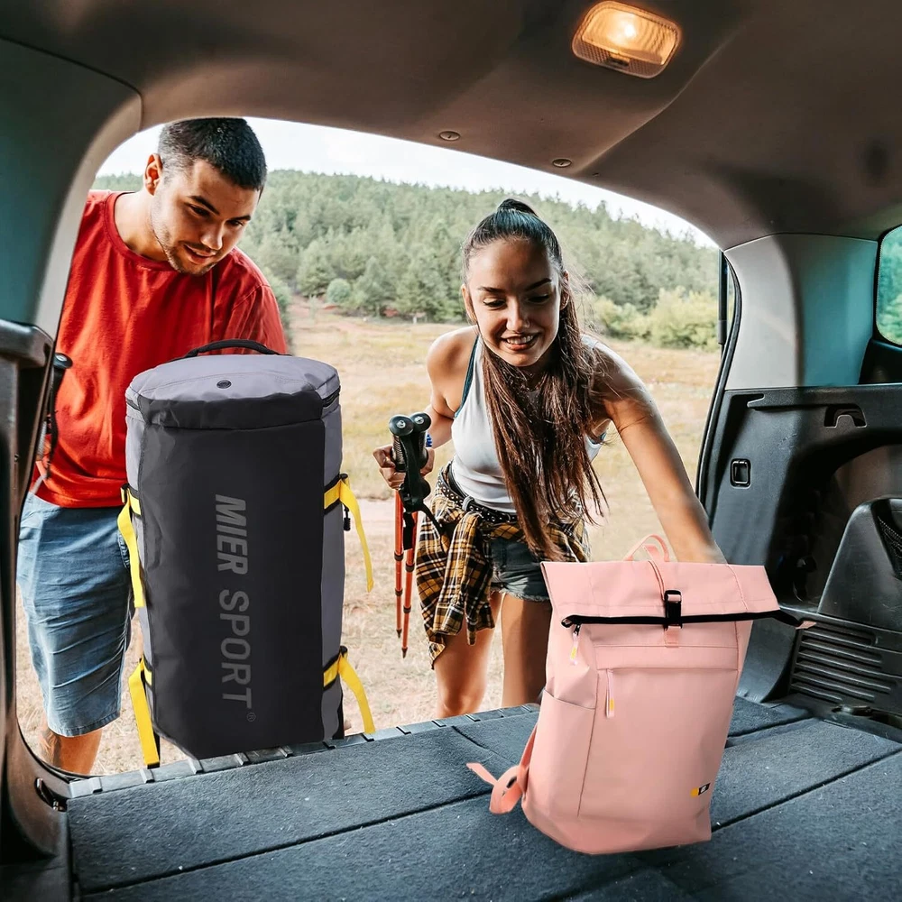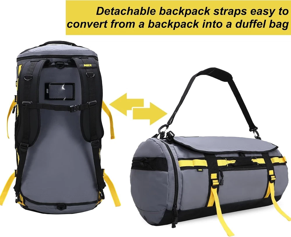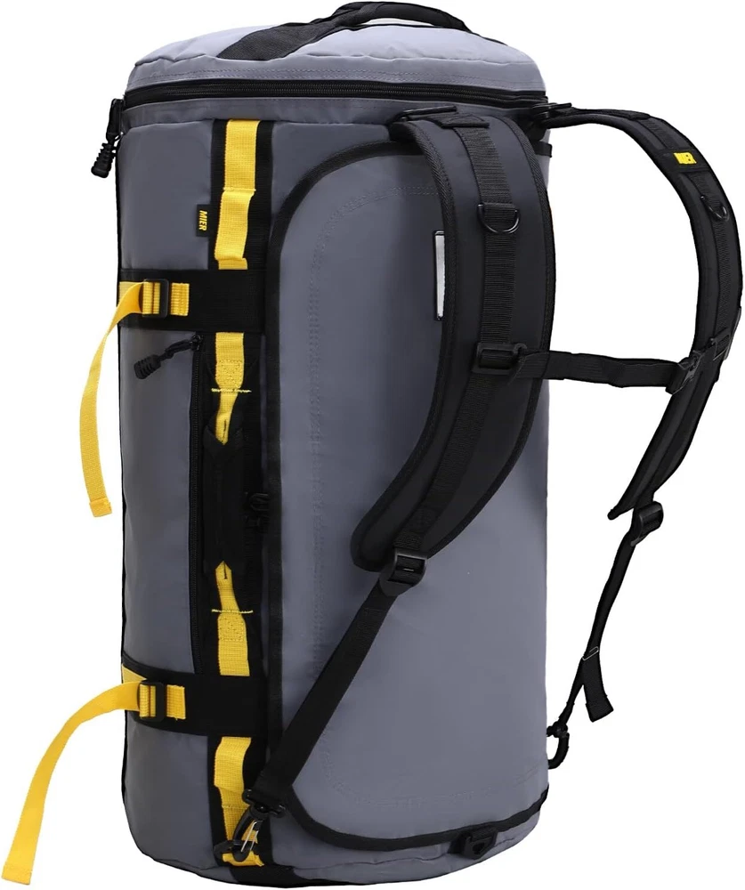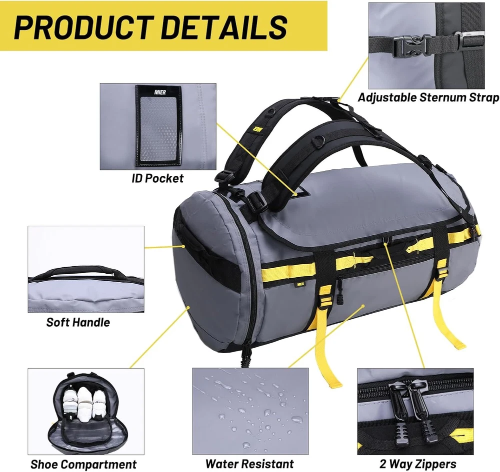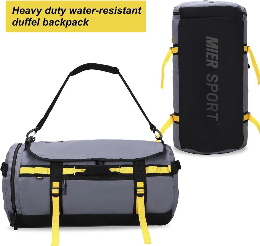 About this item Duffel Bag or Backpack? ---- You can own them all at once! MIER sports duffel designed with adjustable backpack straps which are easily attached or detached, adjustable sternum straps ensure suitable place to wear, also has an adjustable/removable shoulder strap and 4 sides soft haul handle for multiple carrying ways Multifunctional Pockets ---- D-zip opening with a weather-resistant zipper flap included 1 big mesh pocket with 1 key loop inside, 1 inner zipper pocket and 1 open pocket; Outside: 1 zipper pocket on the front, 1 big side zipper compartment included a shoes compartment with mesh ventilated and 1 pocket for toiletries and towels; Water-resistant ID pocket on top Water Repellent Duffel ---- Built from heavy-duty water resistant tarpaulin and reinforced double layered tear-resistant floor panel, designed for harsh environments and features huge capacity to hold your workout gear or your trip stuffs. Best for hiking, camping, climbing, gym sports, car trip, traveling or other outdoor adventures Functional Construction ---- Daisy chain loops and "D" rings on strap for extra attachments; Innovative compression strap system helps compact large loads; Smooth "MIER" brand zipper and strong buckles, box-stitched on every stress points, being more durable and tough, make MIER bag ready for a lifetime of adventures Different Capacity ---- 45L: Airline carry-on size. Great size for a gym/fitness/sports bag or for shorter weekend trips. 60L: Designs for 5-7 days trips/camping/adventure. 90L:Designs for travel over a week/camping/adventure for more bulky sports gear Product Dimensions 13 x 23.2 x 13 inches Item Weight 4.2 pounds Department unisex-adult Country of Origin China Item model number 10110033-6081-S01