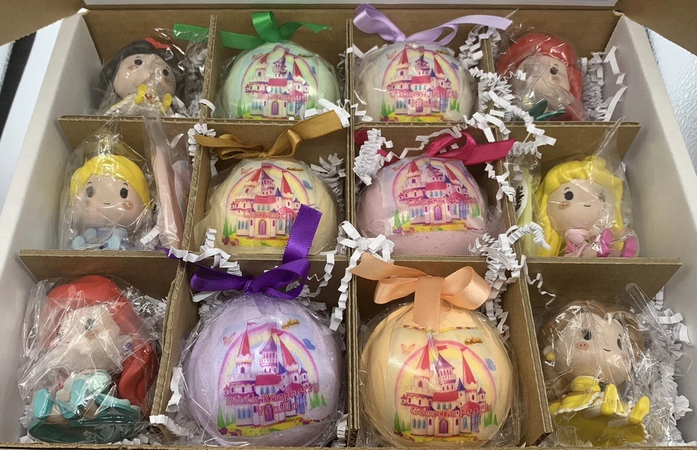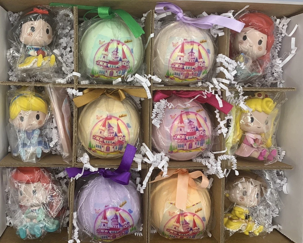 Large Fairytale Princess Figurines 6-pack Bath Bomb Gift Set. Includes six (6) XL 5.5 oz bath bomb fizzies and six (6) Fairytale Princess Figurines. The Fairytale Princess Figurines are too large to fit inside the bath bomb, so they are loose inside the box next to the bath bombs. The fragrances in this gift set include Black Raspberry Vanilla, Bubblegum, Cherry Vanilla, Clementine, Georgia Peach, and Oatmeal, Milk & Honey. (As we make more bath bombs, we will be adding other fragrances to this gift set.) We also include two (2) Goat's Milk & Shea Butter handmade castle soaps. PREMIUM QUALITY - Handmade in Arbor Vitae, Wisconsin. Natural and organic. Comparable to Lush Bath Bombs, ours are 5.5 oz each. PERFECT GIFT IDEA - Includes six (6) XL 5.5 oz bath bombs and six (6) Fairytale Princess Figurines loose inside the box. The Fairytale Princess Figurines are too big to fit inside the bath bombs. The Fairytale Princess Figurines come individually wrapped inside a clear cello bag. NATURAL, VEGAN, ORGANIC, cruelty free. Made with luxury ingredients including Shea, Mango & Cocoa Butter that will help leave your skin feeling soft and smooth. SATISFACTION GUARANTEE - We want you to be happy with your gift set. The fragrances in this gift set include Black Raspberry Vanilla, Bubblegum, Cherry Vanilla, Clementine, Georgia Peach, and Oatmeal, Milk & Honey, but we will be adding other fragrances to this gift set in the near future. Shipped via the cheapest rate I can find! USPS Ground Advantage, priority mail, UPS, etc. Check out my website for other gift sets for kids.