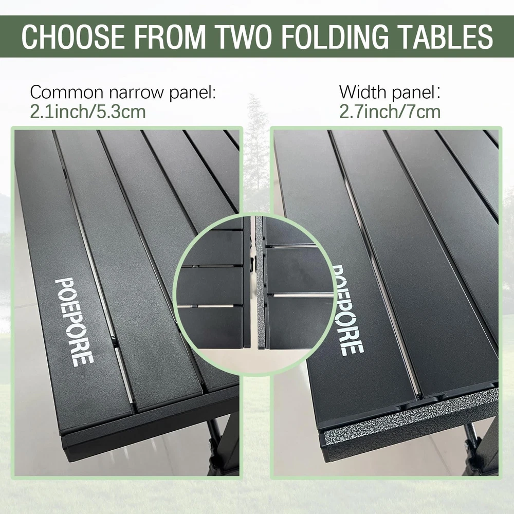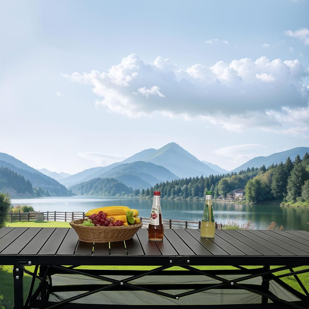 Product: Aluminum Folding Camping Table with Storage Color: Black/Sliver/Natural Open Size: 55.1*27.5*27.5 inch Fold Size: 34.53*10.23*10.23 inch Weight: 18.74Ib Max capacity: 176 Ib Material: aluminium alloy Frame:steel tube Package Includes: 1*camping table+1*Mesh storage bag+1*Carry bag Suitable for: Camping,beach,picnics,garden,picnic,BBQ,party,backyard Features: waterproof, rust resistant, corrosion resistant, large storage space, foldable, easy to carry Suitable for 4-6 people:camping table measures 55.1*27.5*27.5 inches when unfolded and 35.4*10.2*6.3 inches when folded. It weighs 18.74 pounds. It can accommodate 4-6 people and is suitable for family and friends gatherings. Make sure there is enough room for everyone to eat together and have a good time. Sturdy:The top of the folding table is made of premium aluminum for portability, easy to clean. The table legs are made of sturdy steel pipe, use X frame to make the table more stable, providing enough support to carry up to 176 pounds. Extra storage space:This outdoor camping table comes with an extra mesh storage bag, providing more space to hold snacks, kitchen gadgets, books, and other items you might need. And when you don't need it, it can be quickly disassembled and stored away. Fast folding design:The folding design of the aluminum table makes it easy to set up and take down. The legs can be opened in a second with no effort. No tools are required for assembly, and you can build a stable folding table in no time. Portable and easy to carry:The Folding Camping Table is perfect for outdoor activities, such as camping, traveling, and beach outings, as well as indoor use. Made of lightweight aluminum alloy, this table is portable and easy to carry around thanks to its attached tote bag. It won't take up too much space in your car.