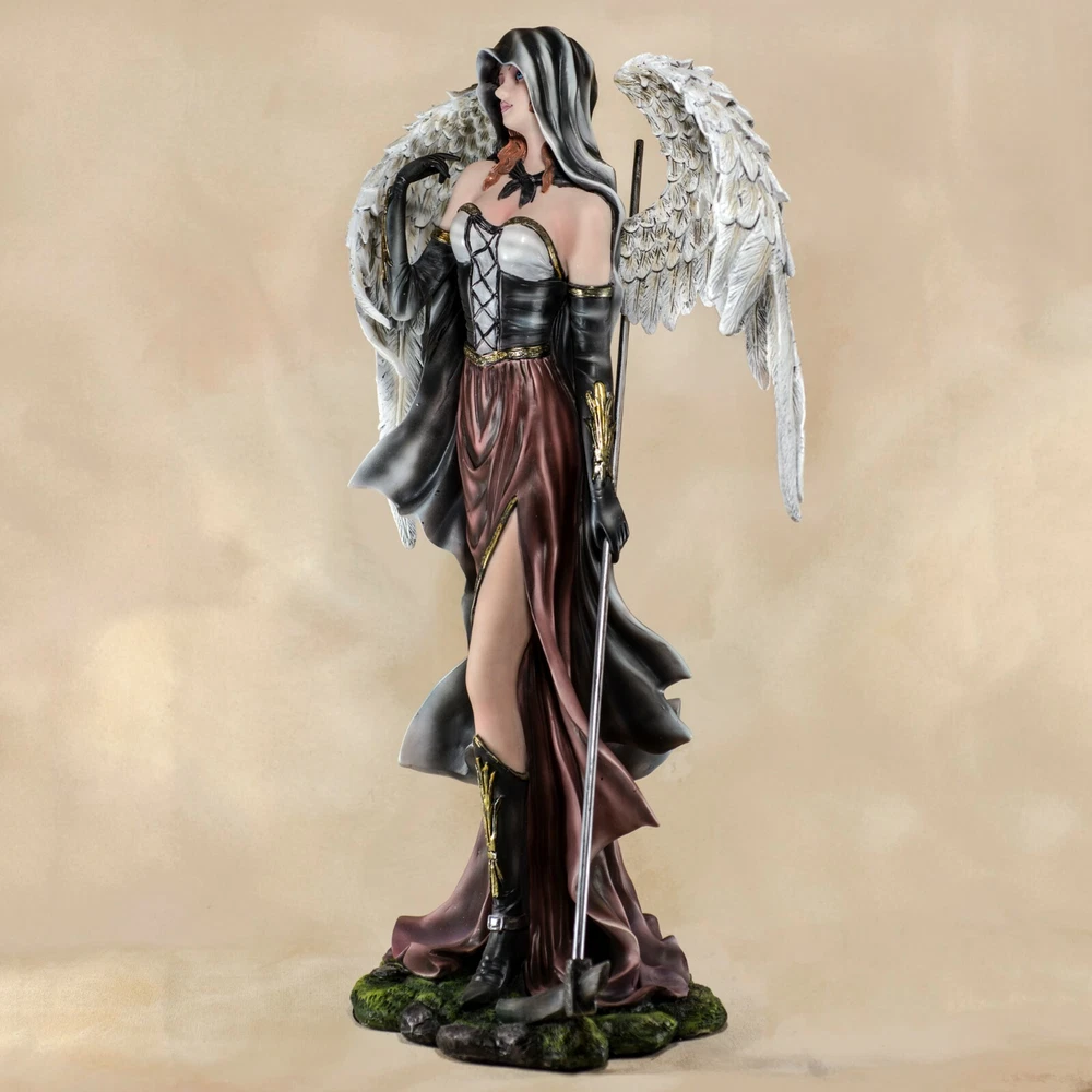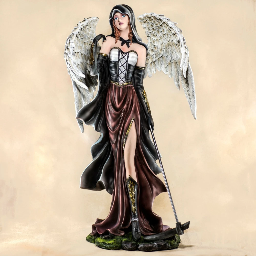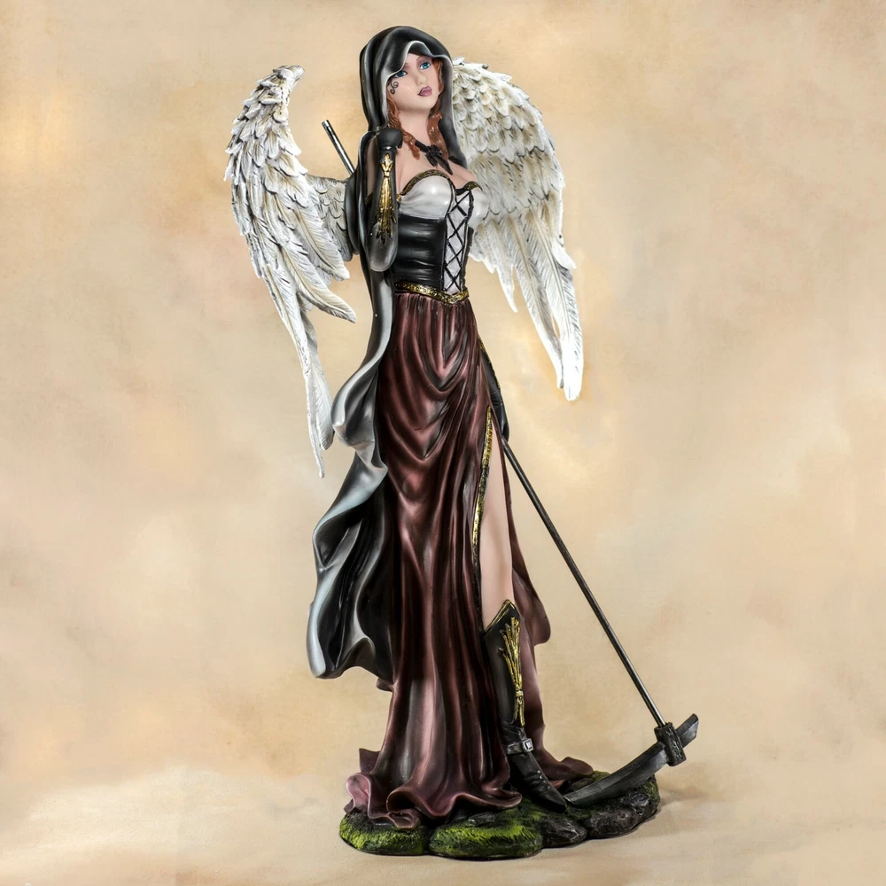 New Document Gothic Angel Figurine Description: Large scale gothic dark Angel of Death reaper with white feathered wings holding a scythe. She wears a black and white corset with long burgundy dress. The dress has a high slit up the side revealing her boot as she approaches on the grassy base. A black hood and black sleeves completes the look. Hand painted cold cast resin. - Height: 20 1/4 inches - Length: 7 1/4 inches - Width: 11 inches - Material: Polyresin