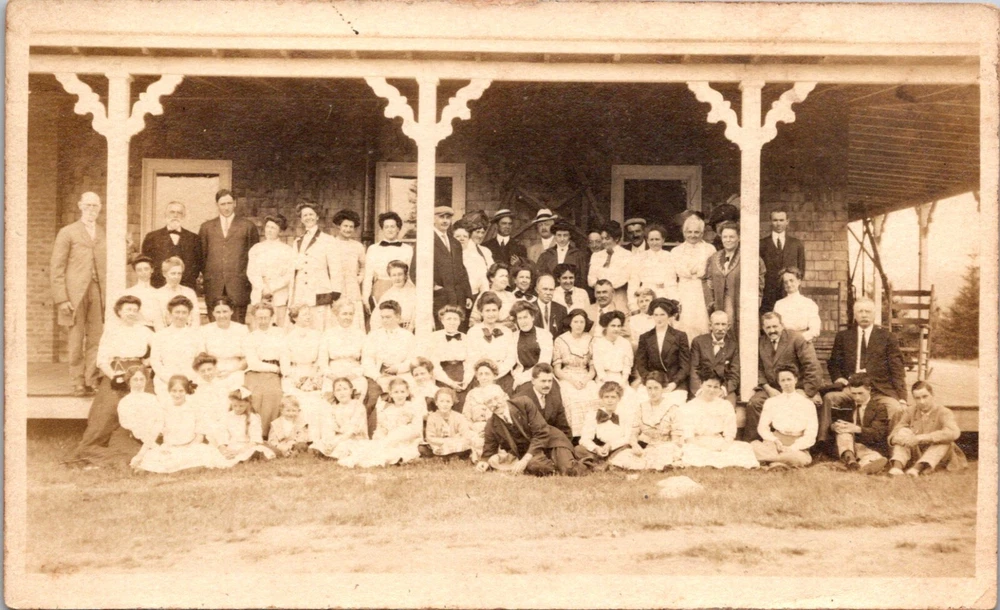 Large Group of People Sitting Outside a Store Front Vintage RPPC Postcard 24087 Front of Card: The image shows a group of people dressed in Western-style costumes, posing for a group photograph. The individuals are wearing cowboy hats, boots, and other Western attire, and some are holding musical instruments such as guitars. The setting appears to be indoors, possibly in a studio or a performance venue. The text on the image reads "Ken MacKenzie Bigger & Better Radio Revue." This suggests that the group might be part of a radio show or a musical performance group. It's an interesting snapshot, capturing the charm of Western-themed entertainment from the past. Back of Card: The image shows an old postcard with handwritten text. The postcard is divided into two sections: the left side for communication and the right side for the address. The text on the left side reads: "142 Lasalle Road Verdun P.Q December 19/11 Mr & Mrs Geo. H. Allen wish you a very Merry Christmas" The address on the right side reads: "Mr. Robert Spear Deep Brook N.S." The postcard also has printed text indicating where to place a one-cent stamp and instructions for inland postage. This vintage postcard offers a heartwarming glimpse into the past, capturing a holiday greeting from the early 20th century. It's interesting to see how people used to convey their festive wishes through handwritten messages on postcards.