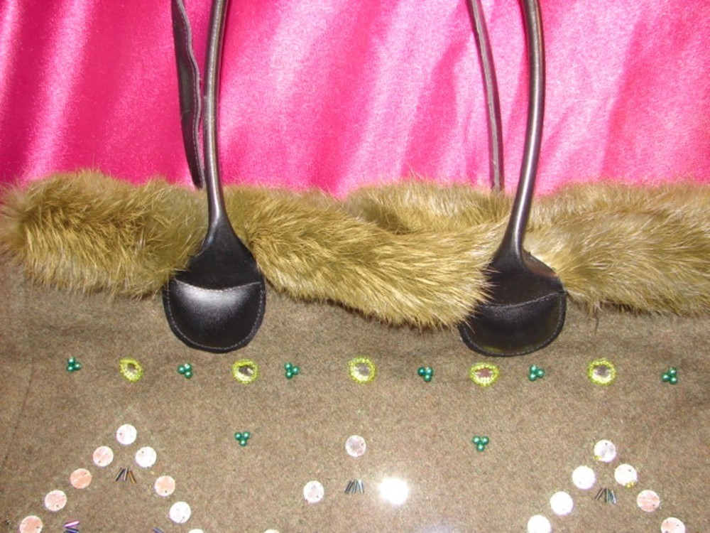 1007-08/SC#3bottom BEAUTIFUL LARGE HANDCRAFTED FUR TRIMMED WOOL HANDBAG WITH SEQUENCE > This is a Beautiful Handcrafted Handmade Wool with fur trim Purse or Handbag. It is green with a fur trim, and black leather like handles. It has a zipper compartment on the inside with a silk lining and a snap closure. It measures 10 1/2 inches tall not counting the handles that are approximately 9 inches. It is 14 wide , and the depth is 2 1/2 inches. It is in good new condition without a tag and comes form a Smoke Free Home. This Would be a Great to use or add to any collection. --> ~ ~ MORE HANDBAGS IN MY EBAY STORE ~ ~