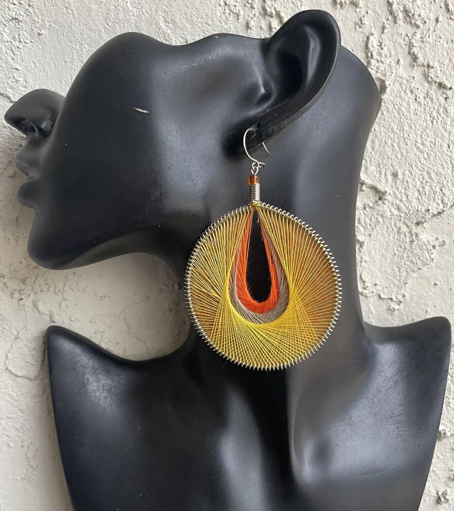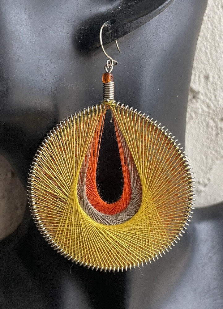 This listing is for a pairs of large round shaped yellow, grey and orange silk thread earrings. The earrings are made with thread and alpaca silver. Alpaca silver is an alloy of zinc, iron, nickel and copper. It is extremely lightweight and will not rust or tarnish. The earrings were handmade in Peru and are approximately 3 1/2" long with the ear hooks included. You will receive the earrings pictured. The earrings are for pierced ears. 0-ea-th-royelorggr-1