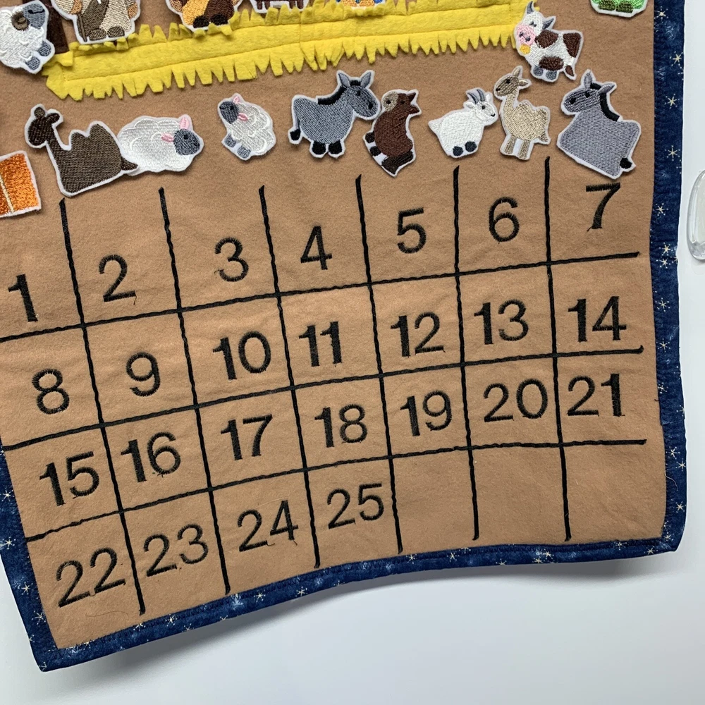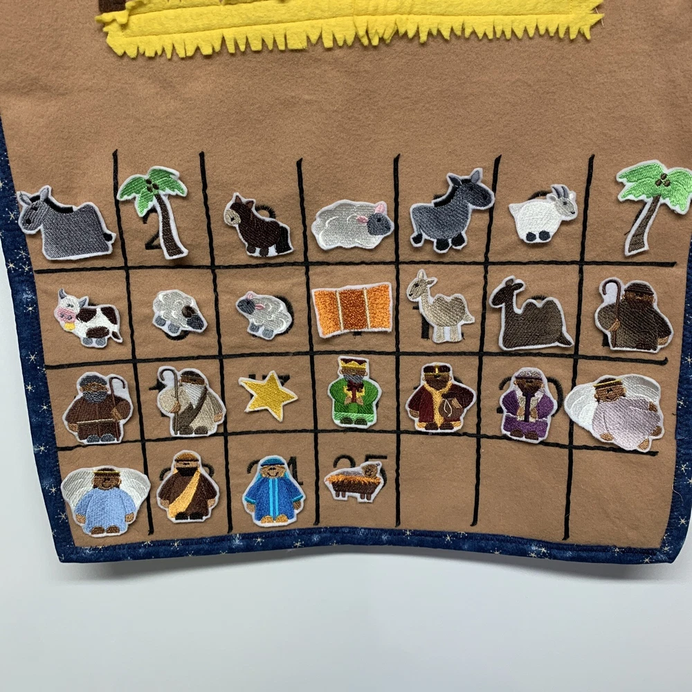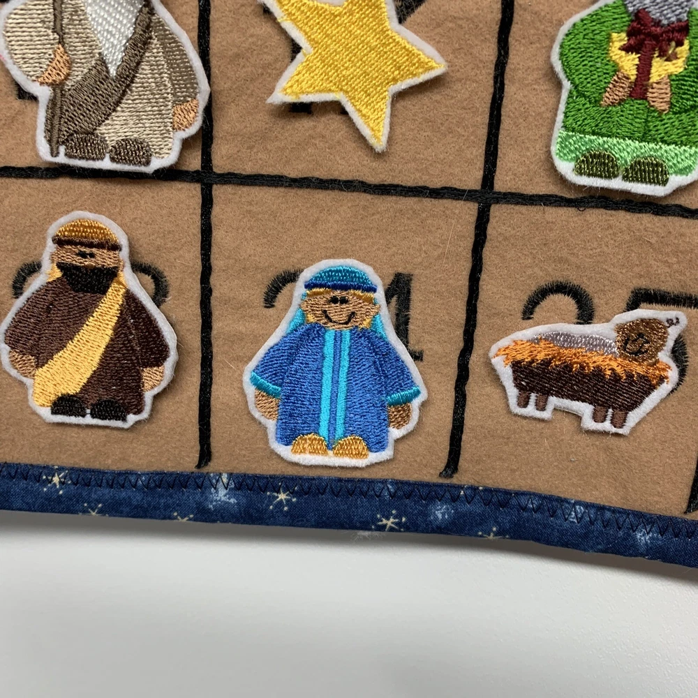Item Height: 27” Features: Embroidered Material: Cloth, Fabric Occasion: Christmas Size: Large Item Length: 18” Character Family: Holy Family Brand: Unbranded Type: Door Advent Calendar Color: Multicolor