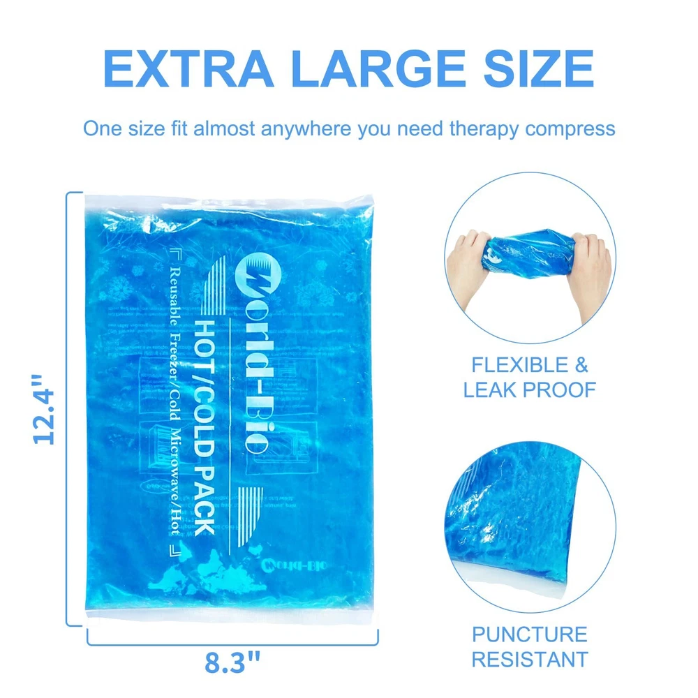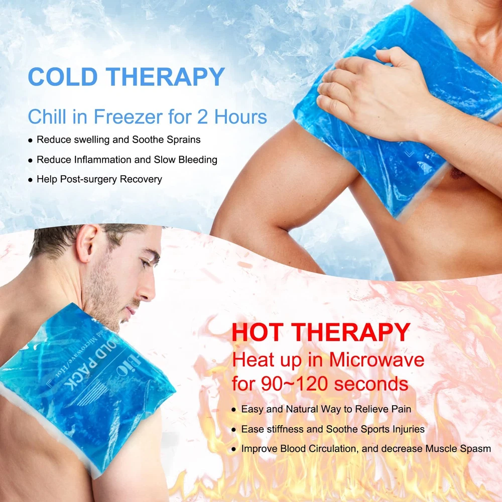 WHY CHOOSE US Adopt quality gel material, our ice gel pack stays ice cold for a long time and remains super flexible, even when frozen at 0 ⁰F. Ergonomically sized for all body areas. Use it as a hot pack or a soft ice gel pack for knees, head, neck, shoulder, arm, elbow forearm, leg, hip, thigh, calf, ankle, foot, and other body parts. These soft ice packs are recommended by physical therapists, sport doctors, and other medical professionals for muscle pain as well as recovery and rehabilitation after surgery. If you are suffering from Migraines, Carpal Tunnel Syndrome, Shin Splints, Heel Pain, Fibromyalgia, Arthritis, Tendinitis, Stiff Neck, Pinched Nerve, Bursitis, Tennis Elbow, Golfers Elbow, etc. you must try this product. It is a great gift for mom, grandma, daughter, son, or husband. ABOUT THE PRINCIPLE OF COLD AND HOT COMPRESSES COLD COMPRESSES:Cold stimulation of the skin and subcutaneous tissues is used to reduce pain, muscle spasm and inflammation. It is mainly used to reduce local tissue bleeding, pain and swelling, control the spread of inflammation, and cool down the temperature. HOT COMPRESSES:The use of heat causes vasodilation, congestion, and accelerated blood flow, enhances the aggregation of local leukocytes and their anti-disease factors, and achieves the purpose of inflammation subsidence. Directions: Cold Application:Store the gel pack in the freezer for at least 2 hours. Limit application of the gel pack to 15-20 minutes at a time, and then repeat every 1-1.5 hours interval. Hot Application (Hot water method): Immerse the gel pack in the boiled water for about 5 minutes. Wipe it off and insert it to the thinner cloth or fabric wrap for use. Hot Application (Microwave heating method): Put the gel ice pack into the microwaves. Heating for 90 seconds, or heating two times, each for 30 seconds. ICE PACK FOR PAIN RELIEF - Gel ice pack designed specifically for pain relief, good for sports injuries and daily pain. Flexible ice packs for injuries widely used for after surgery, swelling, inflammation, migraines, rotator cuff, lower back pain, hip replacement, arthritis, acute and chronic muscle pain, menopause hot flashes, and anywhere you need an icing compress. MORE GEL COLD PACK - With 780g gel, the gel ice bags for injuries reusable contain significantly more gel than competing gel packs. Stay colder longer for long time, great for people who need long-term cold compress. Recommended 15-20 minutes per use to prevent frostbite. Note: If you like very strong cold treatment, you can place it in the refrigerator for more than 6 hours. GEL ICE PACKS FOR INJURIES REUSABLE LARGE - Use professional-grade gel that remains pliable even when frozen. Soft flexible ice pack for injuries can be bent into the shape you want at will, malleable to curve over joint or limb, which provides better contact by conforming to any part of the body. One size fit almost anywhere you need cold compress. Large gel ice packs for injuries reusable great for back, knees, shoulders, hip, neck, ankle, legs, abdominal, etc. LARGE HOT COLD GEL PACK - Freezer gel pack for injury can be used for both cold and hot therapy, it makes alternating heat and cold easier, just stick them in the microwave or the freezer. Hot therapy for relax muscles, alleviate congestion, relieve menstrual cramps, ease stiffness. Cold compress for relieve aches, injury pains, reduce swelling, inflammation, slow bleeding. WASHABLE AND REUSABLE COLD PACK - Our large ice packs for physical therapy are double sealed to prevent leaking, soft, no-toxic, easy to clean with water and reusable. Conveniently store in fridge or freezer for daily use. Note: Smooth the gel with your hand before heating to distribute it evenly. Heat the front and back sides for 1 minute each, so that they are evenly heated. We provide good after-sales service, please contact us if you have any questions!