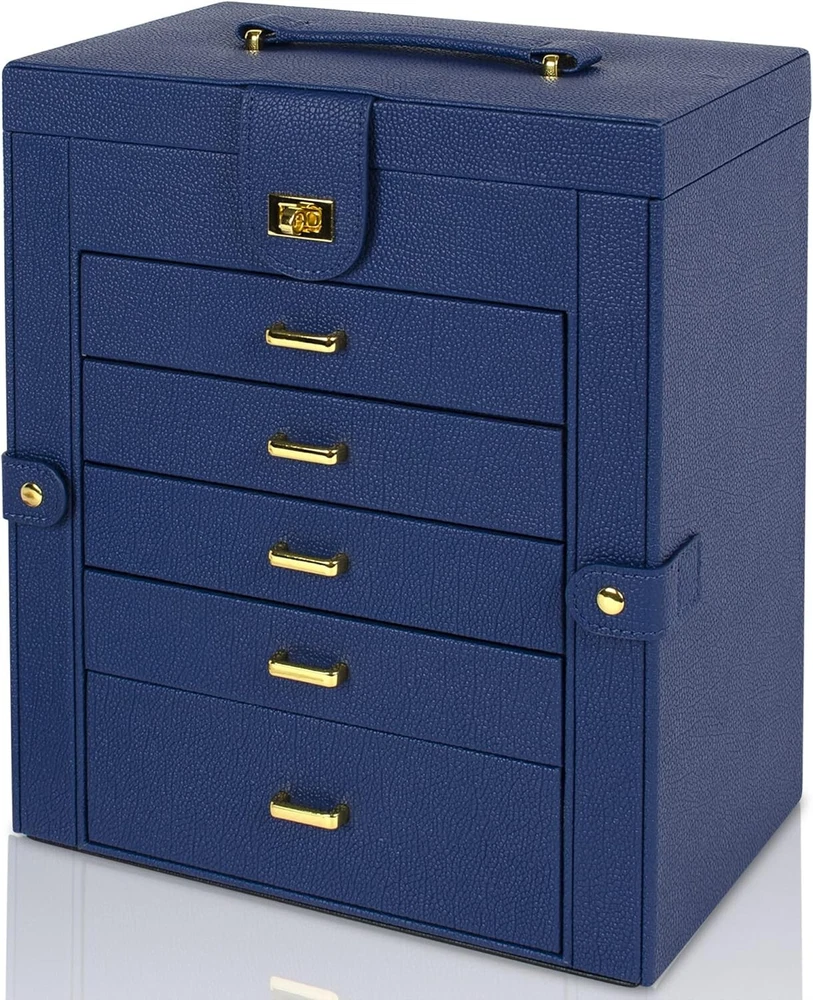 Elegant Durable, Attractive appearance with leather surface and soft velvet lining. Sturdy construction and quality material make it very durable. The jewelry holder can tidy your table and protect your precious jewelry for a very long time .Material: MDF(Medium Density Fiberboard),Velvet,Faux Leather LARGE CAPACITY, With 6 versatile pull out drawers, this jewelry box can store a lot of jewelry accessories, such as rings, earrings, necklaces, chains, bracelets, and so on. One deeper drawer is designed for sunglasses,watches or large jewelries Large Mirror Grab-and-Go Handle, This mirrored jewelry box comes with a built-in large mirror on top lid, making it easier to dress yourself. The lid has a ribbon attached to keep it from falling back. With a grab-and-go handle, convenient to carry around; delicate buckle catch for one-hand easy opening, easy to use and saving your time 6 LAYERS with 5 Versatile Pull Out Drawers 2 Hidden Side Cabinets, The two deeper bottoms of the 5 removable drawers has only one compartment; Drawer 1 has 20 equal size slots; Drawer 2 has 12 equal size slots; Drawer 3 has 4 equal size slots. The 2 Swing out Cabinets including 8 hooks and 2 pockets, help to keep your necklaces from getting tangled Nice Present, Jewelry Organizer is nice choice for Valentine's Day, Mother's Day, Thanksgiving Day, Birthday and Wedding. Suit for Mother, Girlfriend, Wife, Daughter and So On