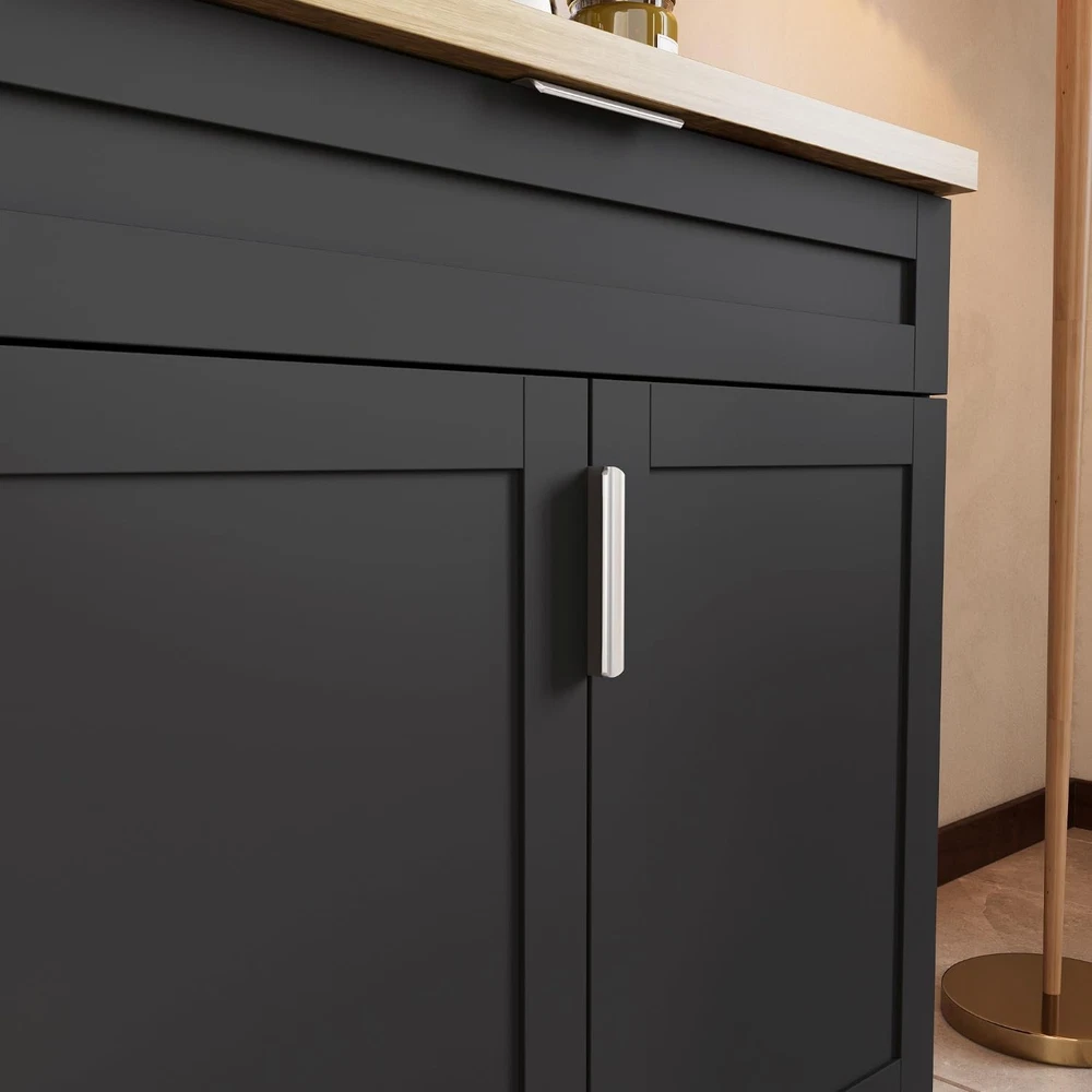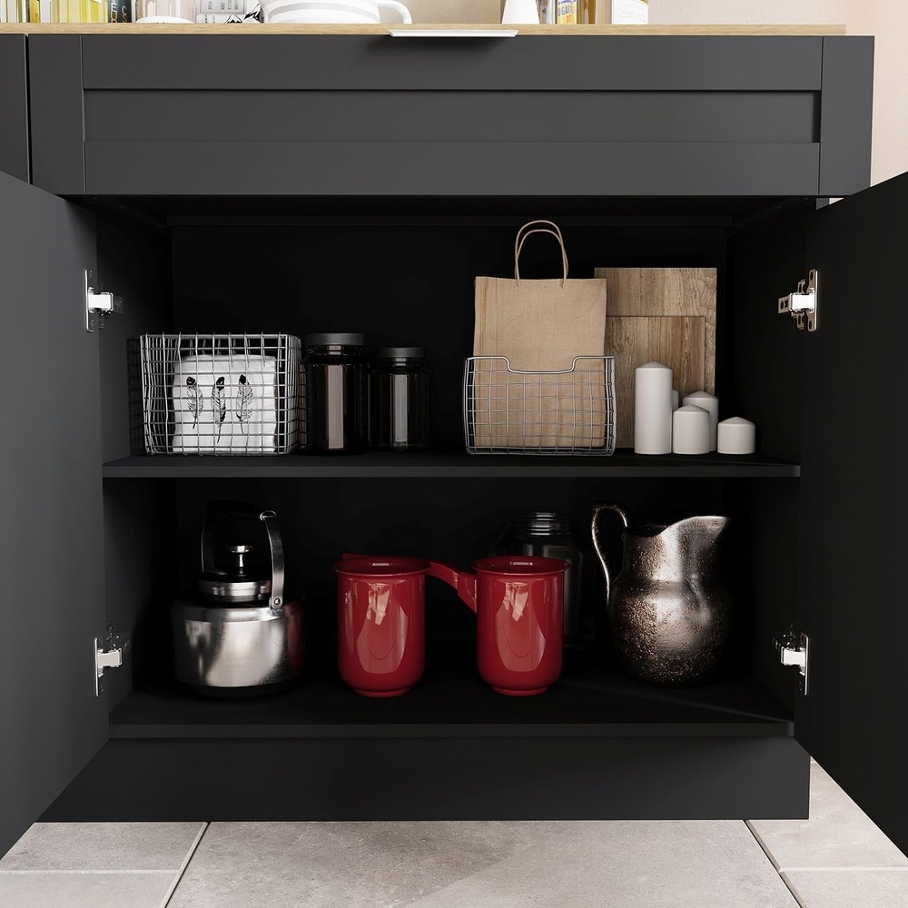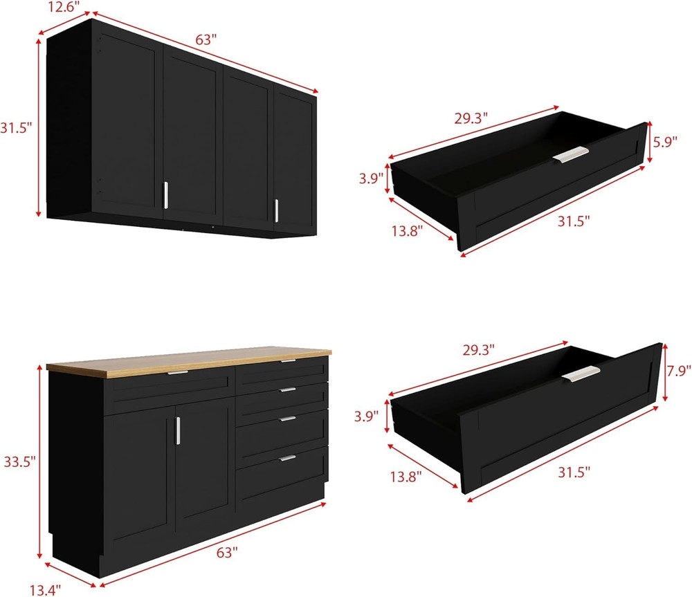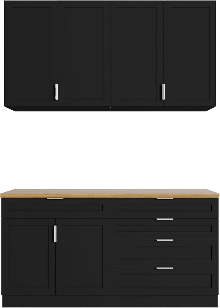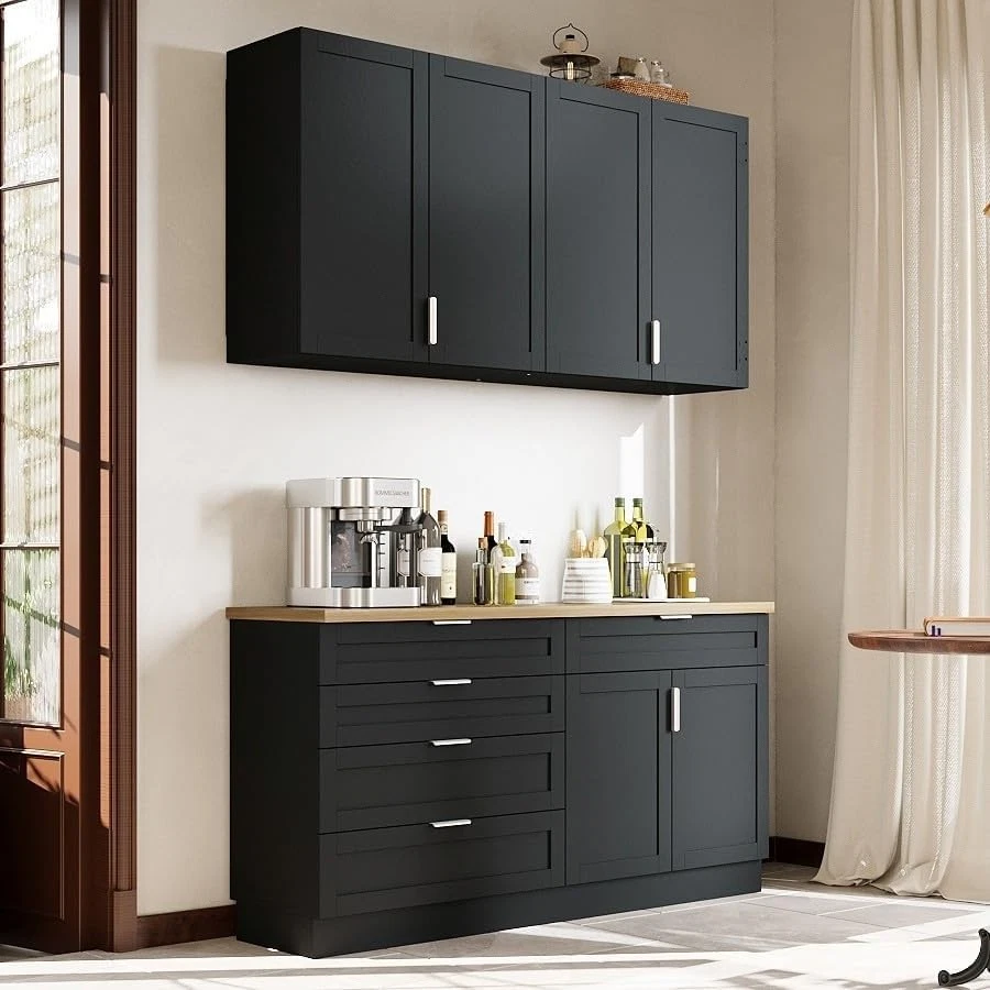 Product Description About this item Large Storage Capacity: This cupboard features 5 spacious drawers and 6 doors with 2 shelves behind each door for ample storage space. The well-organized interior with multiple levels ensures that cluttered items are neatly organized and easily accessible, maximizing storage capacity. It also keeps dust out, keeping your kitchen or dining area tidy and clutter-free. Sturdy and Durable Structure: This set of cabinets is made of high quality P2 Medium Density Fiberboard (MDF) material, which is not easy to corrode and deteriorate, and the overall cabinet structure is solid, and the plate has a strong load-bearing capacity that is not easy to be deformed and durable. Elegant and Functional Design: This cabinet set comes with smooth, silent-gliding drawer tracks, while the addition of metal handles on the doors and drawers is both attractive and easy to use. The sleek black finish with the slashed oak color complements any kitchen or dining room décor. Versatile and Multi-Scene Application: Ideal for a variety of environments, this cabinet set can be used as a kitchen pantry, restaurant cafeteria or coffee bar. The large drawers and cabinets allow you to place more items while protecting supplies from dusty finishes, and their split cabinet design allows for flexible placement to fully accommodate your space and needs. Easy to Assemble and Install: Comes with clear instructions and all necessary hardware for easy assembly. The user-friendly design ensures that you can quickly and easily install this versatile, high-capacity split cupboard. Kitchen Pantry Storage Cabinet Set with Wall Cupboard Extra Storage Space, Convenience and Beauty This split cupboard set combines both a wall-mounted cupboard and a free-standing dining sideboard for efficient use of space and strong storage capacity.Ideal for enhancing your home storage. Specifications: Material: P2 MDF Color: Black + Knife Chopped Oak Overall Dimensions: 13.4"D x 63"W x 33.5"H Handles Drawers Sturdy Hinged Connection Large Capacity Colour Black + Knife Chopped Oak Material P2 MDF Overall Dimensions 13.4"D x 63"W x 33.5"H Package Includes Cabinet Set with Wall Cupboard X 1, Instructions X 1, Anti-tip L Iron Sheet On Aug 15, 2025 at 01:10:36 PDT, seller added the following information: