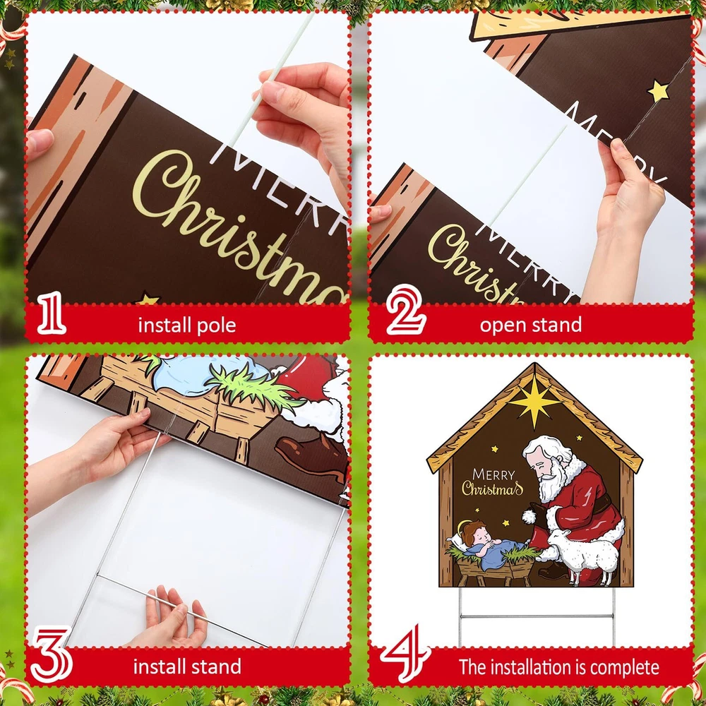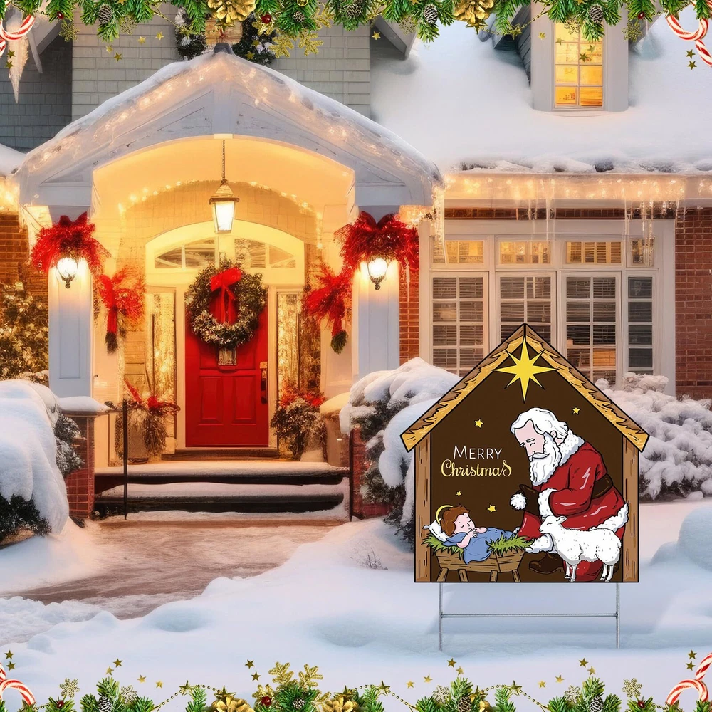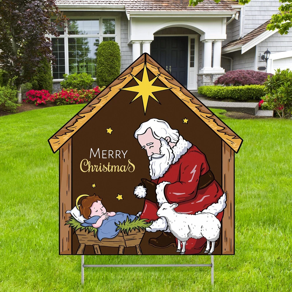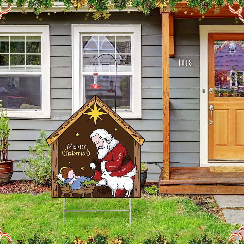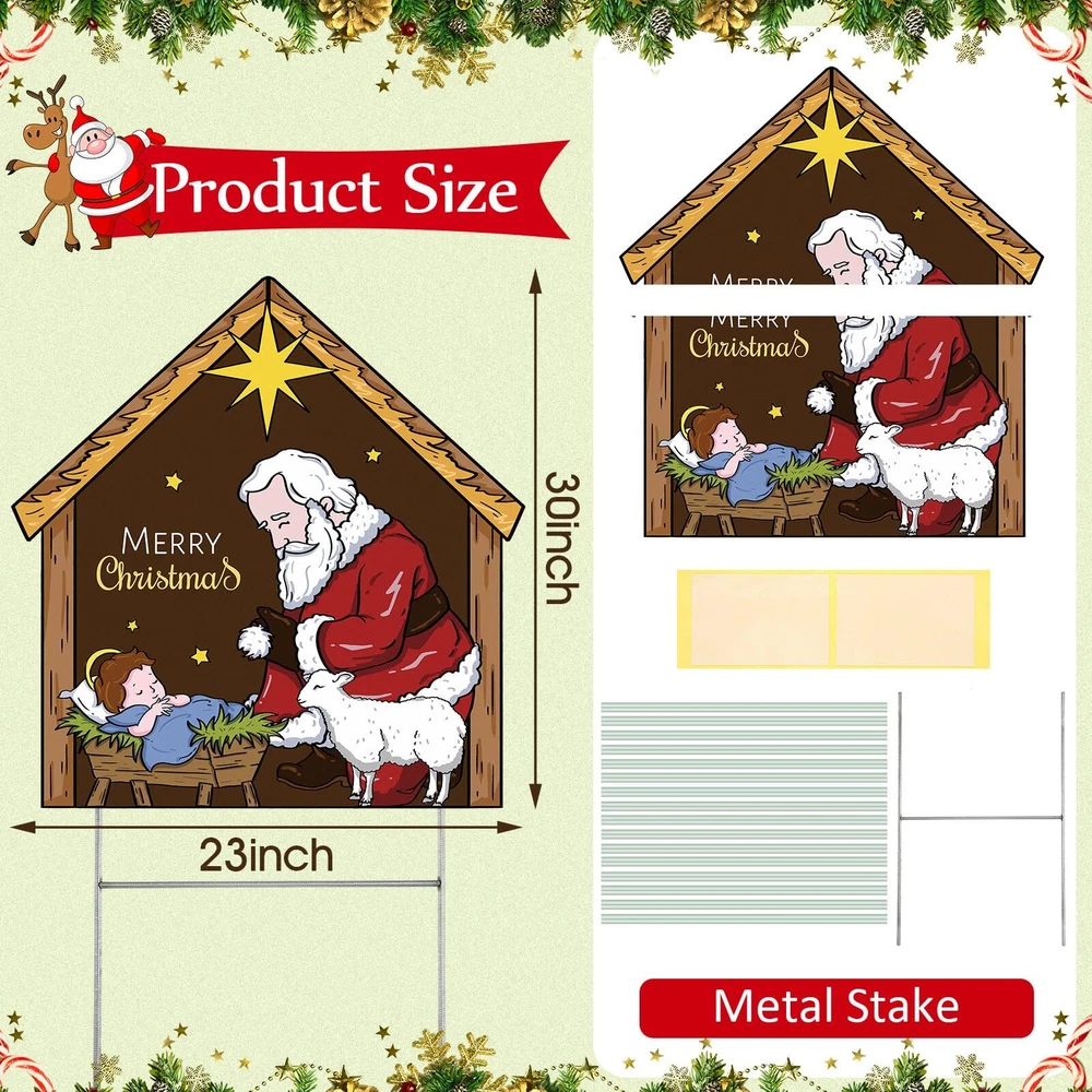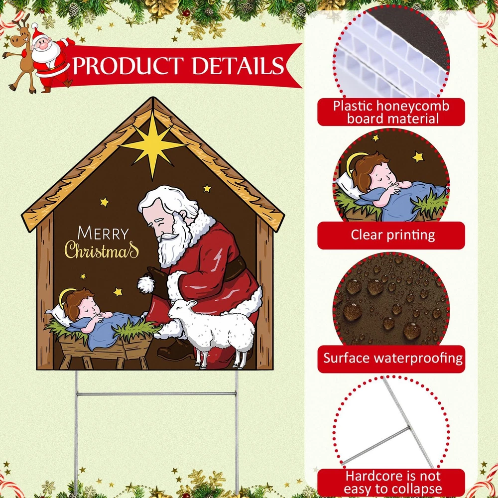 Features: Sporting a warm wooden color, this nativity outdoor decor can blend with any outdoor decor style. The rustic charm of the wood look enhances the aesthetics of your nativity outdoor decor, making it all the more appealing. Our nativity lawn decorations for Christmas brings a fresh vibe to your nativity lawn decorations for Christmas. Its refreshing depiction of Santa honors the spiritual essence of the holiday, making it an attention grabbing addition to your outdoor Christmas decorations. Specifications: Material: Plastic honeycomb panel Color: wooden Size: 23 x 30 Inch/60 x 80 cm Package includes: 1 x Kneeling Santa yard sign Notes: Manual measurement, please allow slight errors on size. The color may exist a slight difference due to different screen displays. Christmas Theme decor: welcome the holidays with our Kneeling Santa Yard Sign; With a notable nativity scene and Santa in a humble position of worship, this expressive yard sign is designed to add a festive cheer to your Christmas decorations and enhance a blissful atmosphere Size for Visibility: sized at approximately 23 x 30 inches (60 x 80 cm), our nativity Santa yard sign is proportioned just right to be easily visible from a distance; It creates an attractive display, capturing the attention of guests and neighbors, allowing your home to stand out during the holiday season Long Lasting: this nativity scene yard sign is made from reliable plastic honeycomb panels, making it strong, reusable, and waterproof; The iron poles are sturdy and resistant to the wind, ensuring it lasts for many Christmases to come; It doesn't break or fade easily, giving you the assurance of its durability Easy Assembly: the nativity yard sign is easy to set up; Simply insert the pole into the attached deck, and then place it into the ground for enhanced stability; With this nativity yard sign, you can bid adieu to worries about its sturdiness during windy days Versatile Christmas Decor: featuring a classic Santa kneeling posture, the Christmas yard decorations outdoor adds a strong festive ambiance; It can be decorated courtyards, lawns, gardens, sidewalks, walkways, front doors, entrances, and porches, expanding your Christmas yard decorations outdoor