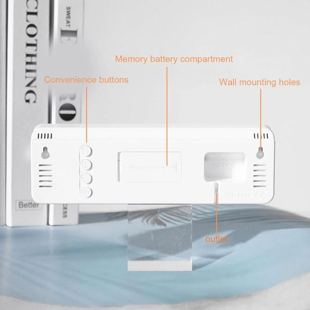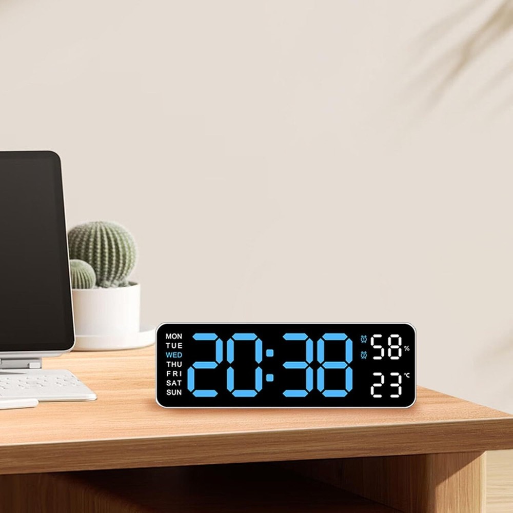 Description: Multiple time display methods: The multifunctional electronic clock can display various information such as time, date, week, temperature, etc., making it convenient for users to understand the current time and date, and can switch display according to their needs. Multiple alarm settings: The electronic clock can set multiple alarms, and different alarm reminder functions can be set according to the user's needs and schedule to ensure that the user wakes up on time or engages in other activities. Brightness adjustment function: Multi functional electronic clocks are usually equipped with brightness adjustment function, which can automatically adjust the brightness of the display screen according to changes in ambient light, ensuring clear visibility under different lighting conditions, and also avoiding the impact of high or low brightness on users. Battery backup function: Multifunctional electronic clocks usually have a battery backup function, which can maintain normal operation even in the event of a power outage or lack of power, ensuring the accuracy of time and the normal use of alarm functions. Accurate time display: Multi functional electronic clocks usually use high-precision clock chips, which can provide accurate time display and avoid the impact of time errors on users. Specification: Color: White Shell Blue Light Display Type: Digital Style: Modern Size: 22.8*3.5*7.5cm Power Source: Corded Electric Battery: 2x AAA Battery(not include) Shape: Rectangular Indoor/Outdoor Usage: Indoor Theme: Plain Frame Material: Plastic Are Batteries Included: No Mounting Type: Wall Mount Alarm Clock: Yes Watch Movement: Automatic Operation Mode: Electrical Clock Form: Multi Display