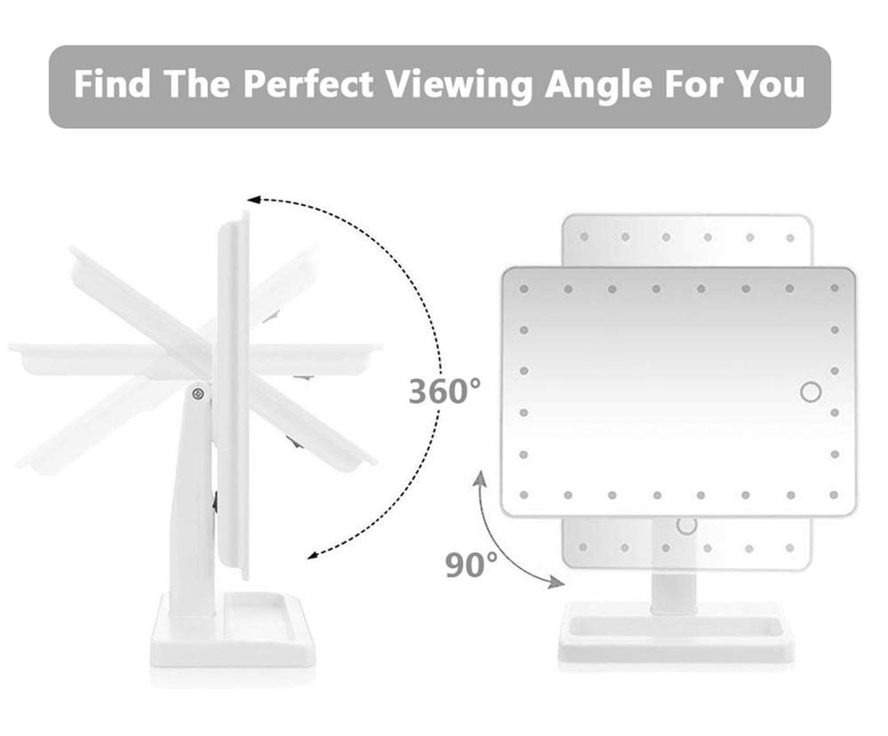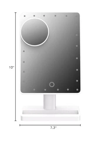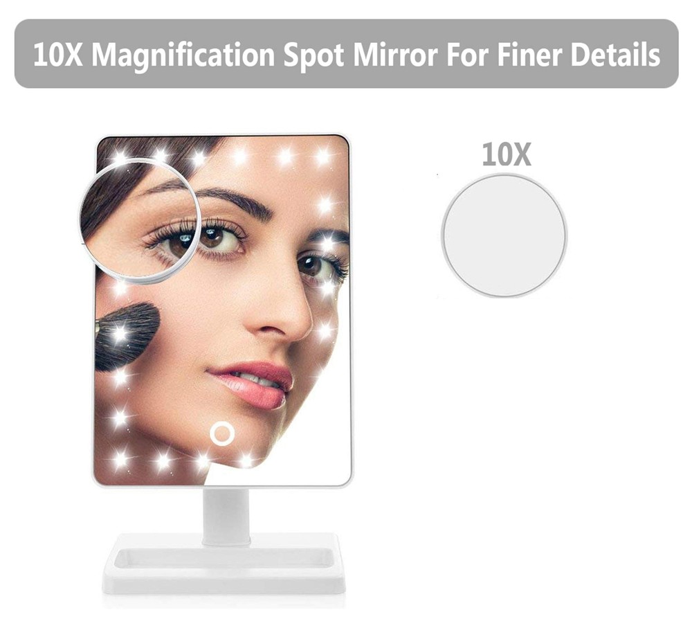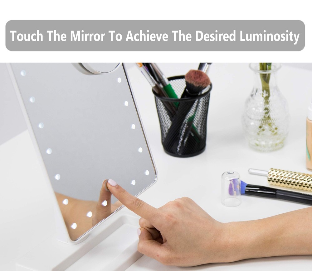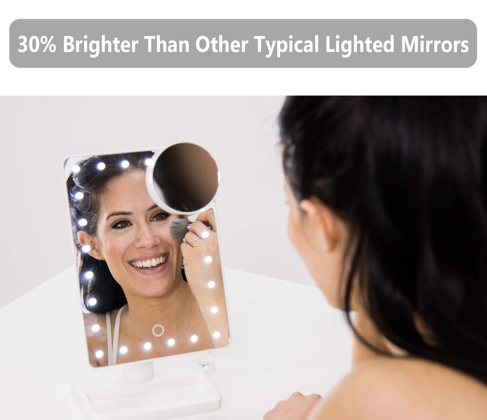 LED Illuminated Mirror 30% Brighter Than Others - The only lighted makeup mirror featuring 24 LEDs produces 30% brighter lights than 2nd Gen. 5, 000-6, 000 Kelvin white light closely simulates natural sunlight, providing color-correct lighting for your makeup. Perfect Size for Dressing Desk - With a clear and large 12" screen, the 3rd Gen light up mirror is 20% larger than competing make up mirrors equipped with a 10" screen, allowing you to get your entire face in view at once. Makeup Mirror with Lights of Low Consumption - Thanks to the low consumption LED chips, 3rd Gen countertop mirror can last up to 2-3 weeks for daily use operated with 4 brand new AA batteries, up to 10% more energy efficient (batteries NOT included). Vanity Mirror with Light and Smart Touch Control - A smart touch dimmer switch with memory function is located on this tabletop mirror to turn lights on/off and adjust brightness whenever you want, and the lights will always remain on your desired brightness when it is switched on. Lighted Vanity Mirror with Detachable 10X Magnifying Mirror - A useful 3. 5" 10x magnified detail mirror with suction cups can help you see the details of eyeliner, mascara, eyebrows, and the grooming of unwanted hairs; it will help ensure you're always ready for your close-up.