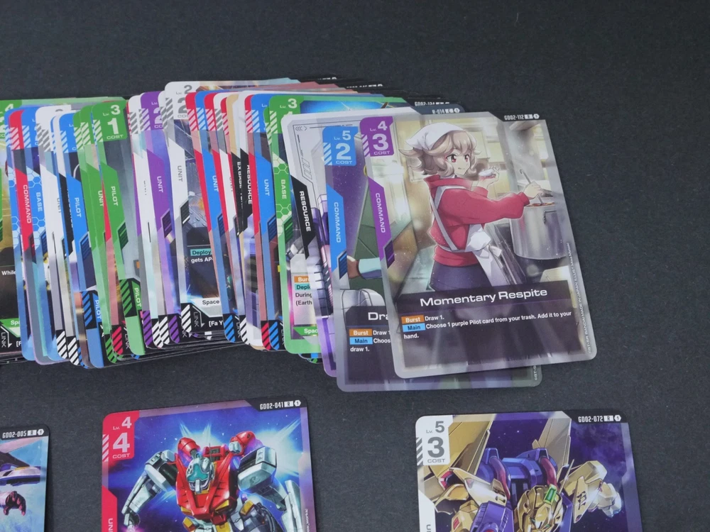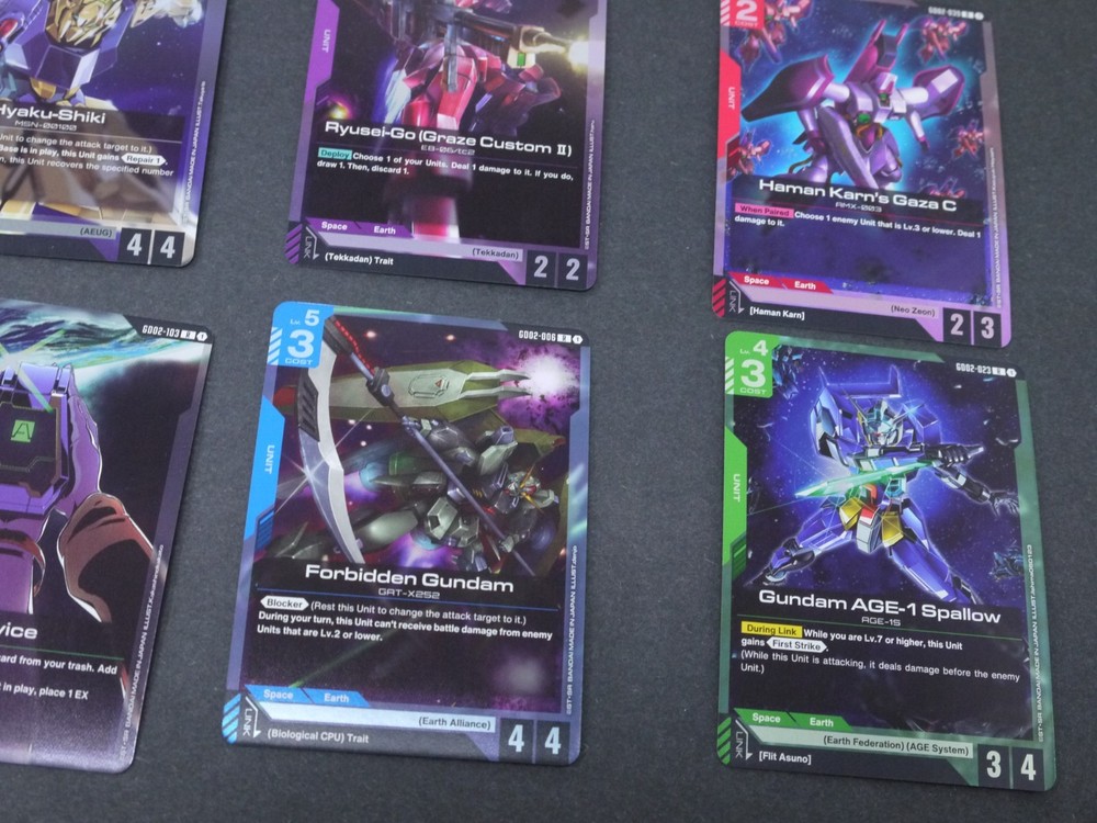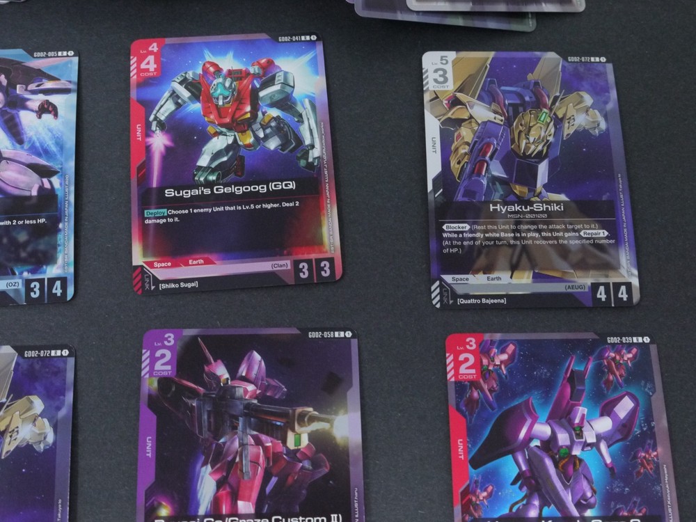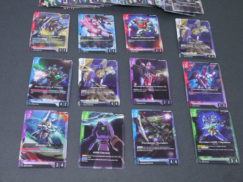 This product is a large lot of 114 Gundam TCG cards in English, featuring a variety of holos and standard-sized cards. Manufactured by Bandai, these cards are related to the Gundam War TCG game. The set includes a mix of collectible cards from the Gundam series, making it a valuable addition to any collector's inventory. Perfect for fans of Gundam and collectors of trading card games, this lot offers a diverse selection of cards from the United States.