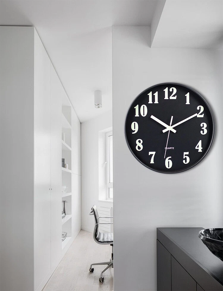 Feature: 【Glow in The Dark】The big clock numbers and hands which have night light function. It asks for absorbing enough light energy during the day. At night, it is released in a fluorescent manner, so you can see the light at night or in the dark.Tips: The product might be run out of energy during a long day in the box, so I advise to let the wall clock absorb light energy (sunshine or fluorescent lamp) more than 4 hour before installation when receive the products. 【No-Ticking Slient sweep Movement】The premium quality of the precise quartz movement guarantee accurate time, also the silent sweep ensures a good study and work environment.Non ticking super silent,you no longer have to worry about its annoying clicking noises at night. 【Easy to Read】Glowing clock hands and large 3D numbers makes it easier to read at night, which makes reading the time easy from any angle,especially suitable for the elderly and people with poor eyesight. 【Simple to Install】Hooks included allows easy installation, just put a small nail through the plastic hook and it securely hangs on your wall within a few seconds.(1 hook included).Powered by one AA battery (not included) please use normal carbon battery for the clock. 【Perfect Wall Decoration】This wall clock suitable for living room, bedroom, kitchen, office, study, garage, meeting room, class room, church and any other places which needs a silent environment. Detail: Color : Black frame Material: Plastic frame, Glass lens, Aluminum clock hands Dimension: 12 x 12 x 1.57 in Weight: 350g Style: Modern / Classic Power Supply:1 x AA 1.5V Battery (Not included) Package Include: 1* Clock without battery