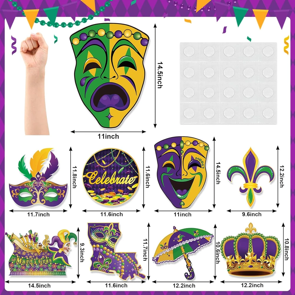 Item model number: ZH-Mardi Gras Cutouts-9Pcs Type: Does not apply Product Dimensions: 14.6"L x 14.6"W Number of Pieces: 9 Country of Origin: China Occasion: Mardi Gras Brand: Does not apply Size: Large Item Weight: 5.3 ounces Pattern: Mardi Gras Material: Paper Color: Purple/Yellow/Green