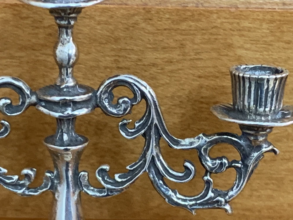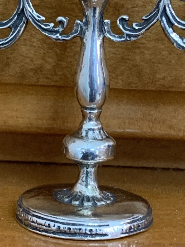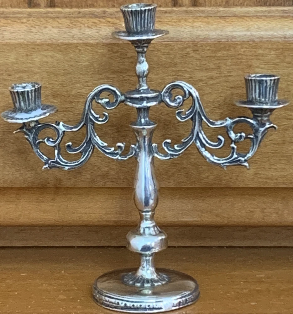 Don't have my curio anymore, selling off my silver miniature collection. Here is a second three branch candleabra, 3" tall by 3" wide, marked 800. Lovely piece to add to your collection. See the other miniatures I'm selling. I offer free shipping to USA address, take advantage and save! Check out my other items ! You might find something you can't be without! From a smoke-free and pet-free home!